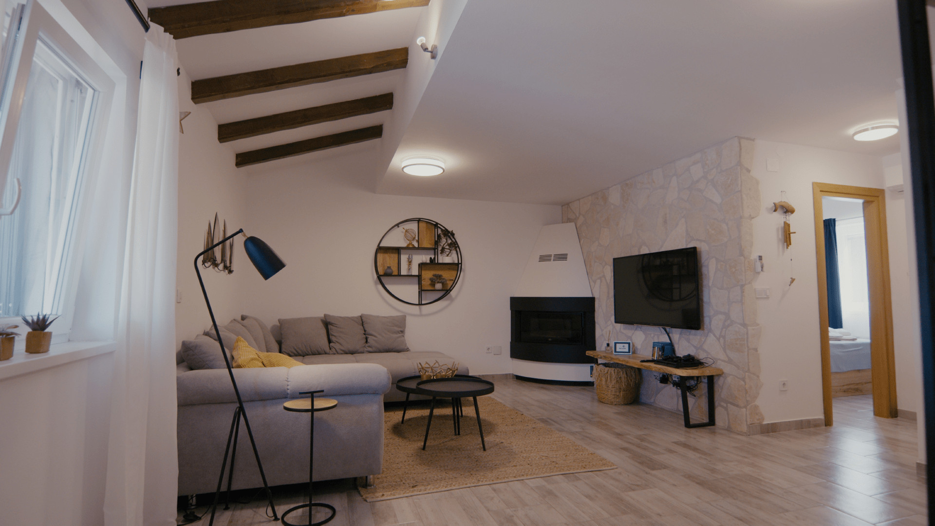 The interior of the villa is modernly furnished and offers everything you need for a pleasant holiday. On the ground floor of the villa there is a cozy living room, a fully equipped and modern kitchen with a dining area. On the same floor you will find a bedroom with an en-suite bathroom and another bedroom with a separate bathroom. On the upper floor there are 2 more comfortable bedrooms with their own bathrooms.
