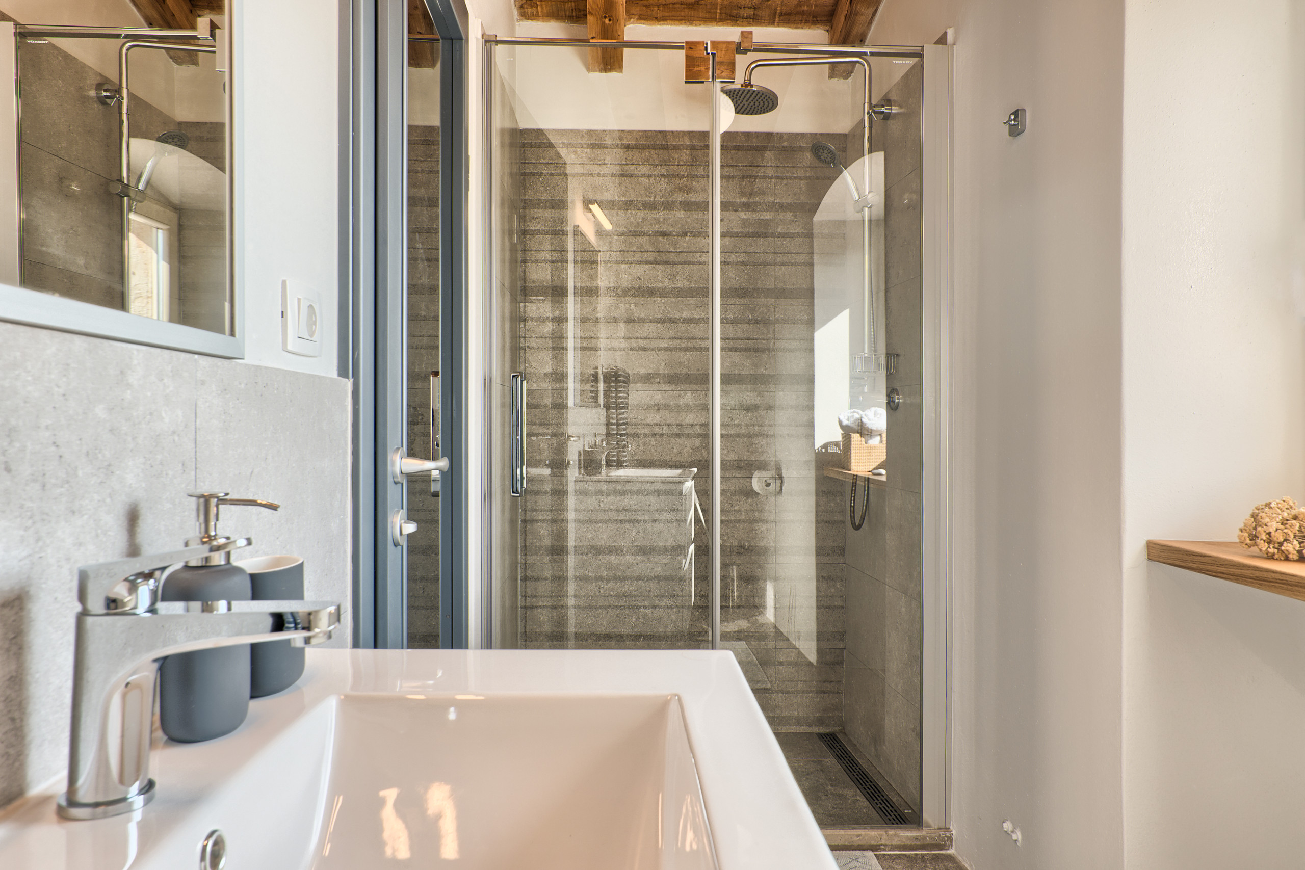 A dedicated BBQ terrace makes shared meals outdoors simple and enjoyable. Outside, private outdoor areas are designed for relaxed stays. The saltwater swimming pool is ideal for daily use, with sun loungers and shaded areas around it, while the garden feels open, calm and natural, creating a pleasant outdoor environment. Pool heating is available on request, making the house comfortable beyond the peak summer season.