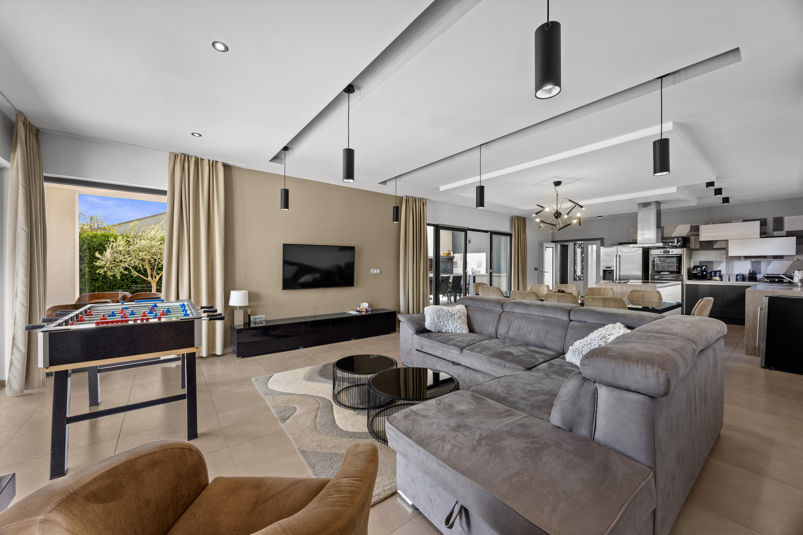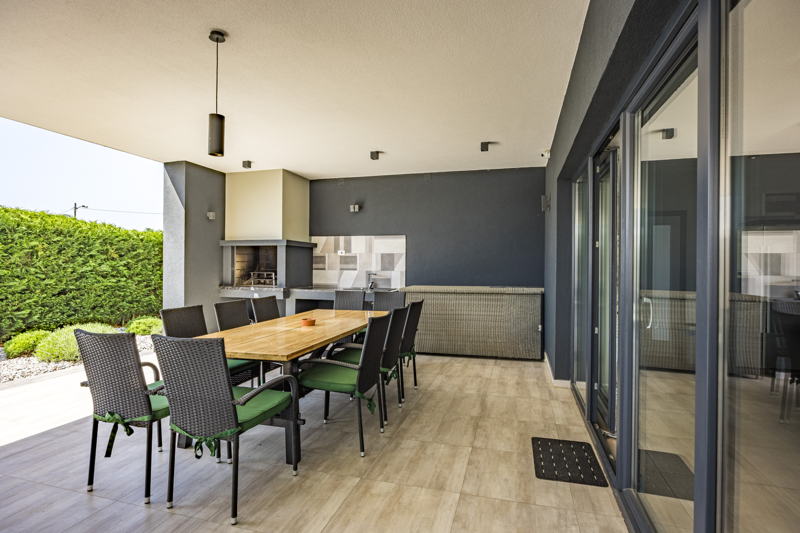 A covered dining area offers the opportunity to dine outdoors and enjoy cozy evenings with friends and family. The villa also features various entertainment options, including a pool table and table football, as well as a comfortable lounge area. Outdoors, guests can also enjoy a private tennis court and a basketball hoop.