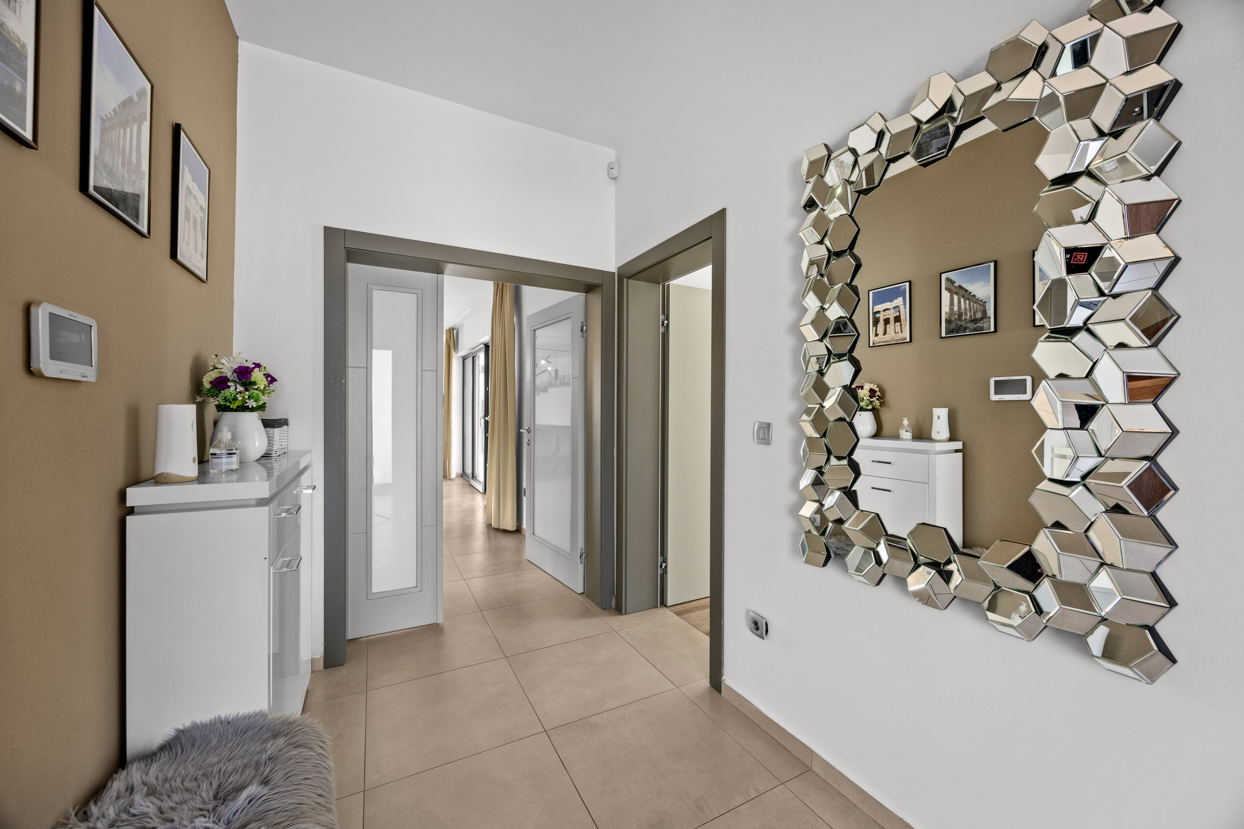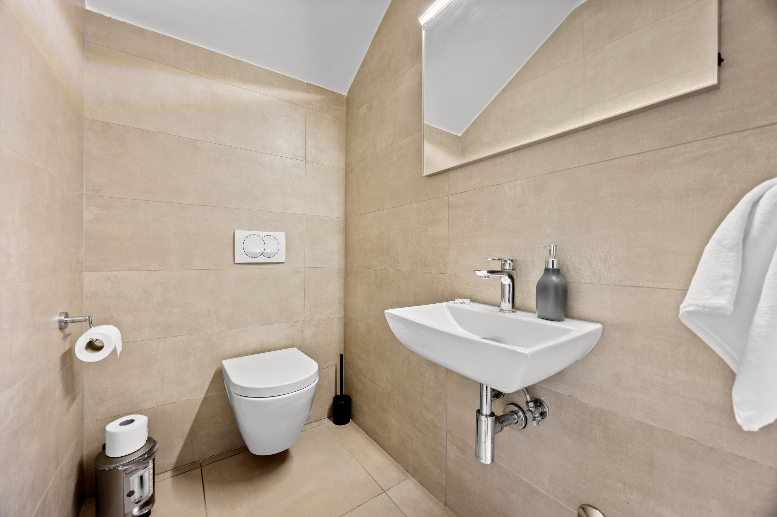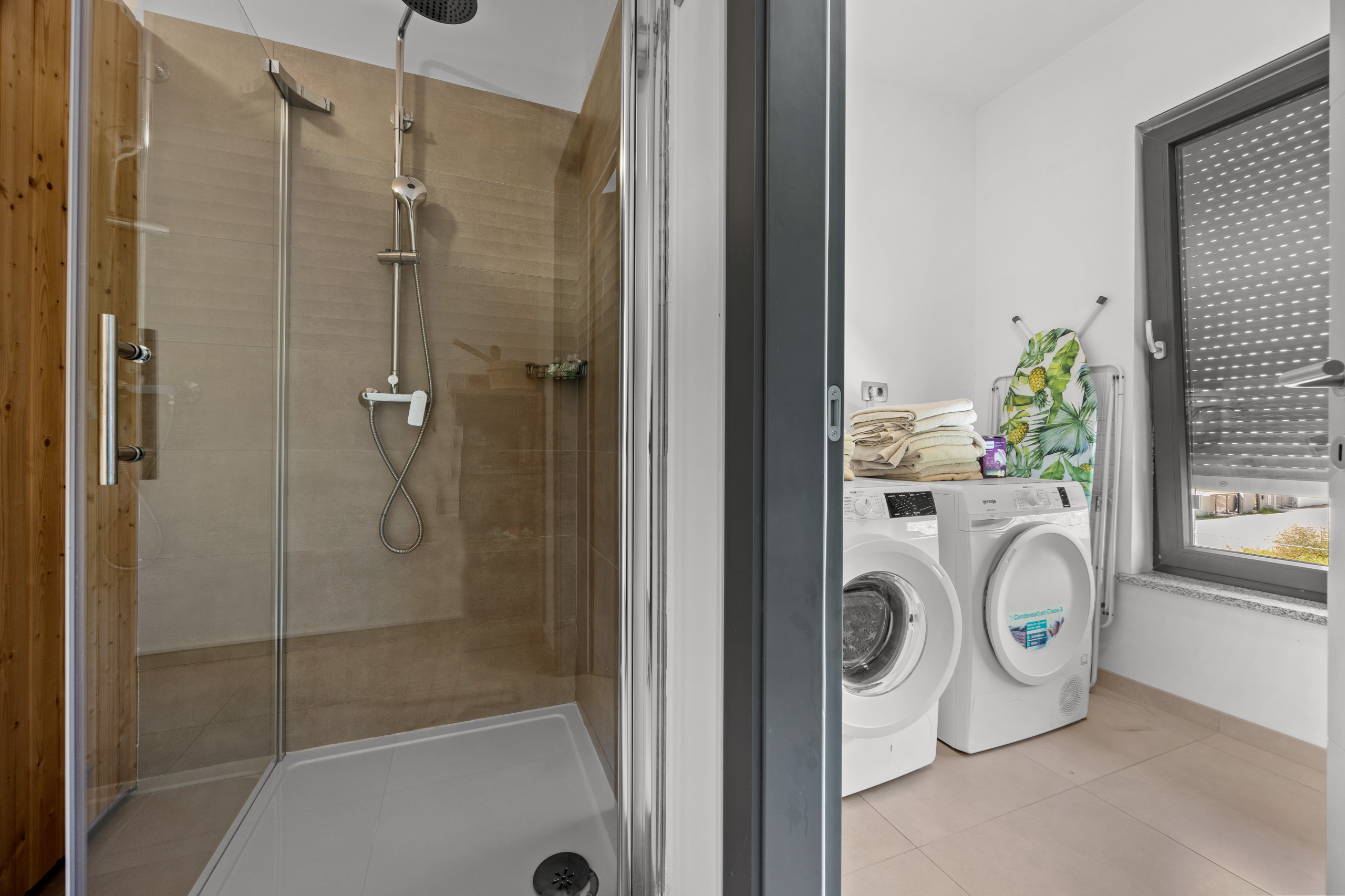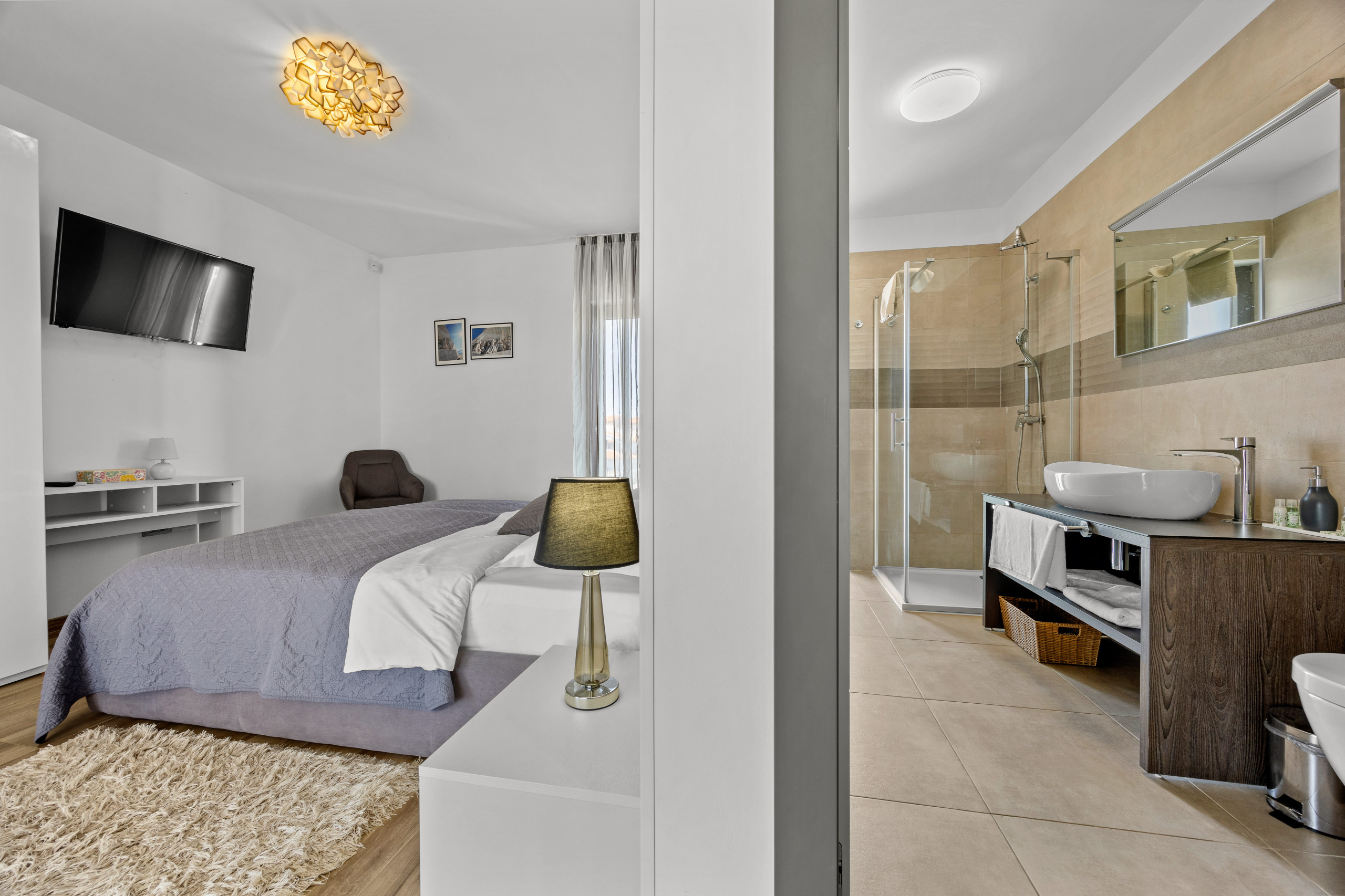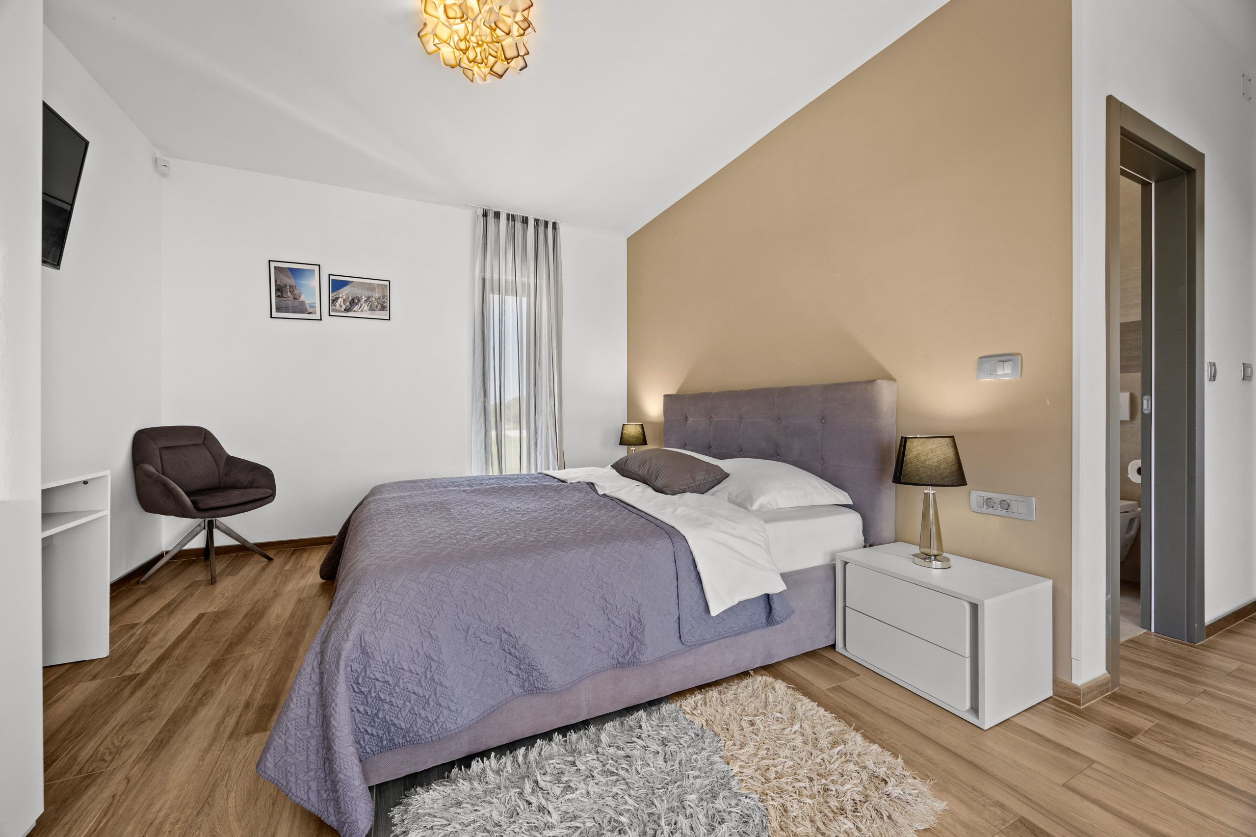 Three spacious bedrooms, all with private bathrooms, are located on the first floor, where there is also a Finnish sauna. All bedrooms are equipped with a double bed, TV, and air conditioning.