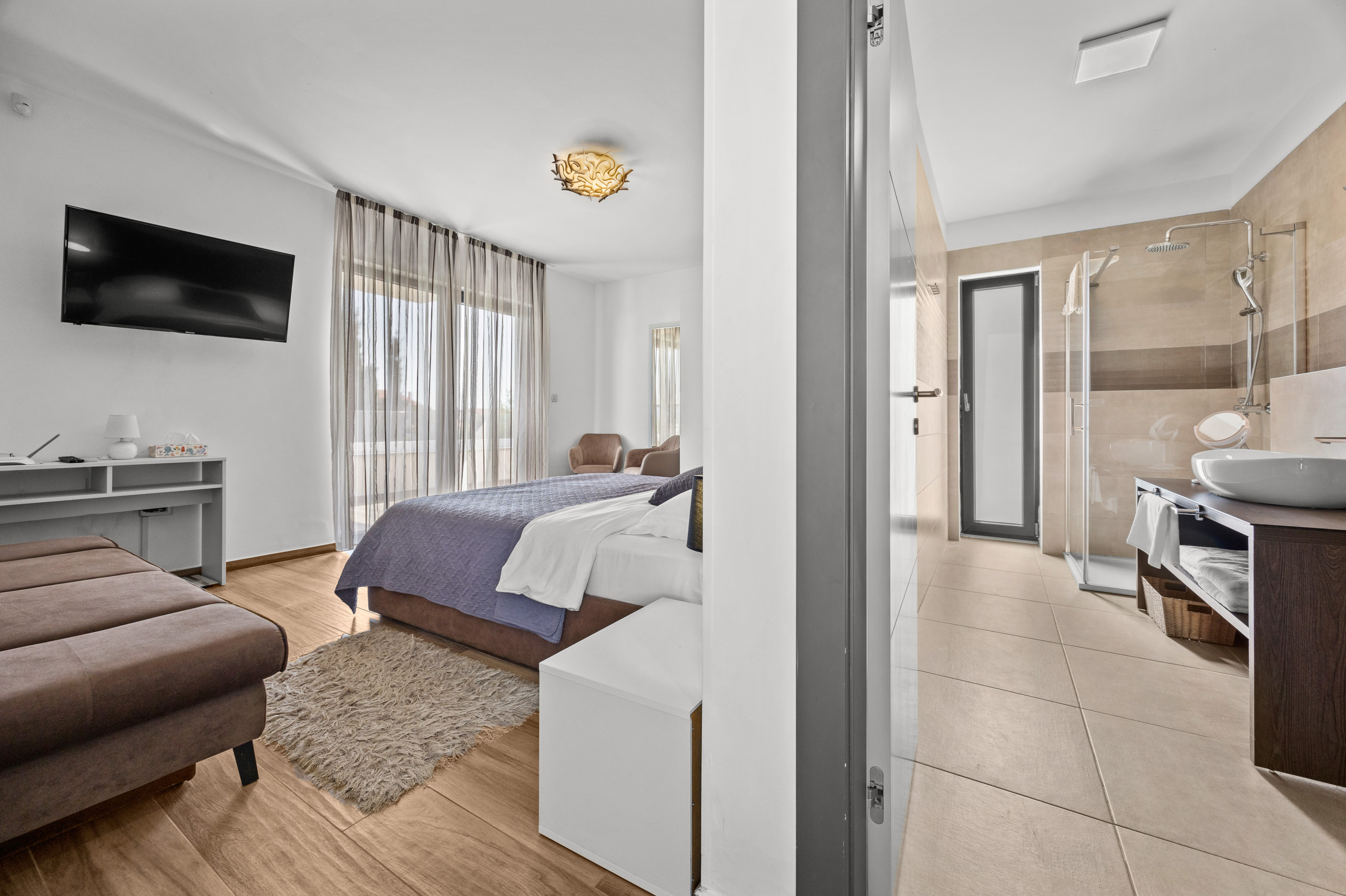 Villa Casa L can host up to 10 people, making it ideal for family vacations or groups of friends. It offers 4 bedrooms—two with double beds and two with double single beds. There is also a comfortable double sofa bed, allowing for 2 extra guests (the extra 2 guests are available for additional costs of 30 EUR per night / per person). The villa has 4 bathrooms, so everyone has space.