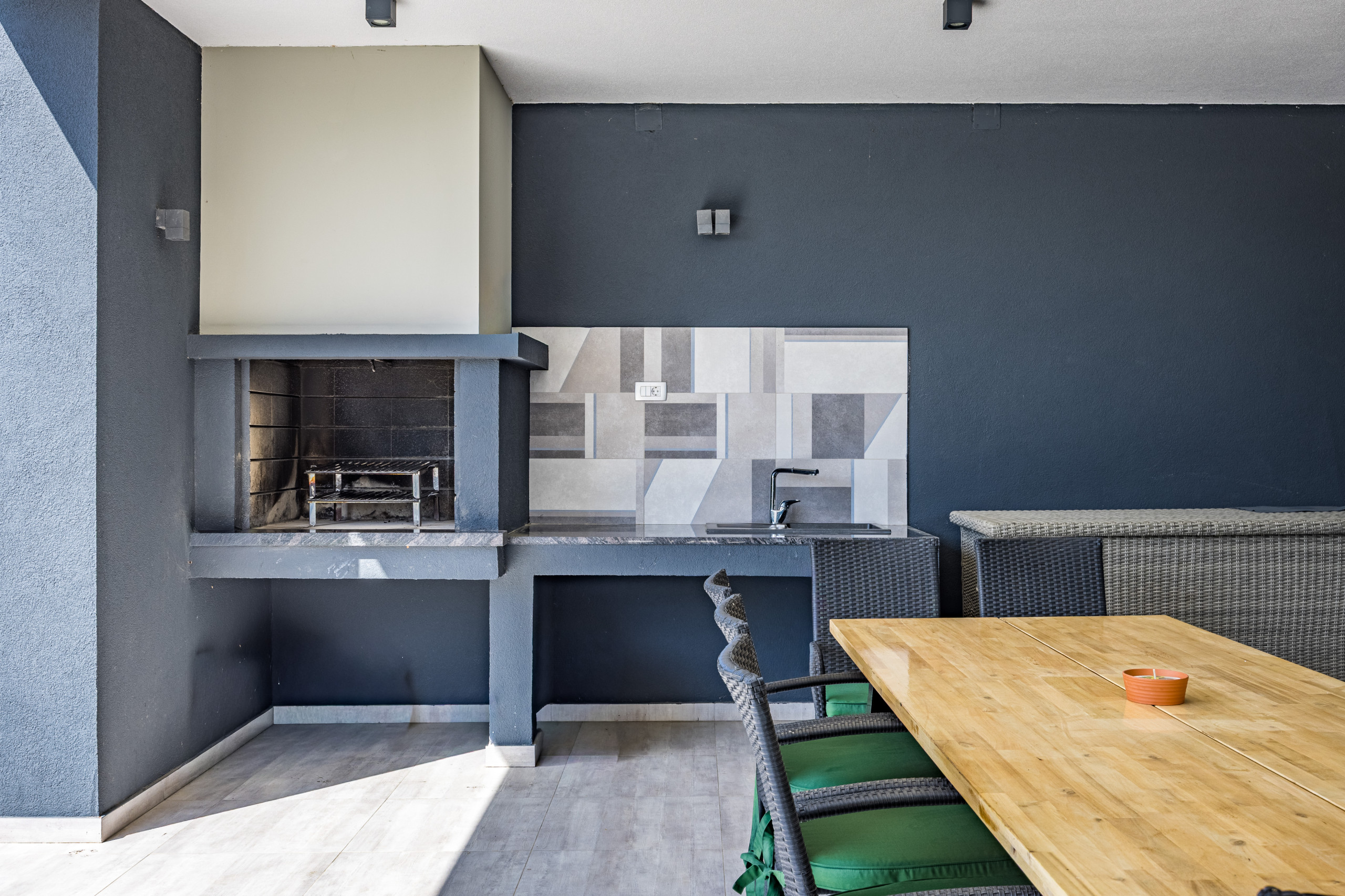 On the terrace there is a charcoal grill and a covered dining area.