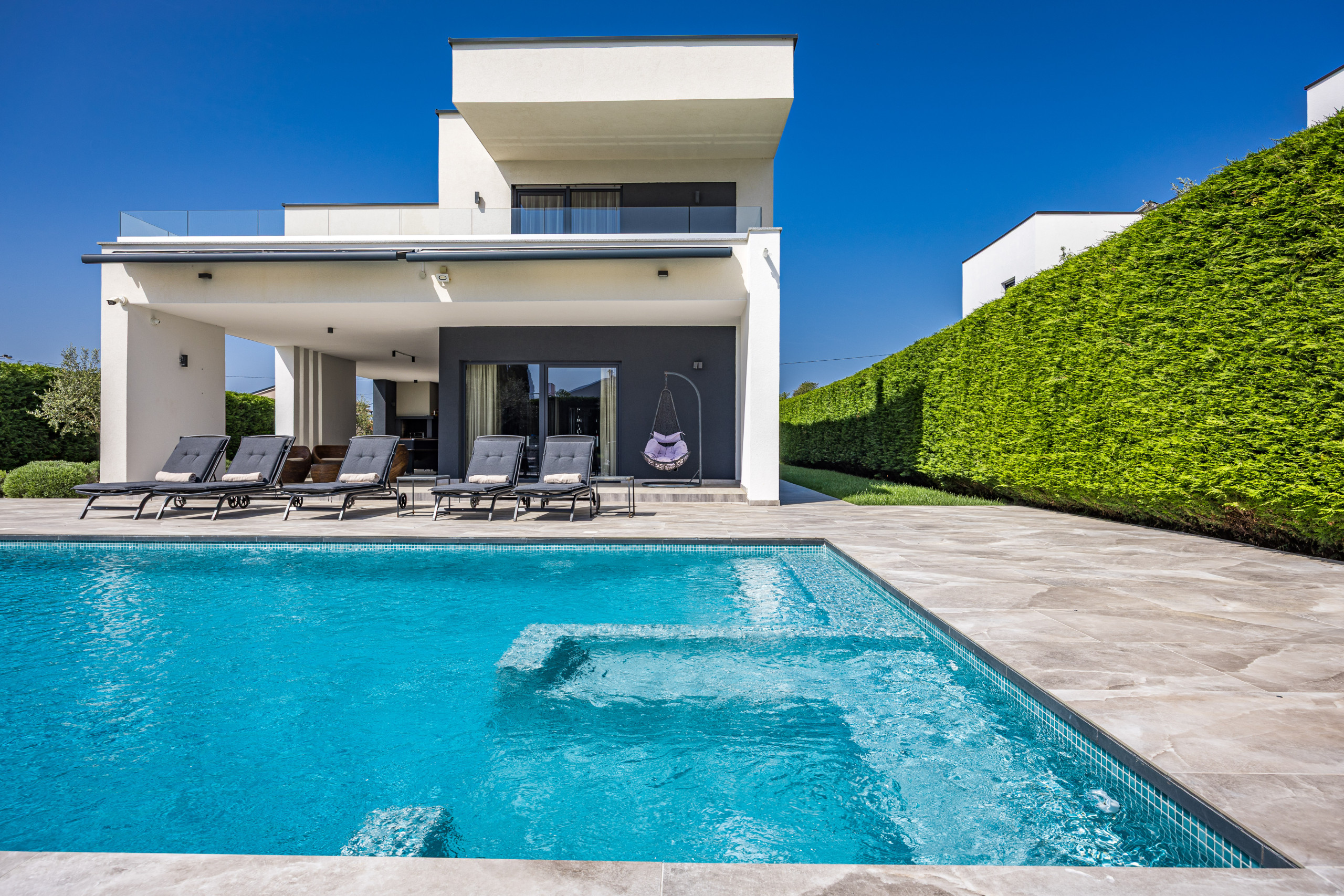 This unique luxury villa is located in Pula and is only a few minutes away from the beach. It can enchant you with its beautiful, extravagant design and dreamlike outdoor area, inviting you to spend pleasant hours by the pool. This stunning 250 square meter villa offers a stylish and modern vacation.