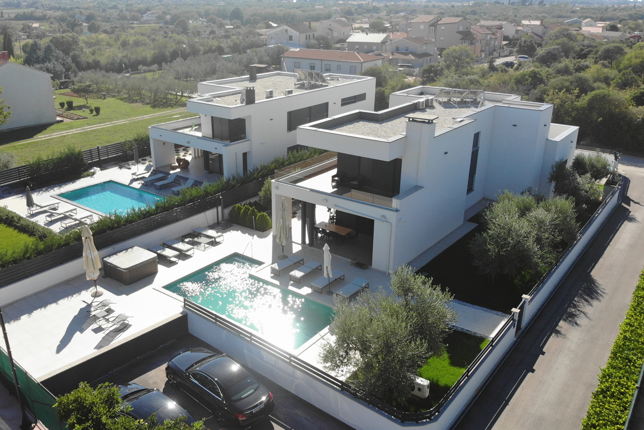 This unique luxury villa is located in Pula and is only a few minutes away from the beach. It can enchant you with its beautiful, extravagant design and dreamlike outdoor area and invite you to spend pleasant hours at the pool. This stunning 410 square meter villa offers a stylish and modern vacation.