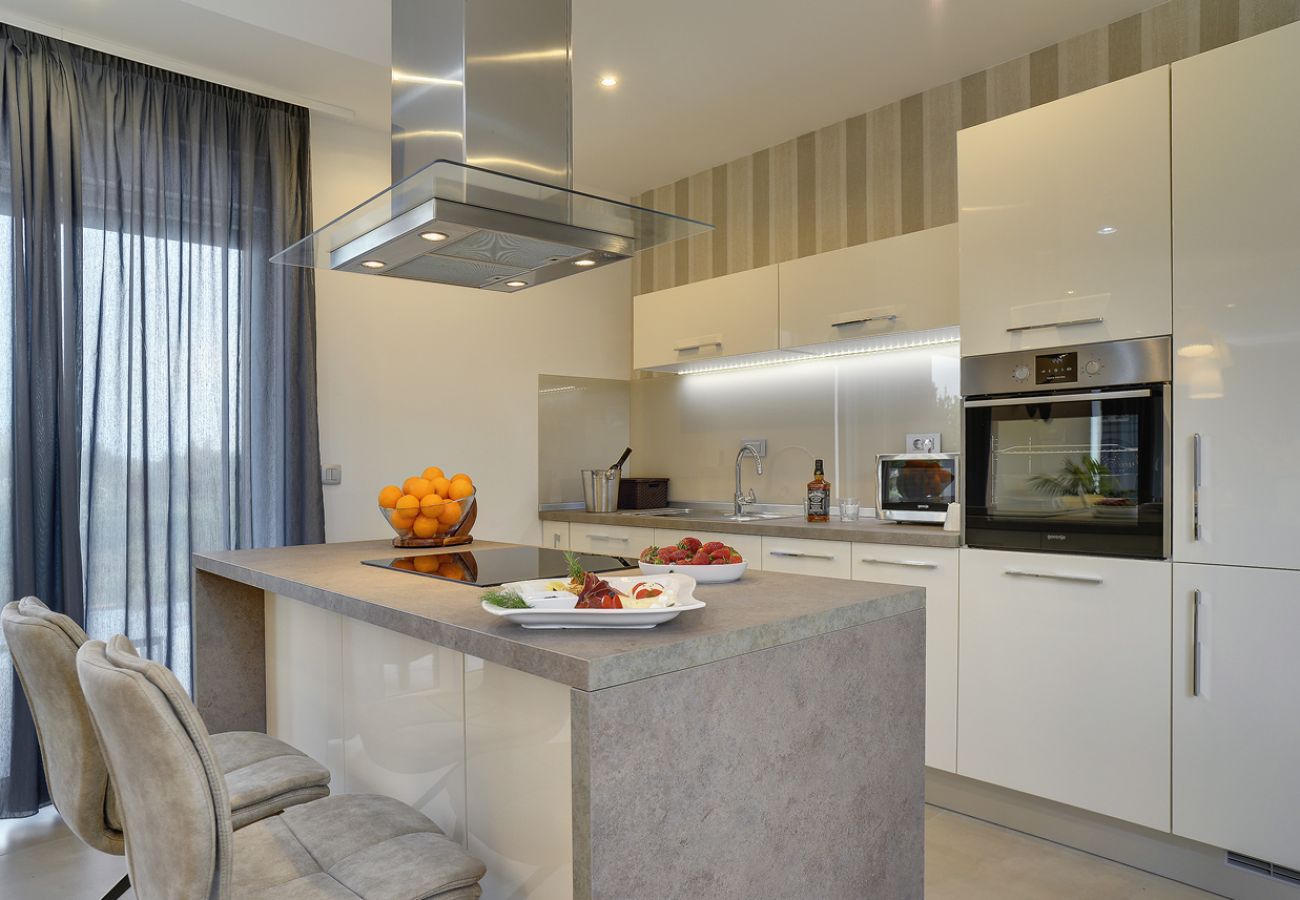 Inside the villa there is an elegant open plan ground floor with a living/dining area and kitchen, a double bedroom with en-suite bathroom and a guest toilet. From here you have direct access to the beautiful pool.