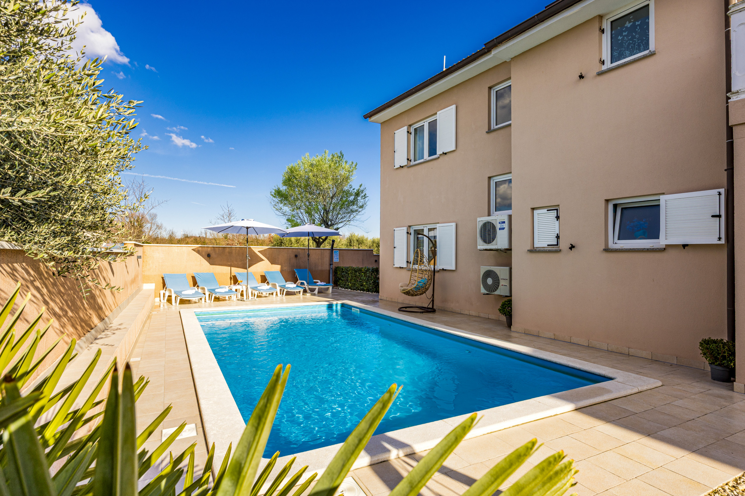 Villa Aria is a ground-floor house in Pula that can sleep up to six people. It has three comfortable bedrooms and is a spacious 100 square meters across a 600 square meter plot. The villa comes with its own private pool, perfect for cooling off during warm days. There are six sunbeds and two sun umbrellas around the pool, offering plenty of space to relax and enjoy the sunshine.