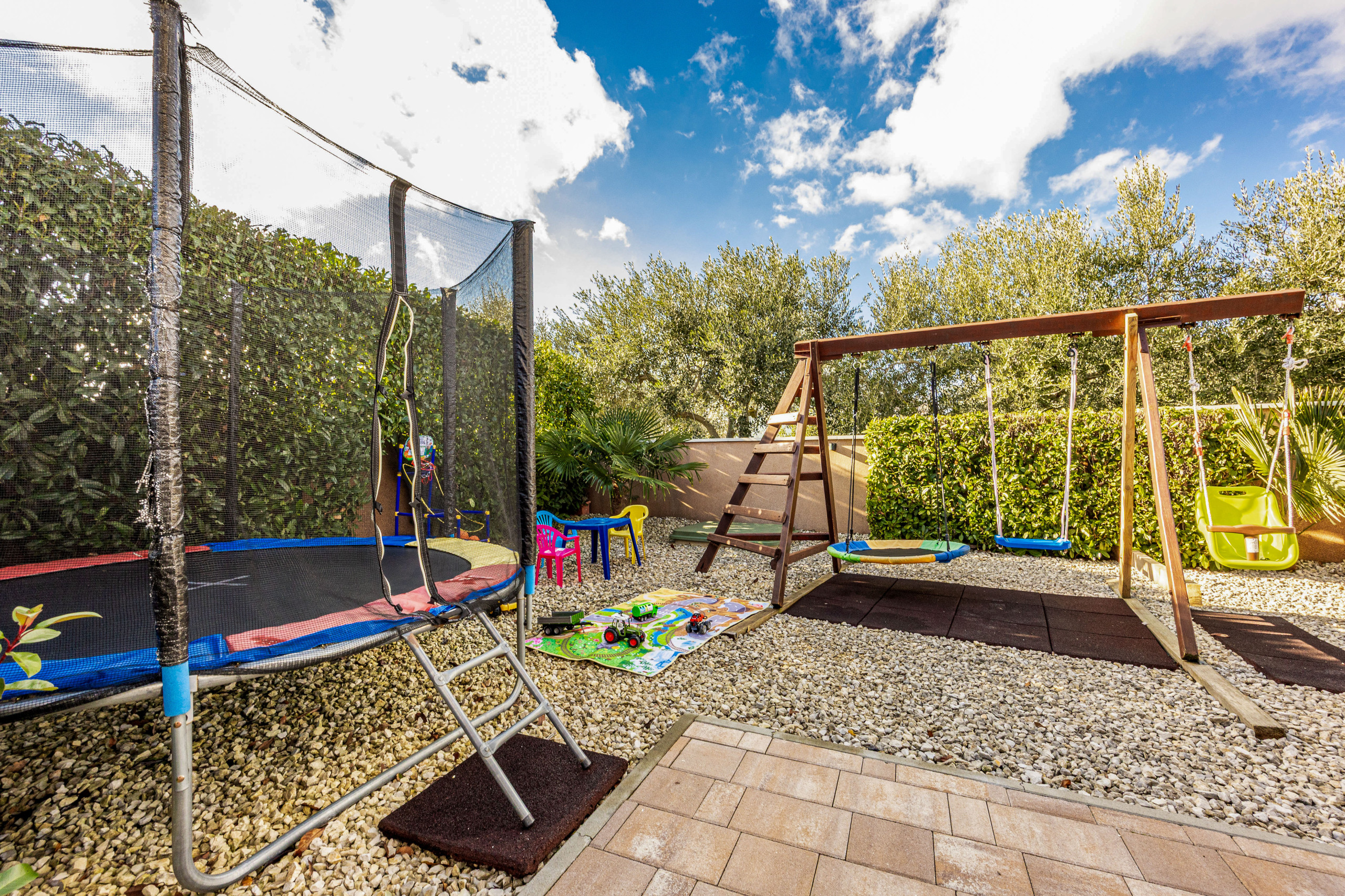 For entertainment and active holidays, the villa offers a private playground, a trampoline, darts, and table football. Five bicycles are provided at the house and are included in the price, allowing guests to explore the surroundings in an active and eco-friendly way.