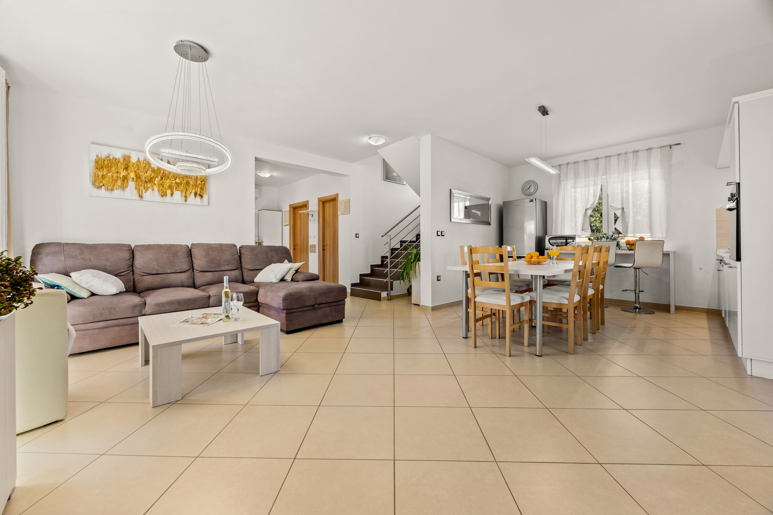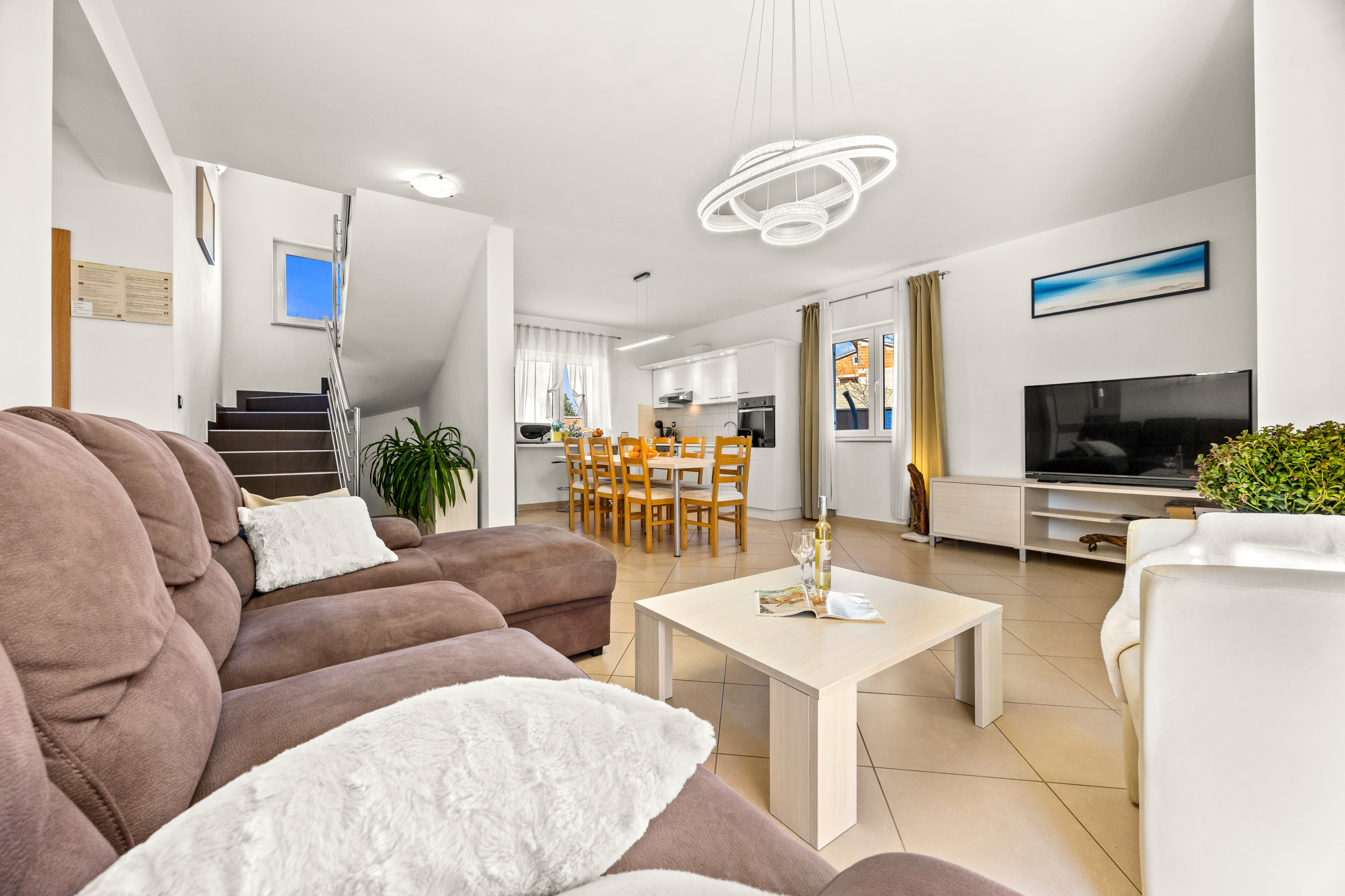Villa Vesna features three comfortable bedrooms, two modern bathrooms, and one additional guest toilet. The interior is tastefully furnished and includes a fully equipped kitchen, a dining area, and a cozy living room for relaxing moments together.