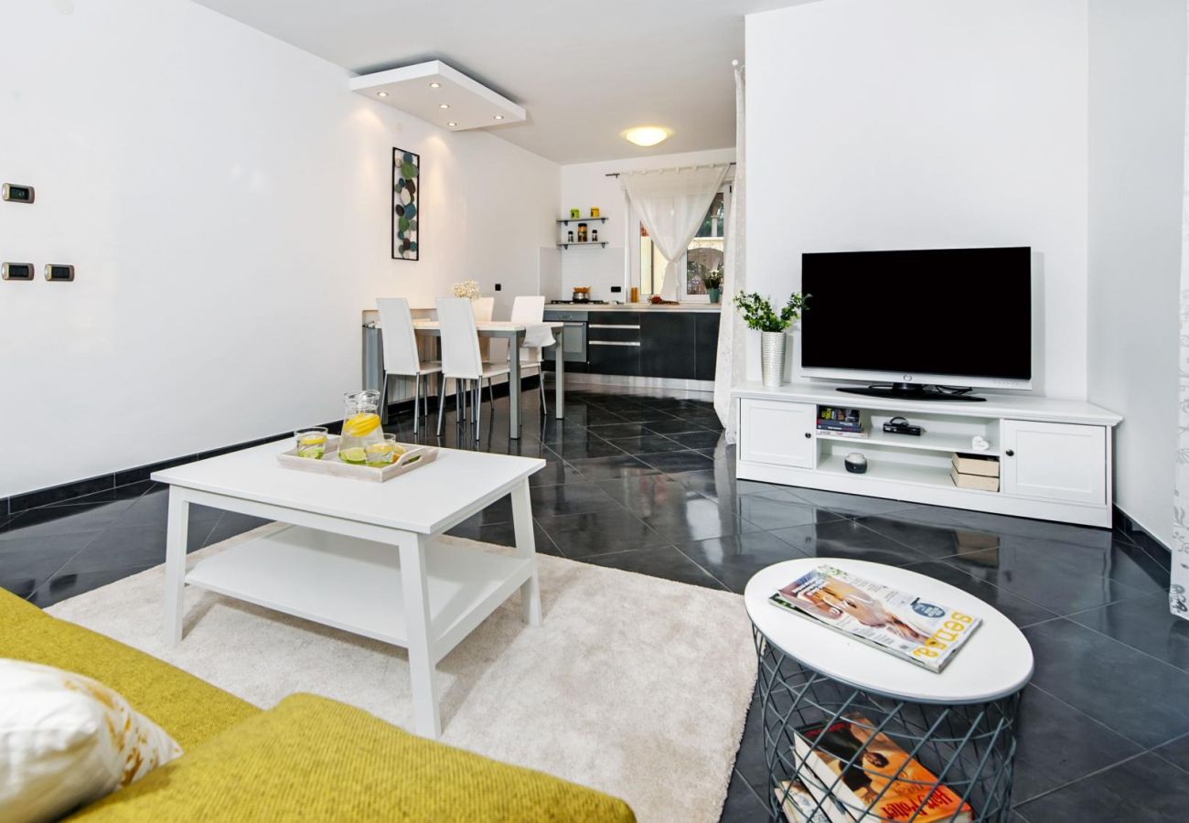 Villa Sky is a beautiful villa that can accommodate up to 10 people. It is perfect for families or groups of friends looking for a relaxing and fun vacation. The villa has 4 cozy bedrooms. Two of the bedrooms have double beds, while the other two have two single beds that can be combined into a double bed. There is also a double sofa bed in the living room for two extra people.