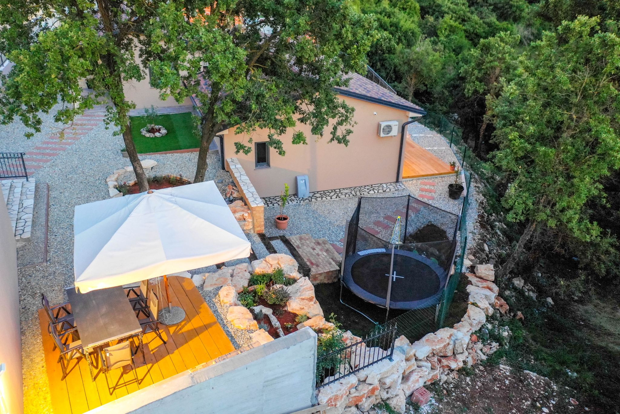 Step outside and enjoy the spacious outdoor dining area that seats 6, complete with a charcoal BBQ—ideal for family meals under the stars. Kids will love the dedicated children’s playground with a trampoline, while adults can relax in the 1000 m² garden, offering plenty of space to unwind in nature.