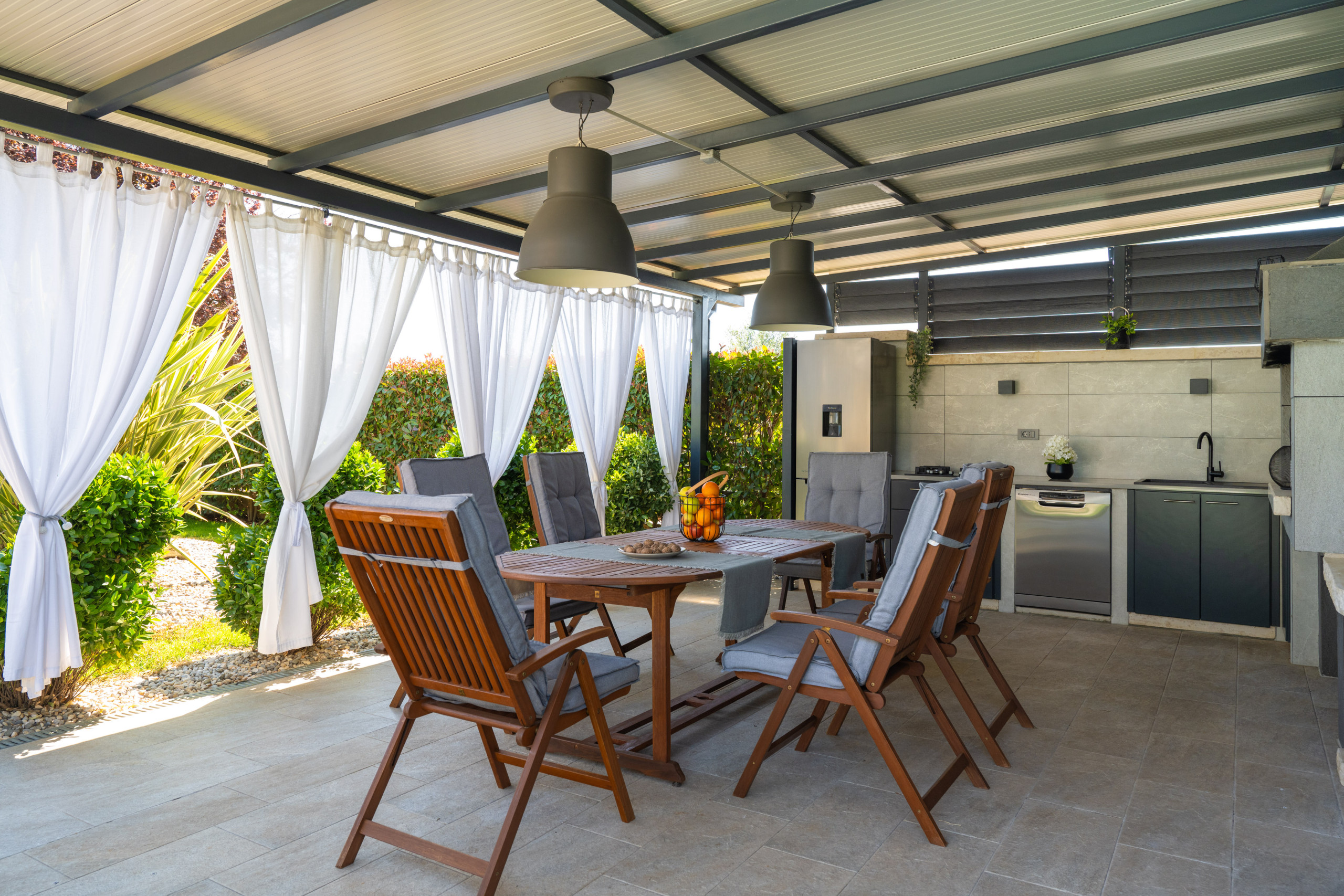 Outdoors, guests can gather in the covered dining area with seating for 10 people, complete with a charcoal barbecue, ideal for long summer meals with friends and family. The fully fenced yard offers privacy and safety, especially for families with children. A table tennis setup adds a fun activity for both kids and adults, ensuring entertainment without ever leaving the property.