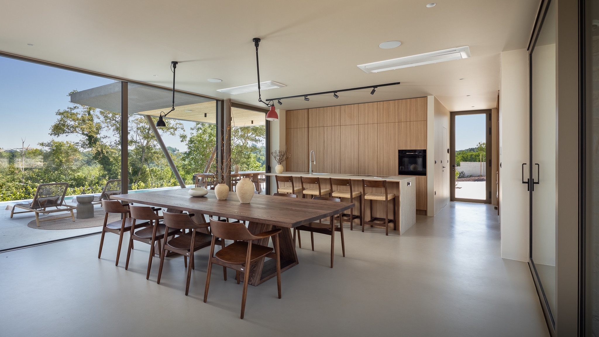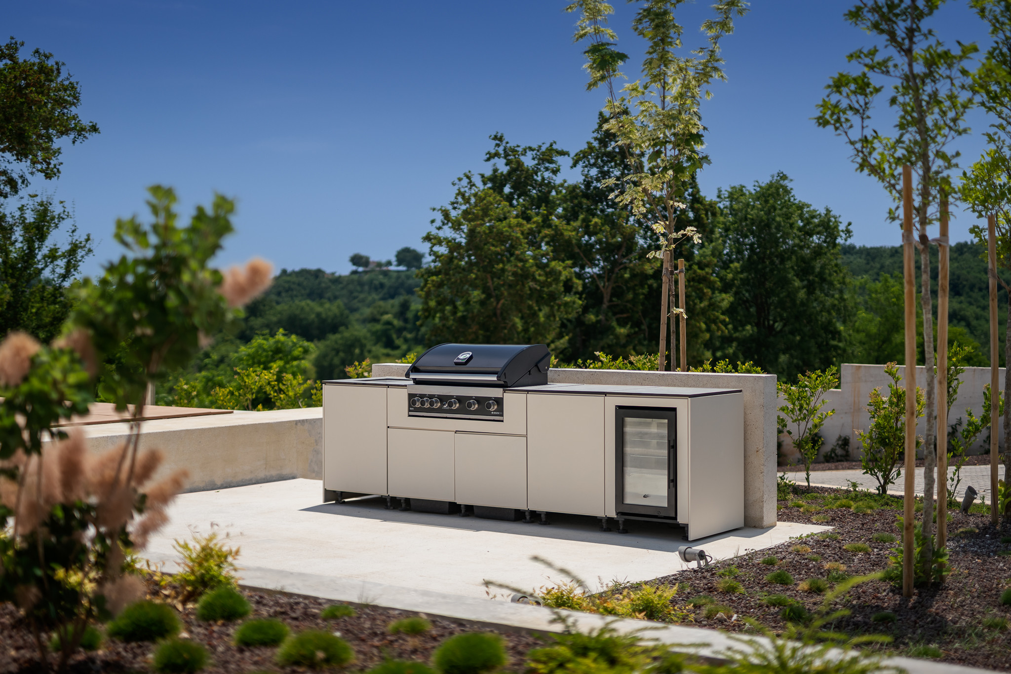 The outdoor area is designed for relaxation and social gatherings. The 54 m² private swimming pool invites guests to cool off and unwind while enjoying the peaceful surroundings. Comfortable sun loungers are available for relaxing by the pool. Next to the pool area, guests will find a fully equipped outdoor kitchen with a gas barbecue and dining area, perfect for long summer evenings and shared meals under the open sky.