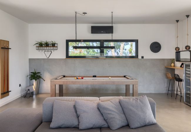 The highlight of the outdoor area is the impressive 56 m² heated saltwater infinity pool, designed for pure relaxation while overlooking the peaceful landscape. Pool heating is available at an additional cost. Guests can unwind on six sun loungers under two sun umbrellas or enjoy outdoor dining at the spacious table next to the gas barbecue grill. For families with children, there is a private playground in the garden, while adults and teenagers can enjoy table tennis in the fresh air.