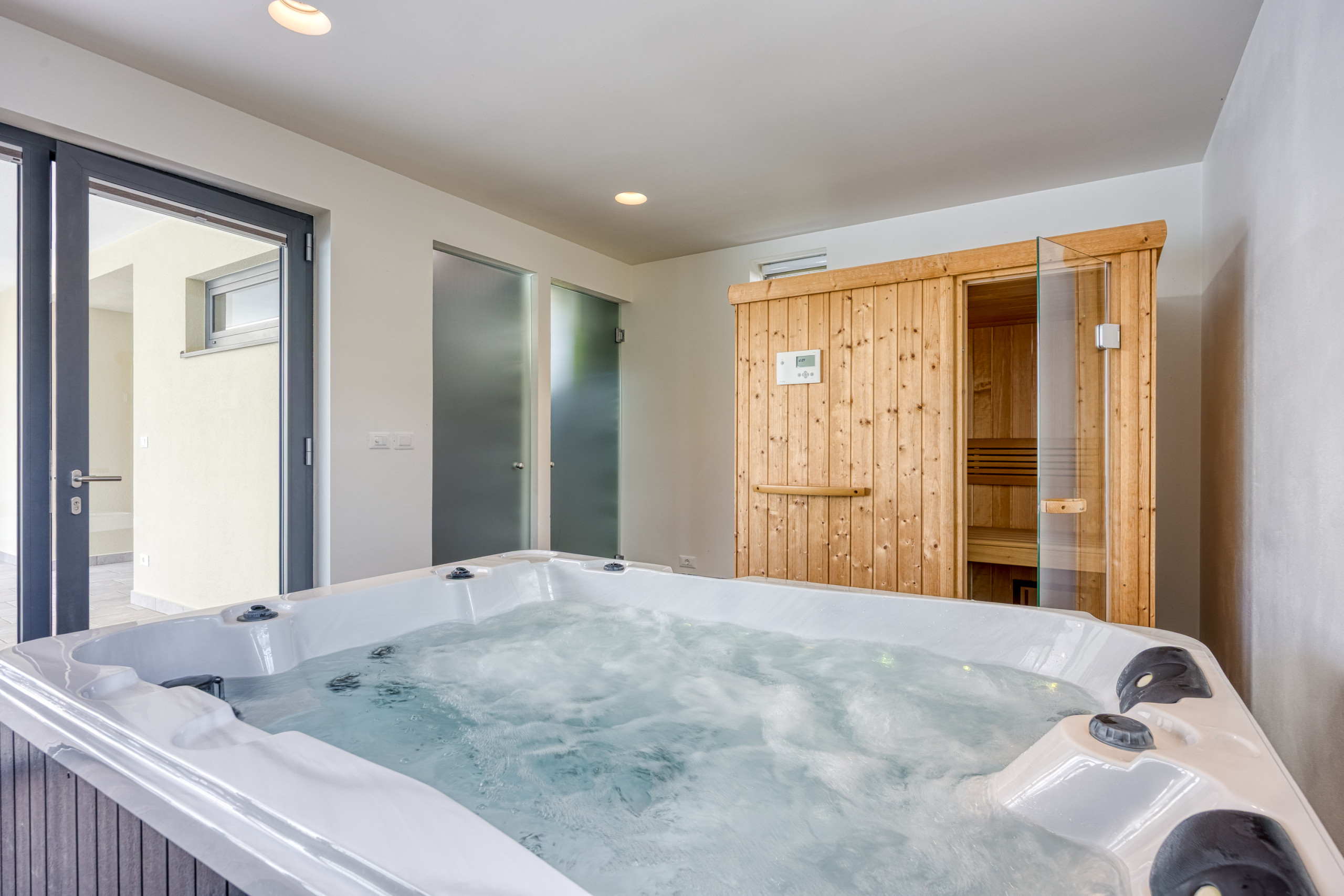 Inside the house you will also find a guest toilet, while the wellness area includes a jacuzzi, fitness equipment, and table football, as well as an additional shower and separate WC.