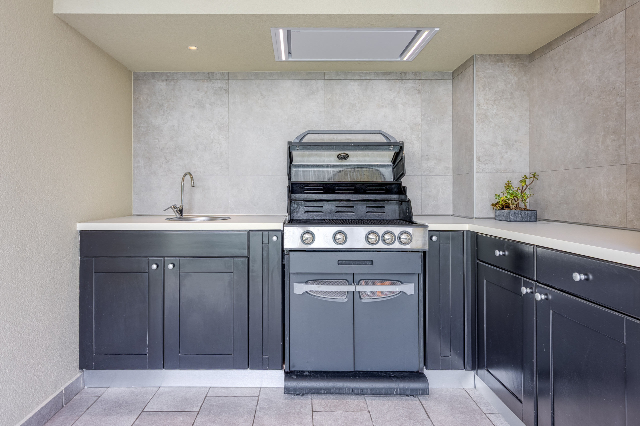 The outdoor area is designed for enjoyment and relaxation. Guests can unwind in the 55 m² private swimming pool, surrounded by 8 sun loungers and 2 sun umbrellas. The outdoor kitchen with gas grill and spacious dining table is ideal for preparing and enjoying meals together in the fresh air.