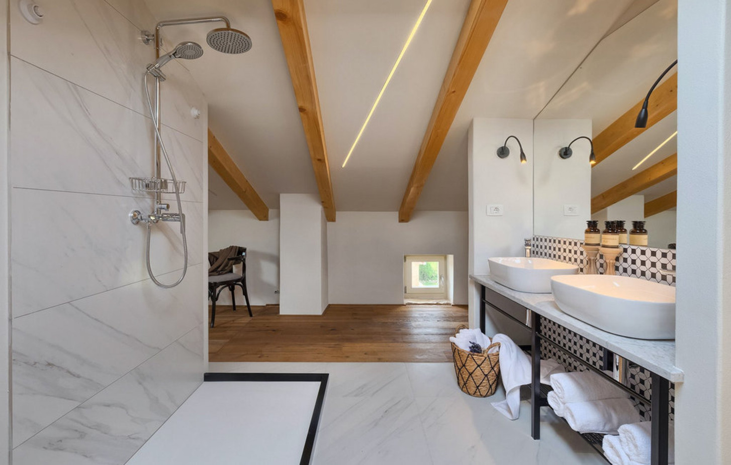 A dedicated BBQ terrace makes shared meals outdoors simple and enjoyable. Outside, private outdoor areas are designed for relaxed stays. The saltwater swimming pool is ideal for daily use, with sun loungers and shaded areas around it, while the garden feels open, calm and natural, creating a pleasant outdoor environment. Pool heating is available on request, making the house comfortable beyond the peak summer season.