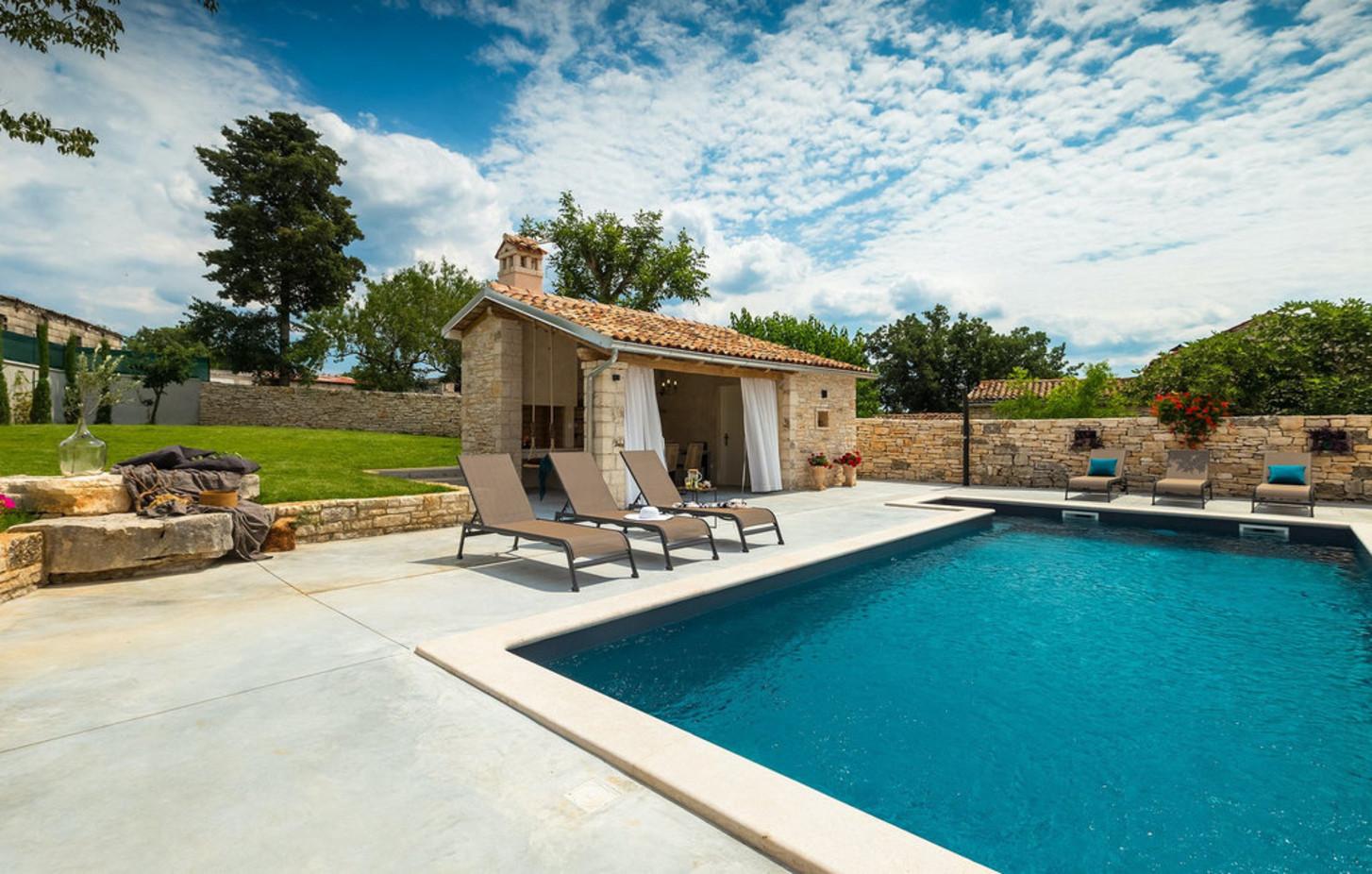 Outside, guests can enjoy a 40 m² heated saltwater swimming pool, surrounded by eight sun loungers and two sun umbrellas, perfect for relaxing under the sun. The wellness area includes a jacuzzi and a sauna, offering a peaceful place to unwind after a day of exploring Istria. A fully equipped outdoor kitchen with a dining table and charcoal grill creates the perfect setting for enjoyable evenings and shared meals outdoors.