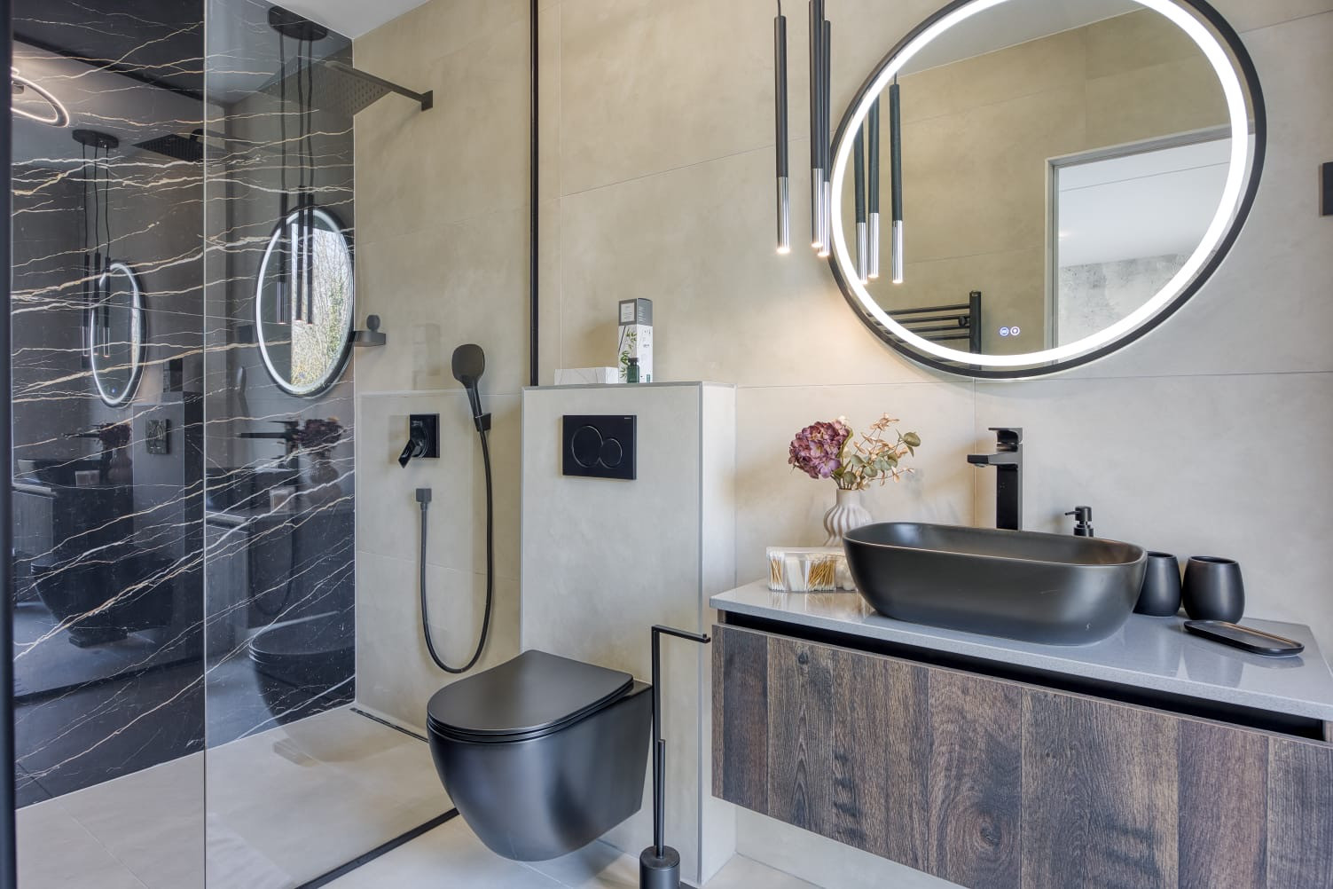 The villa accommodates up to 8 guests and features 4 elegant bedrooms on the first floor, each furnished with a double bed and a private en-suite bathroom with a shower, ensuring comfort and privacy for every guest. On the ground floor there is an additional separate guest WC.