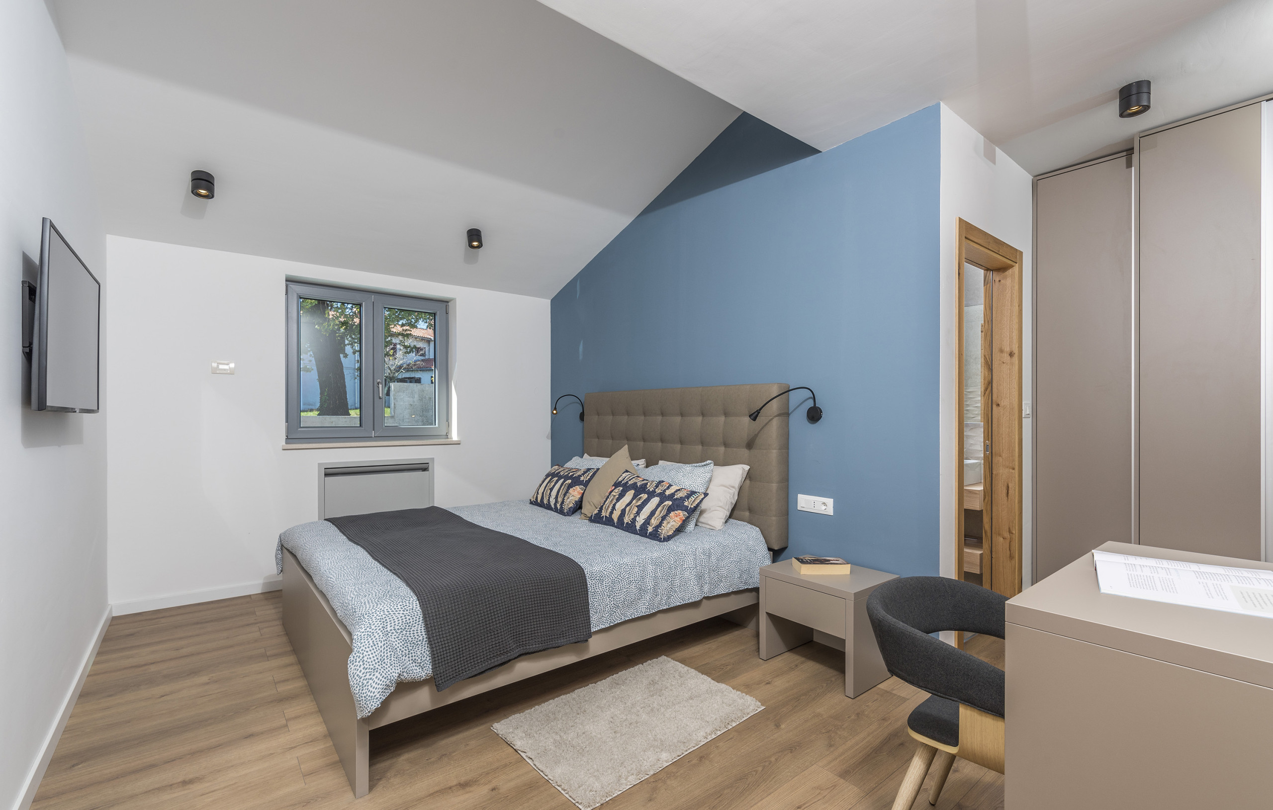 The villa offers 305 m² of living space on a private 1,700 m² plot and can accommodate up to 9 guests. It has four bedrooms, each with a double bed, and one of the bedrooms also includes an extra bed. Two bedrooms are located on the ground floor and two on the first floor, making the layout ideal for families or groups. There are four bathrooms in the villa, including two bathrooms with a shower and bidet and two bathrooms with a bathtub, shower and bidet. In addition, the villa has one guest WC inside the house and one outdoor WC.