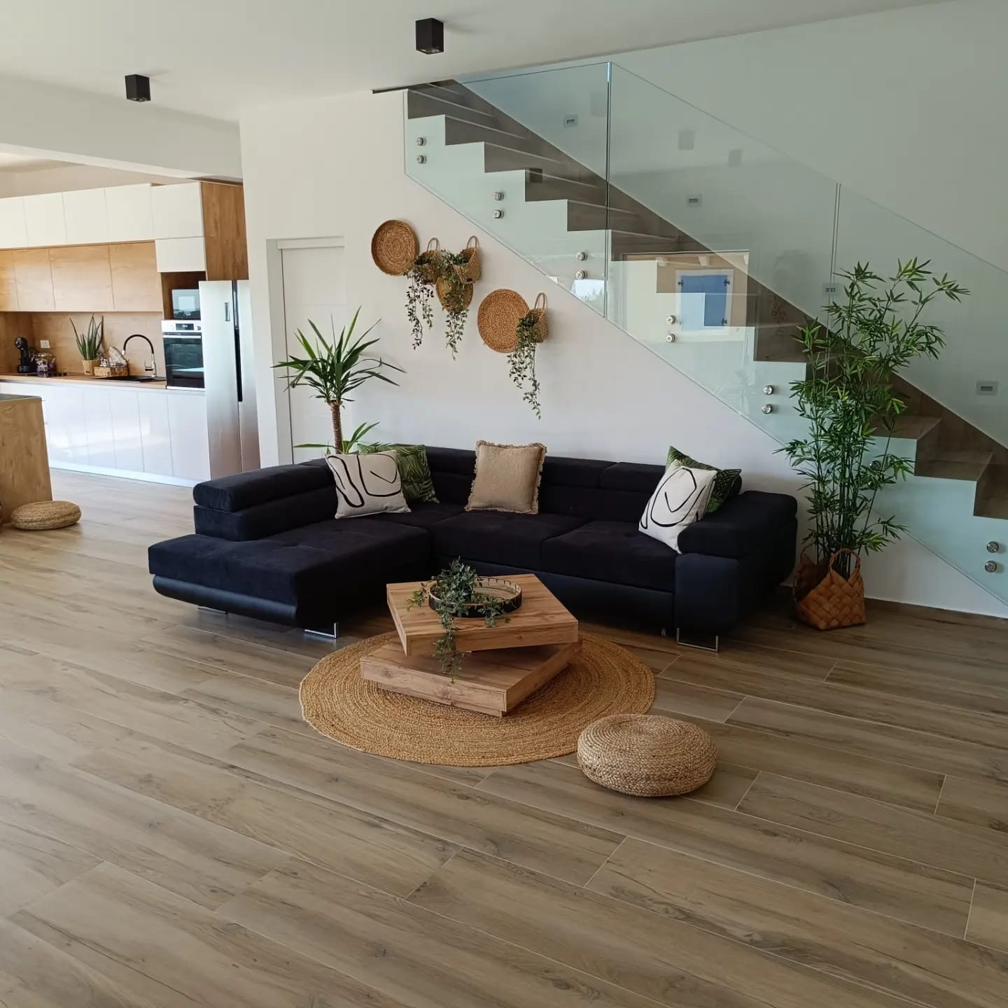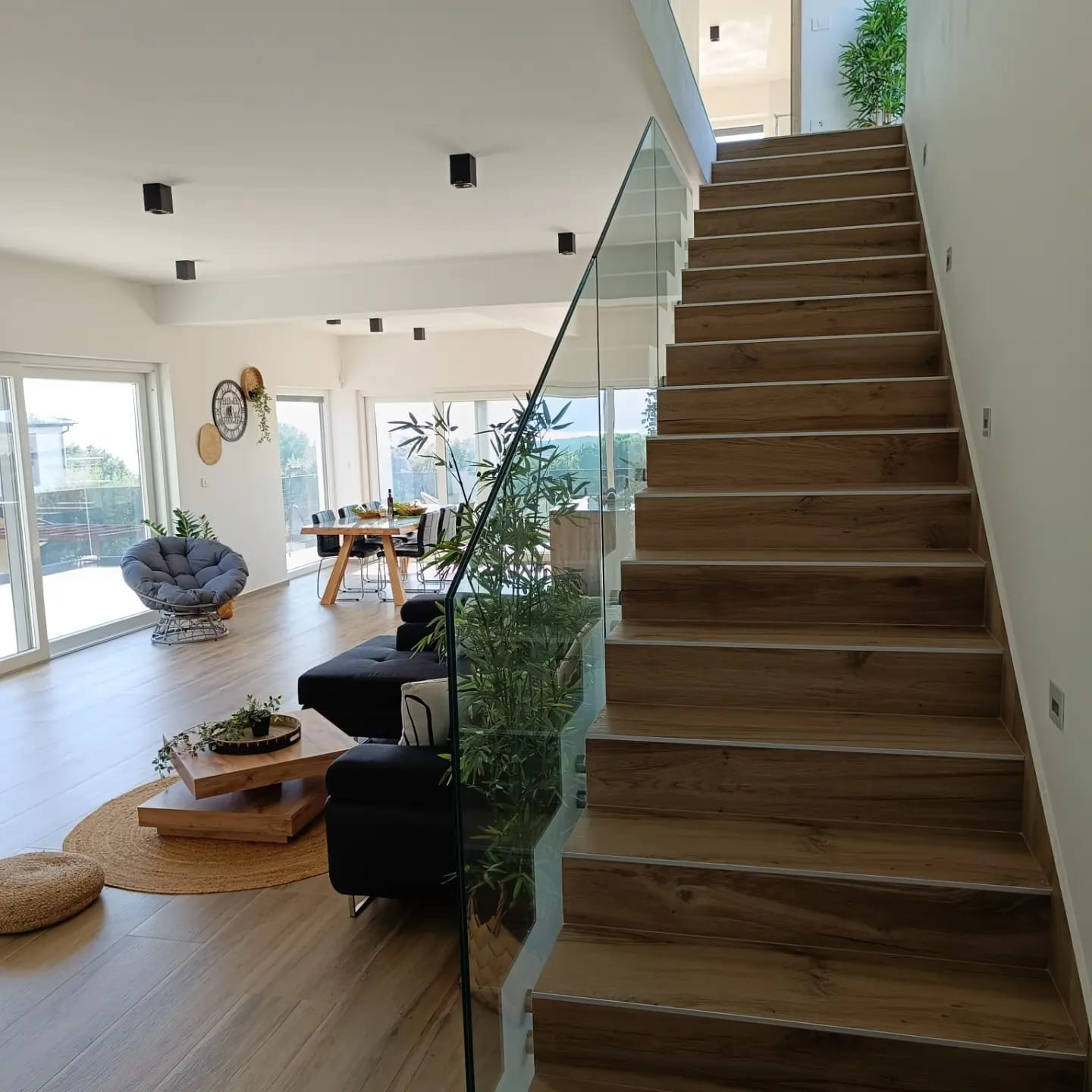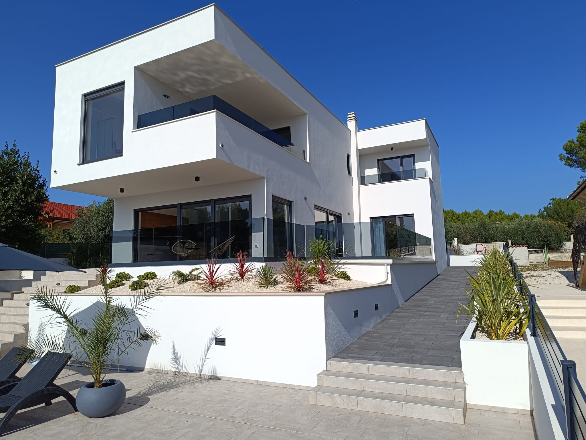 The villa offers 195 m² of living space on a 980 m² private plot and can comfortably accommodate up to 8 guests. It features three bedrooms, a sofa bed for two persons in the living room, three bathrooms, and an additional guest WC. The layout is thoughtfully designed to provide space, comfort, and privacy for families.