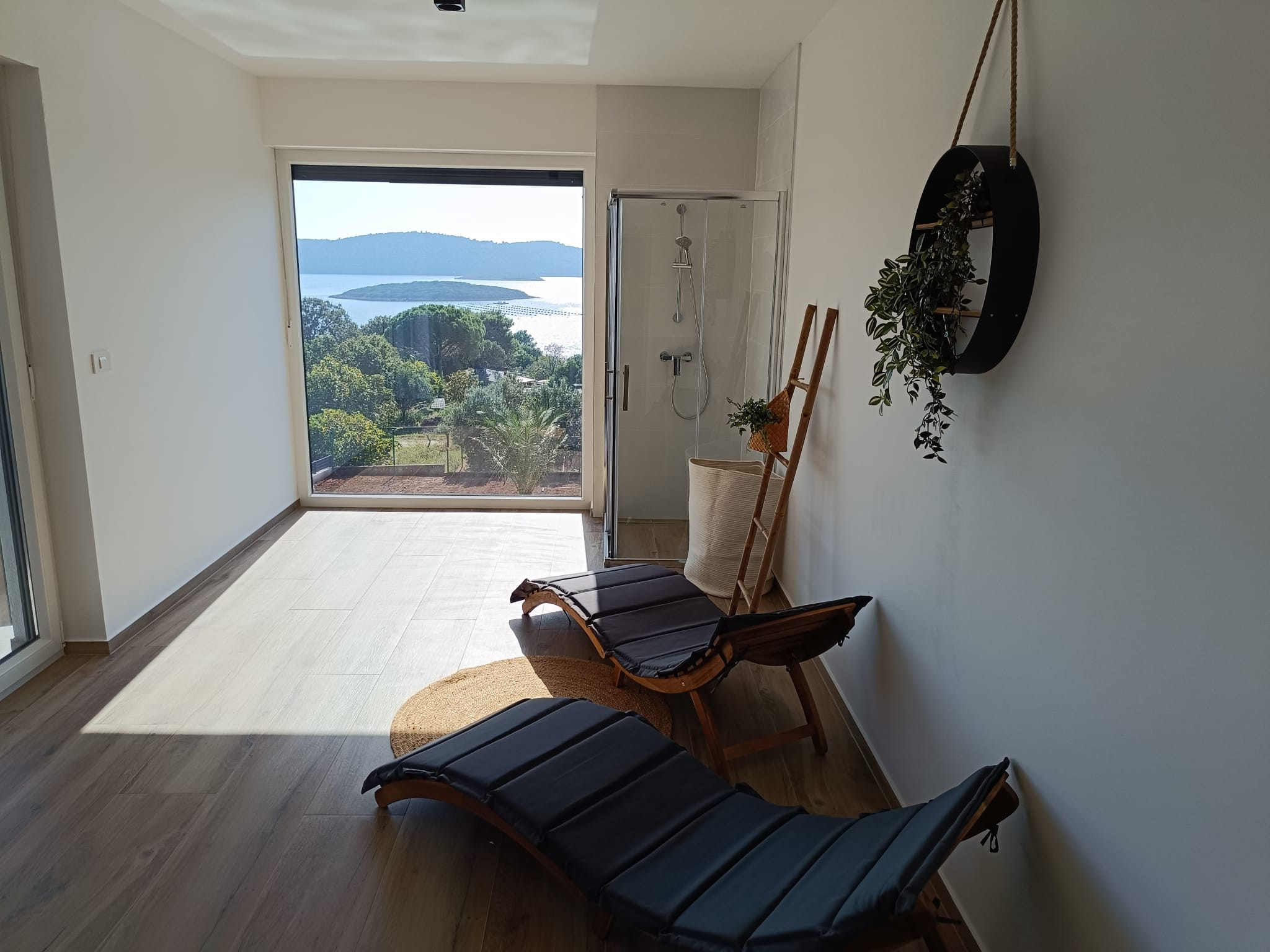 The outdoor area features a 38 m² private infinity swimming pool with breathtaking sea views, eight sun loungers, and two sun umbrellas, creating an exceptional space for relaxation. Guests can enjoy a sauna with sea view and shower, as well as a small outdoor kitchen with a gas grill, perfect for outdoor dining and sunset evenings.