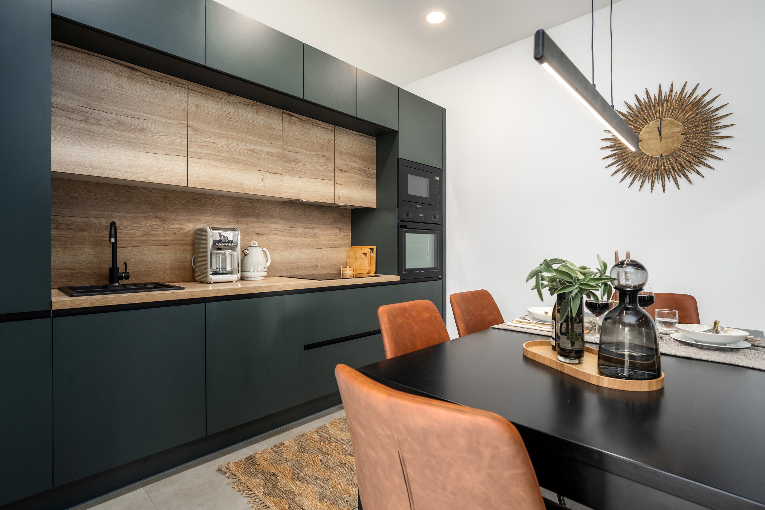 The villa is modern and well-equipped with everything you need for a comfortable stay. The open living area and kitchen make it easy to spend time together, and there is also a dining table where you can enjoy meals.