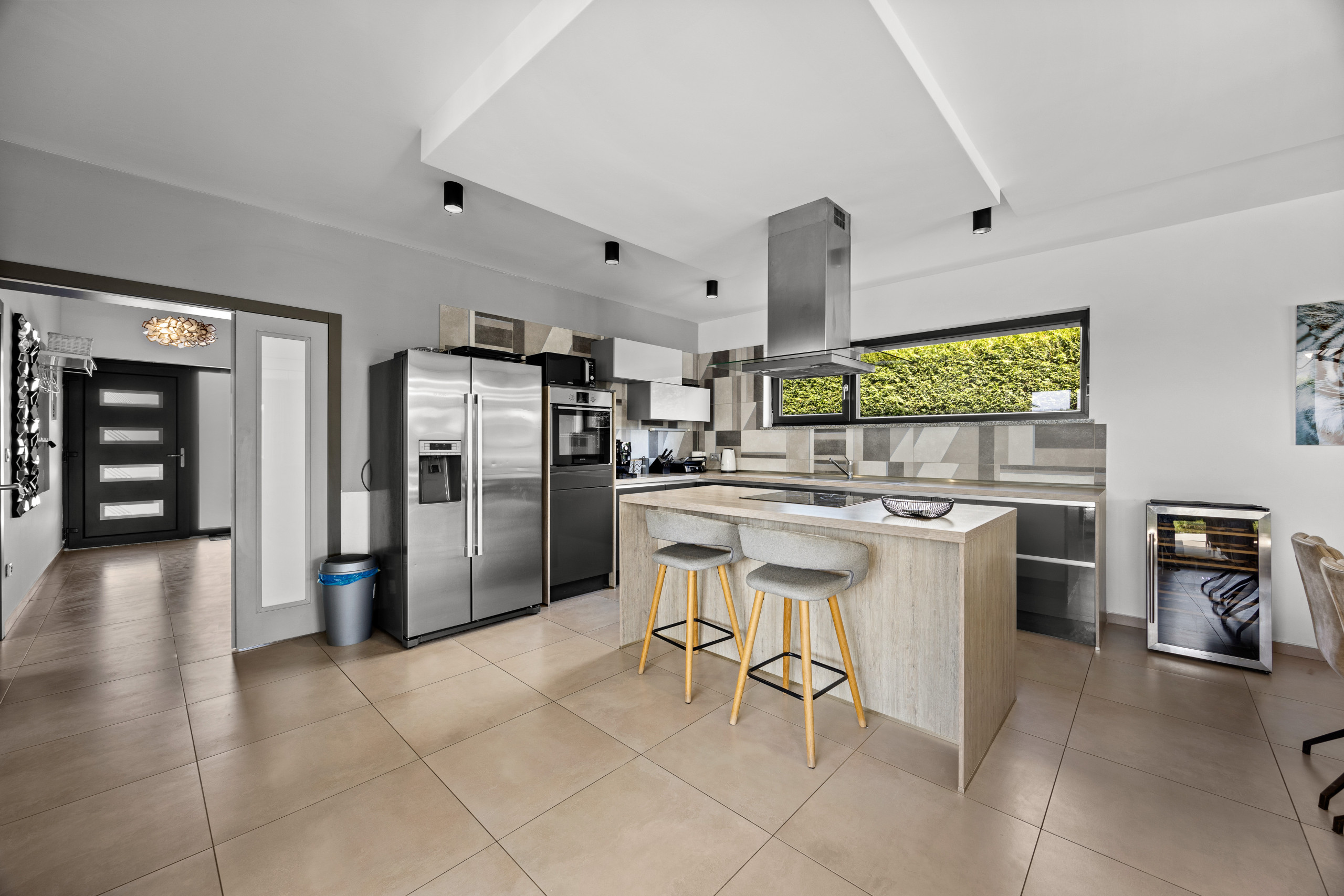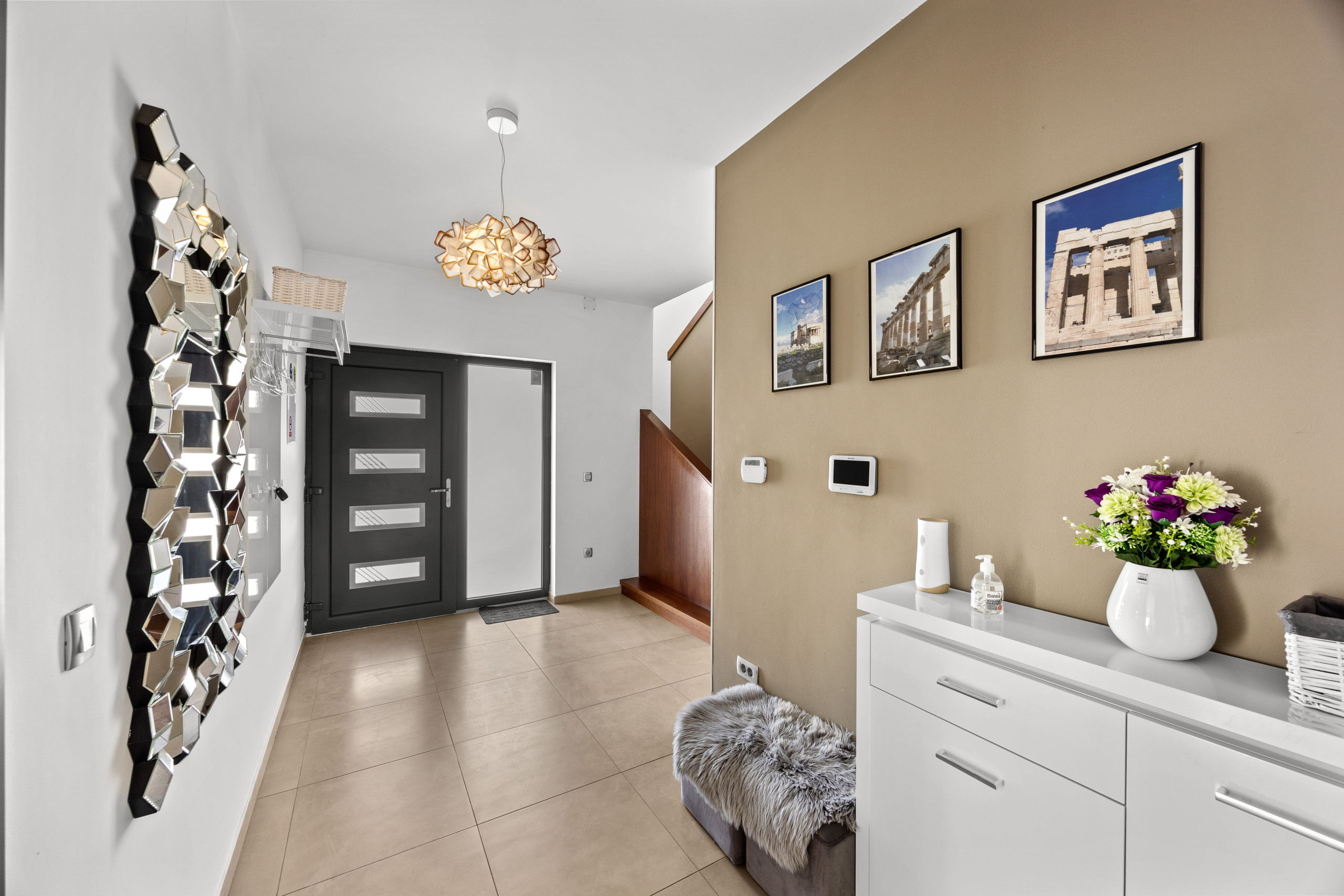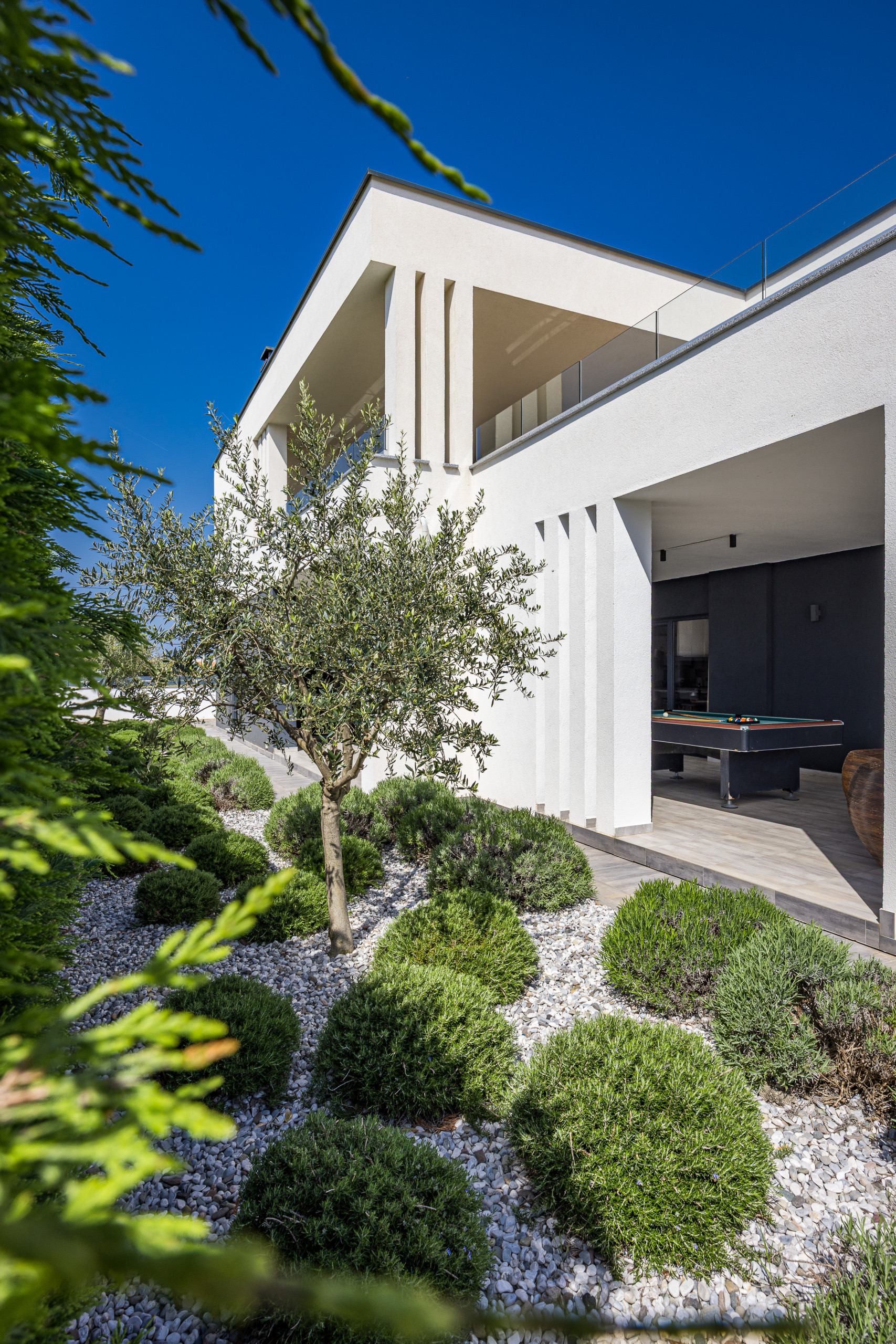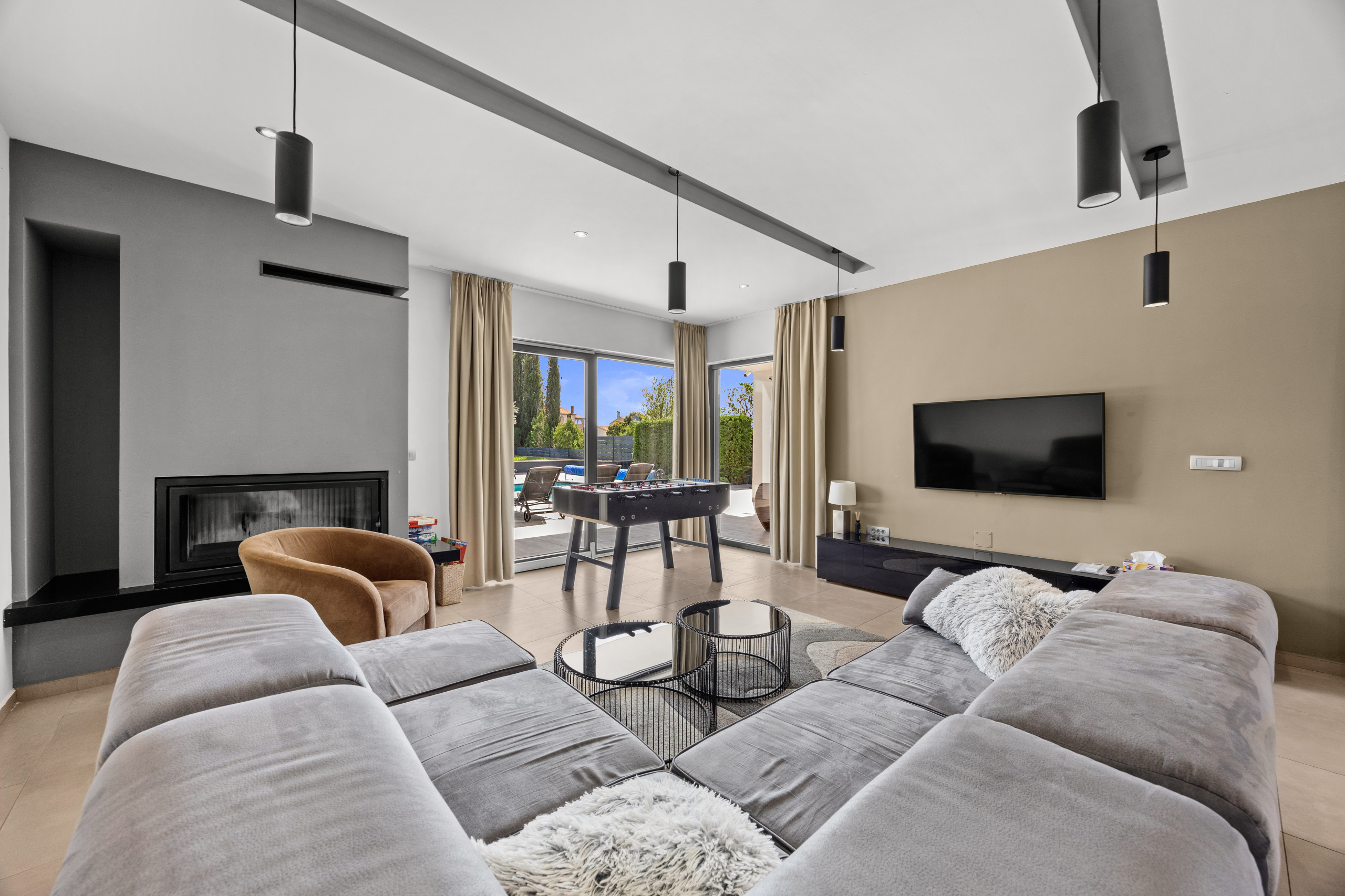 A covered dining area offers the opportunity to dine outdoors and enjoy cozy evenings with friends and family. The villa also features various entertainment options, including a pool table and table football, as well as a comfortable lounge area. Outdoors, guests can also enjoy a private tennis court and a basketball hoop.