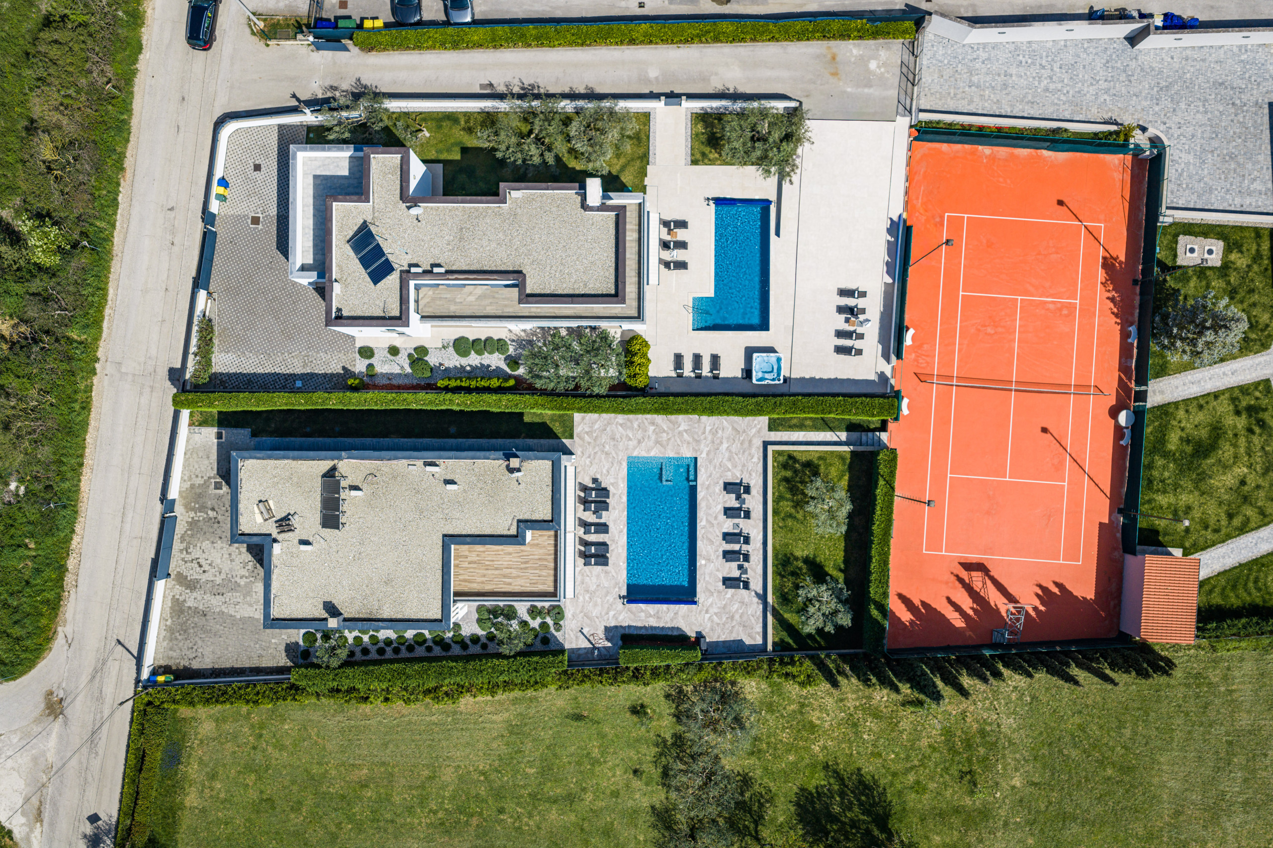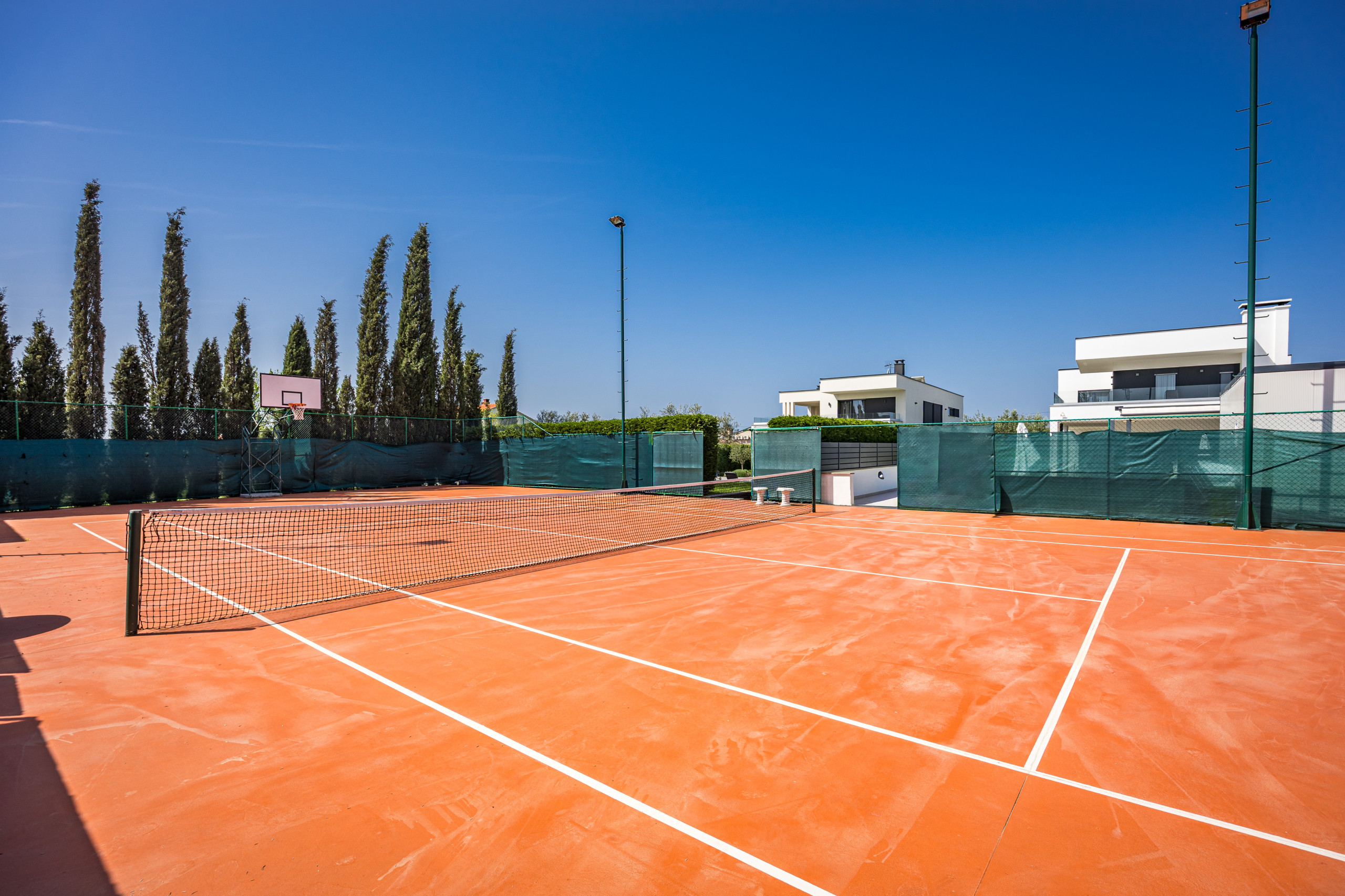 This beautiful, modern and stylishly furnished villa has a private pool and a shared tennis court with lighting so that you can play tennis even at night. But basketball fans also come here to their wishes and take an active vacation here.