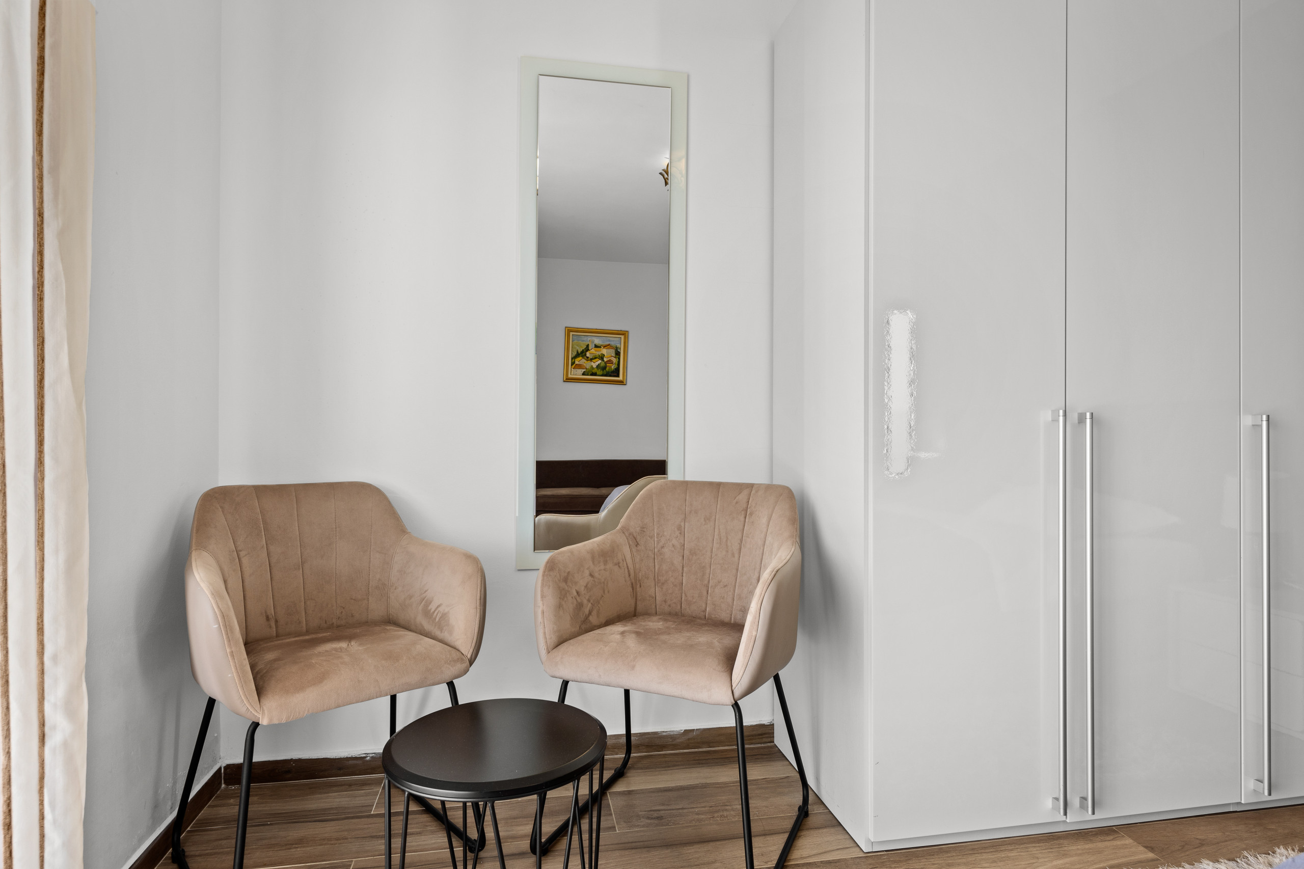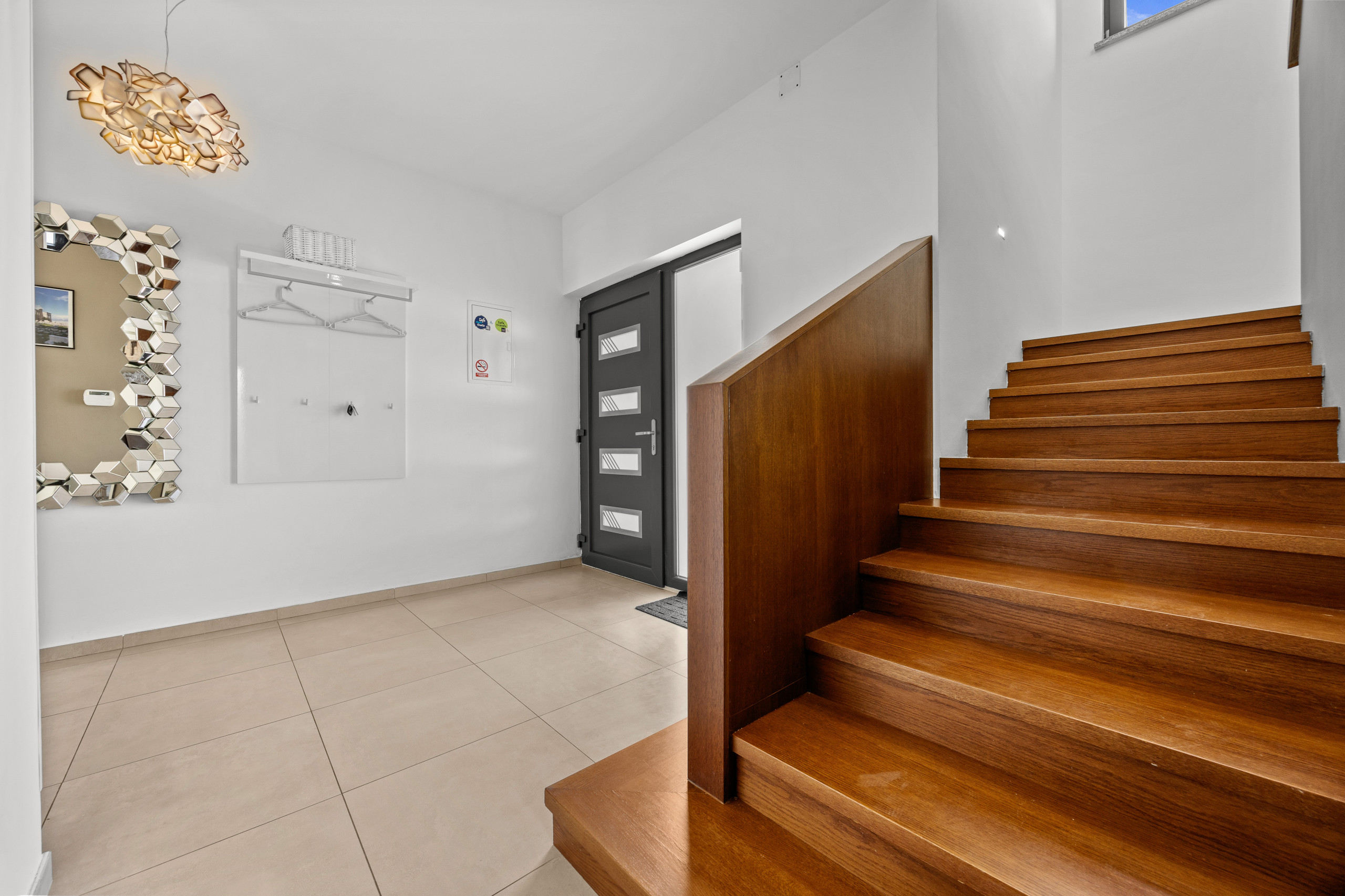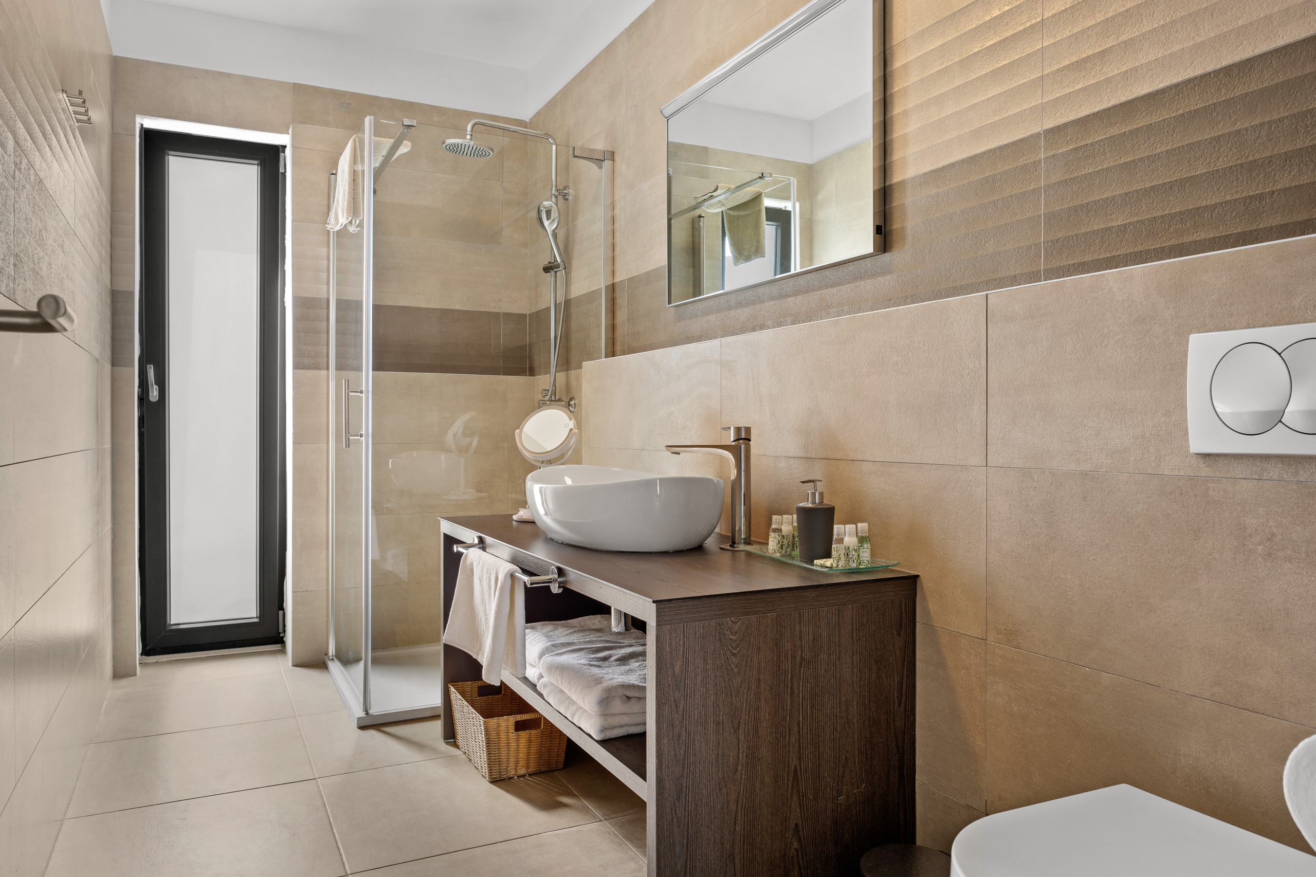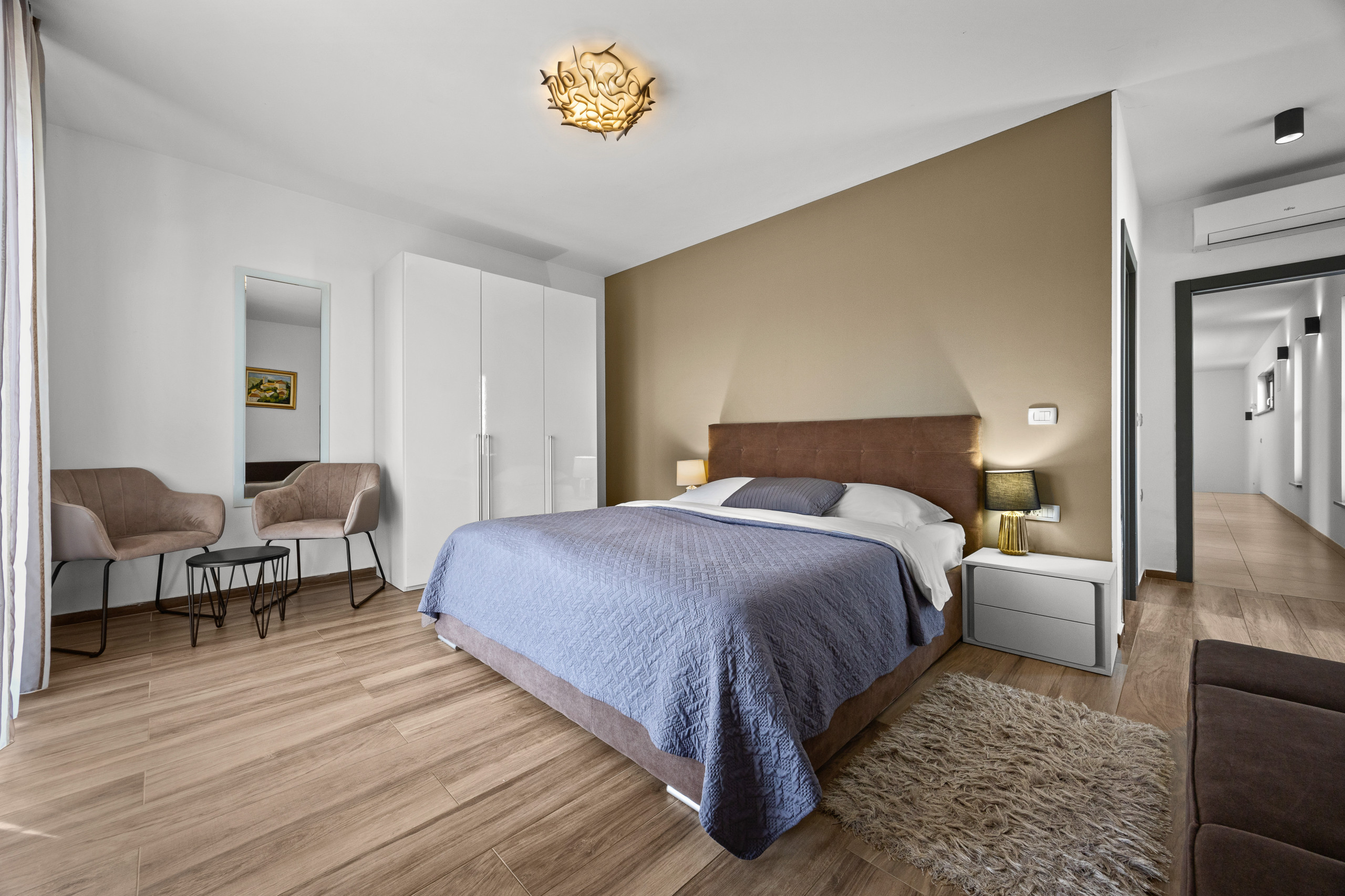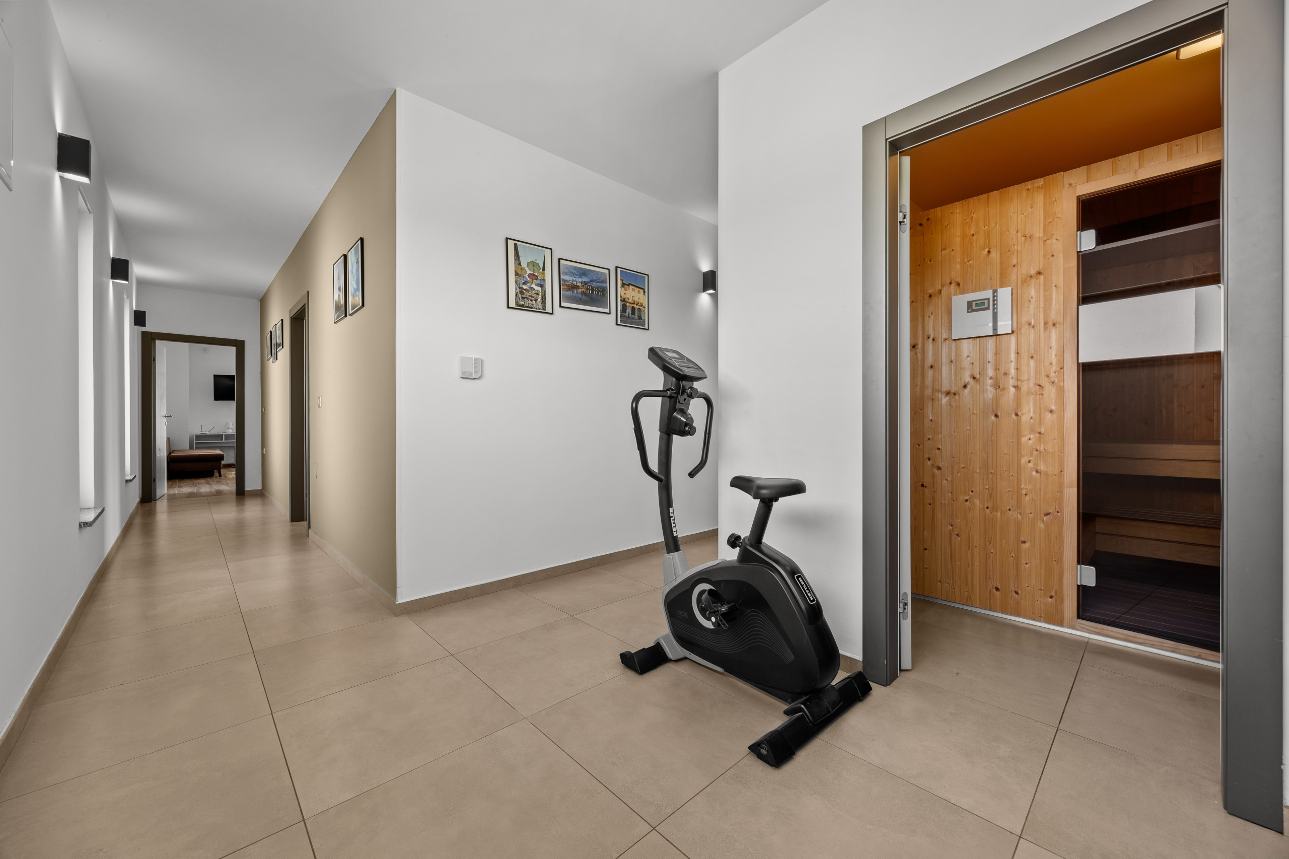 Three spacious bedrooms, all with private bathrooms, are located on the first floor, where there is also a Finnish sauna. All bedrooms are equipped with a double bed, TV, and air conditioning.