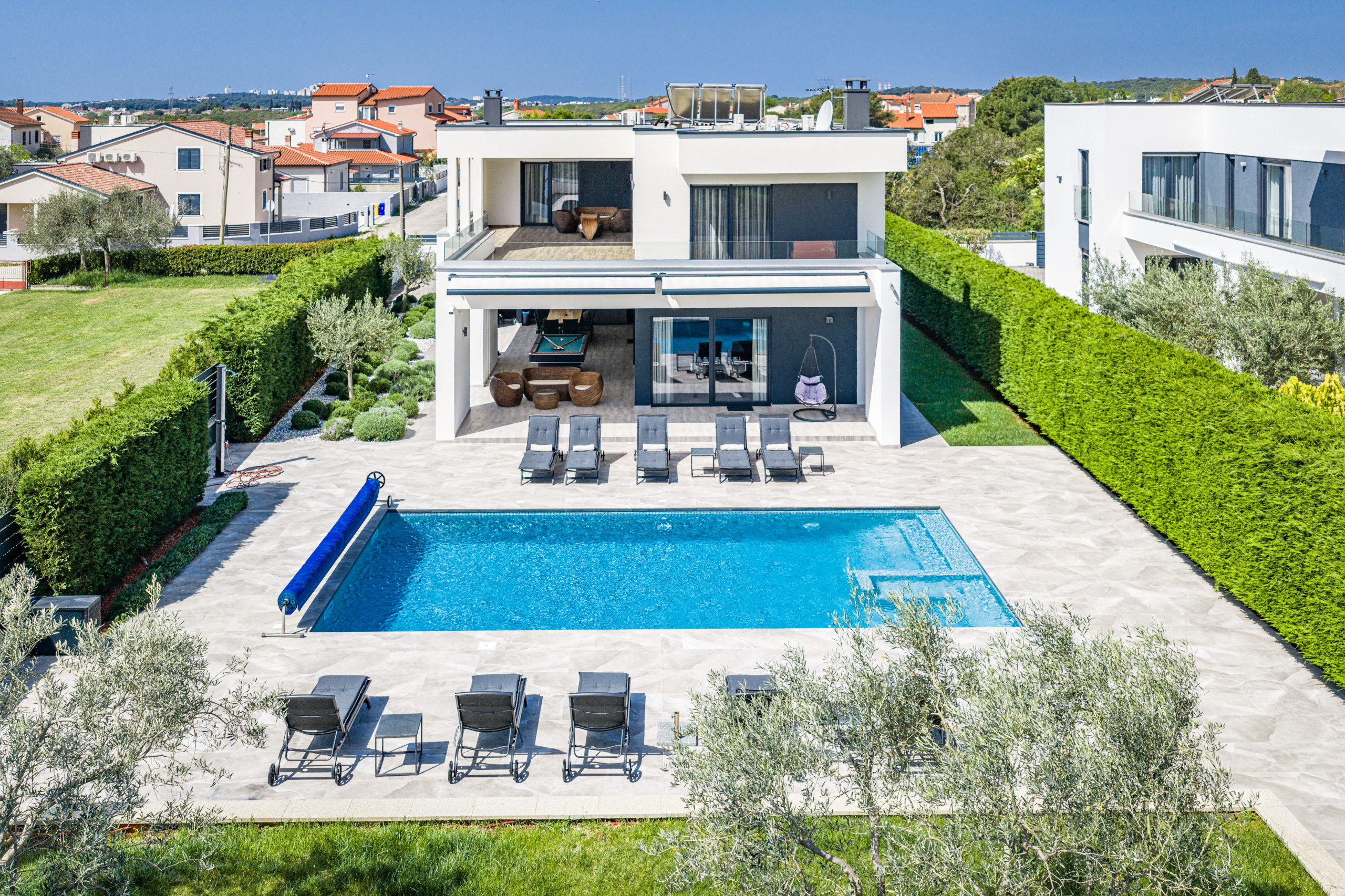 This unique luxury villa is located in Pula and is only a few minutes away from the beach. It can enchant you with its beautiful, extravagant design and dreamlike outdoor area, inviting you to spend pleasant hours by the pool. This stunning 250 square meter villa offers a stylish and modern vacation.