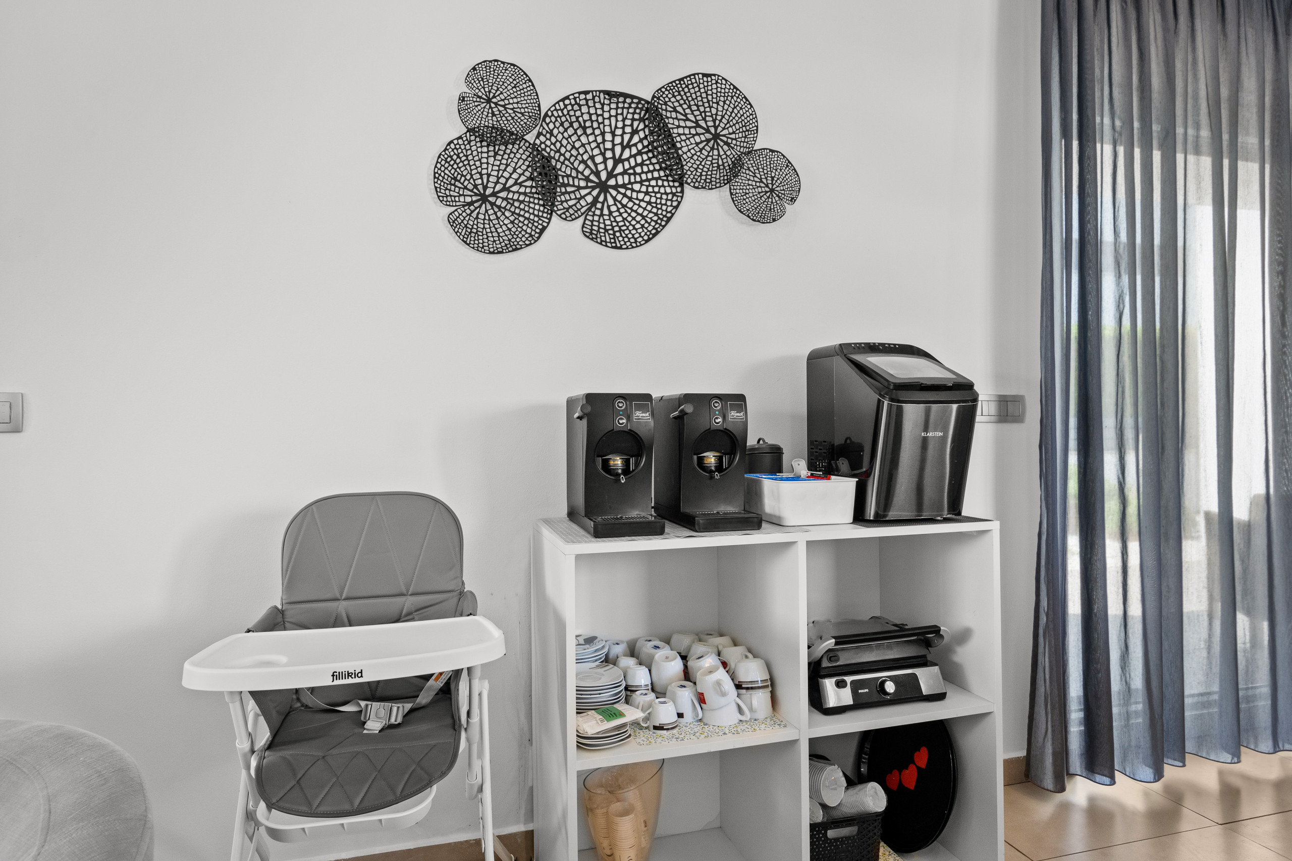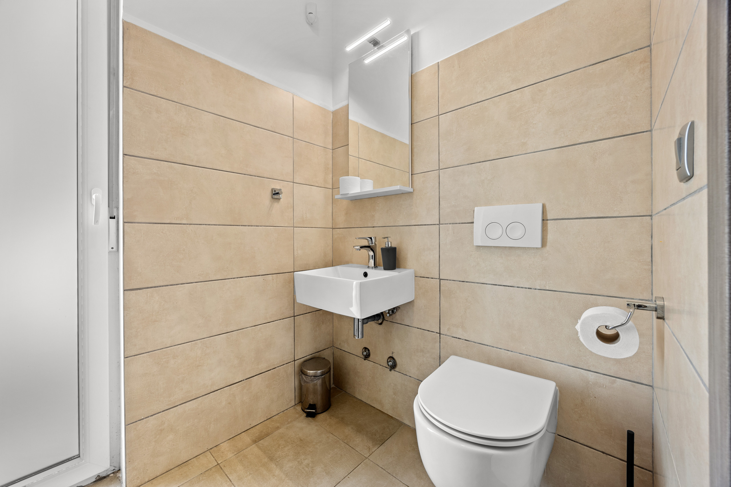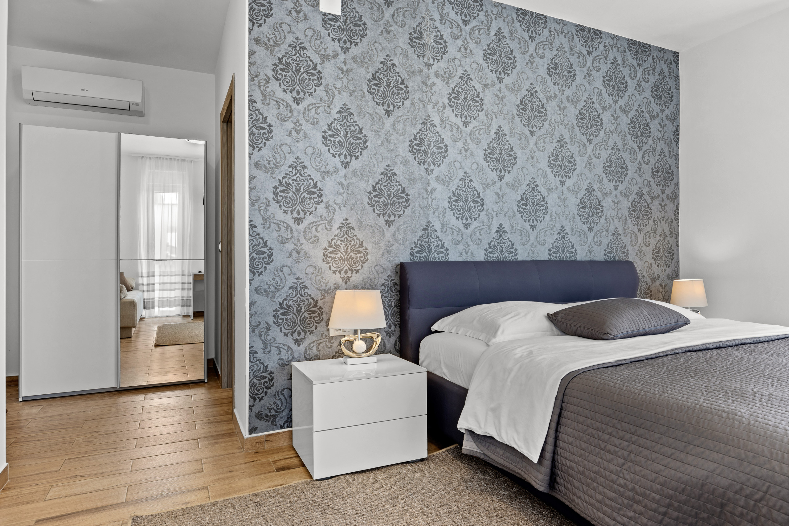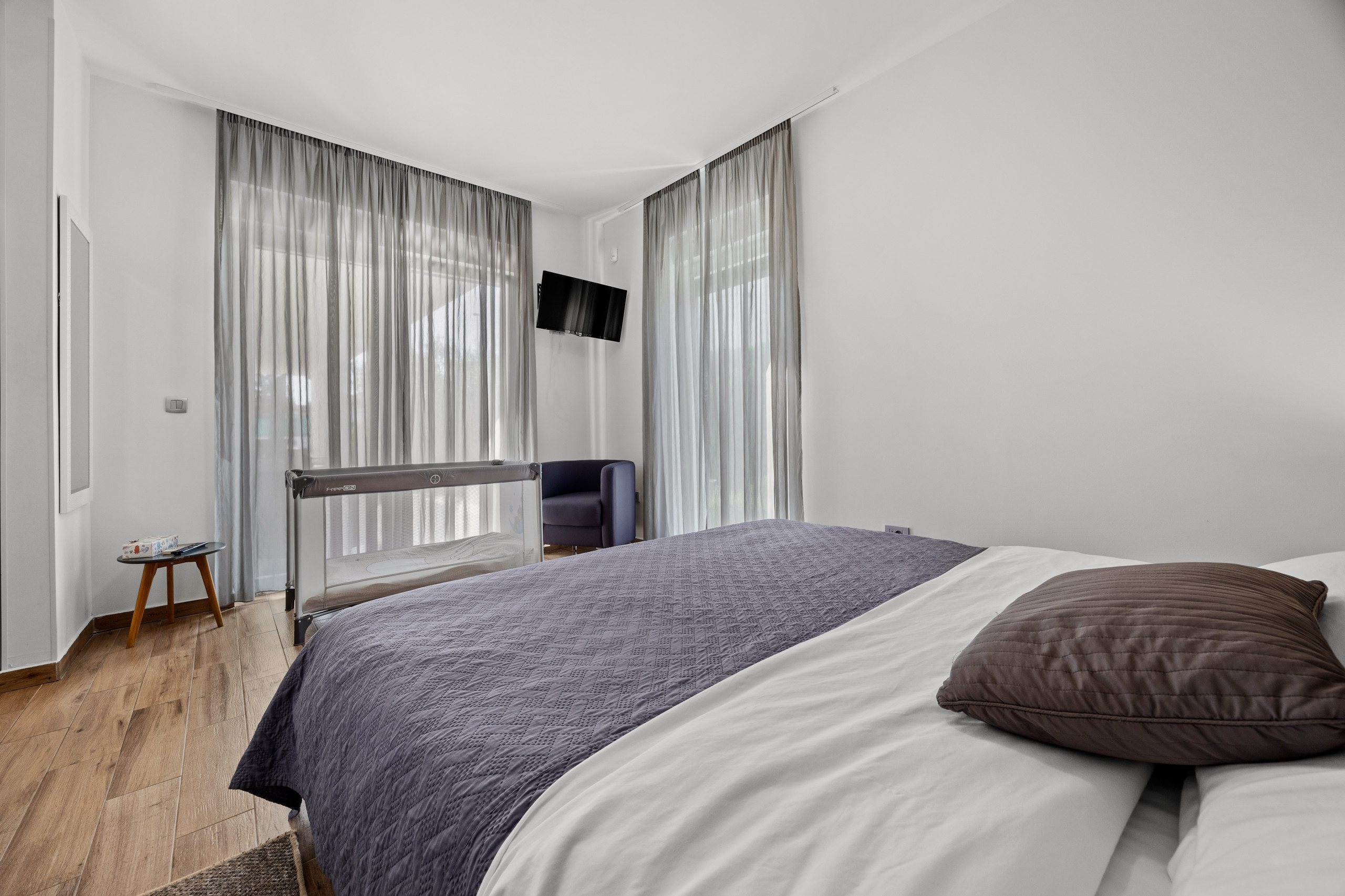 Three spacious bedrooms, all with private bathrooms, are located on the first floor, where there is also a Finnish sauna. All bedrooms are equipped with a double bed, TV, and air conditioning.