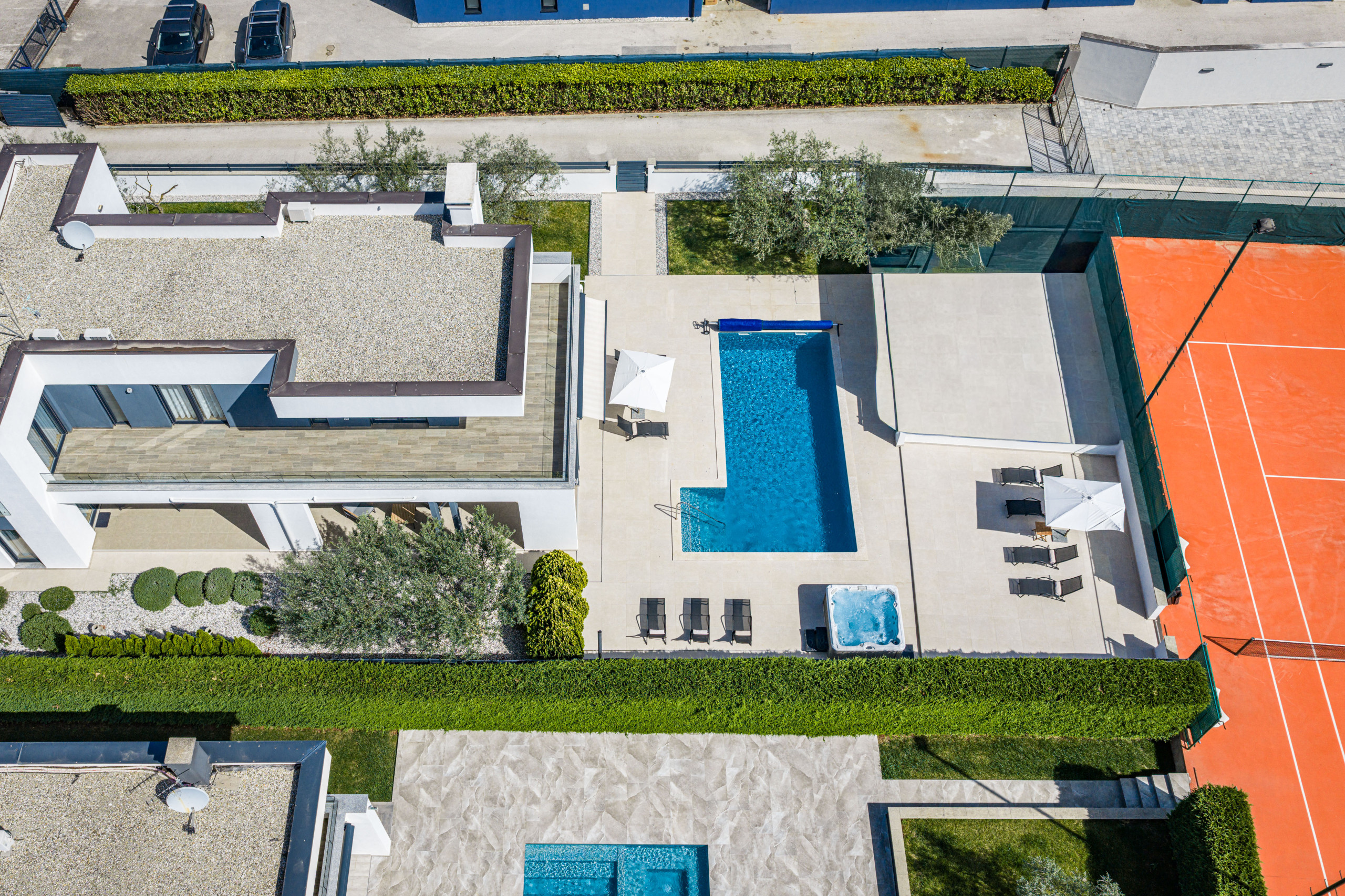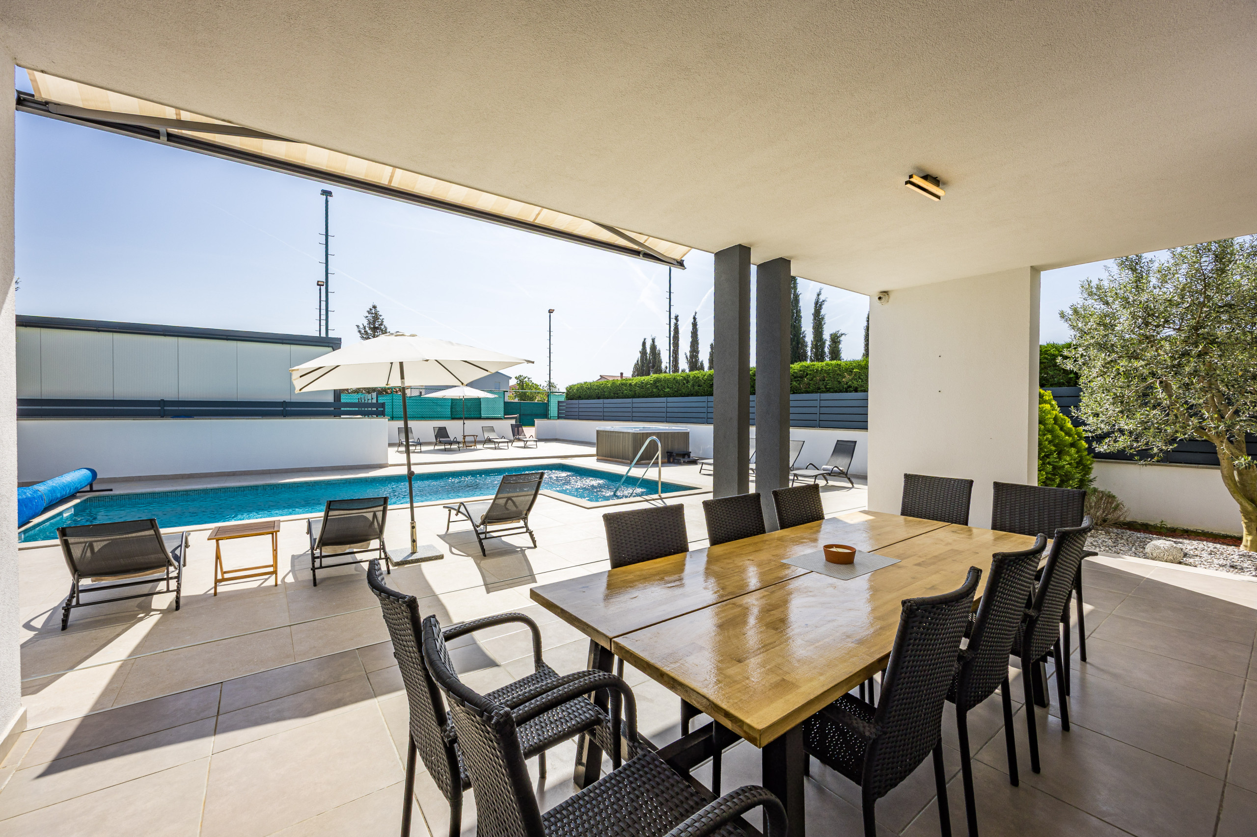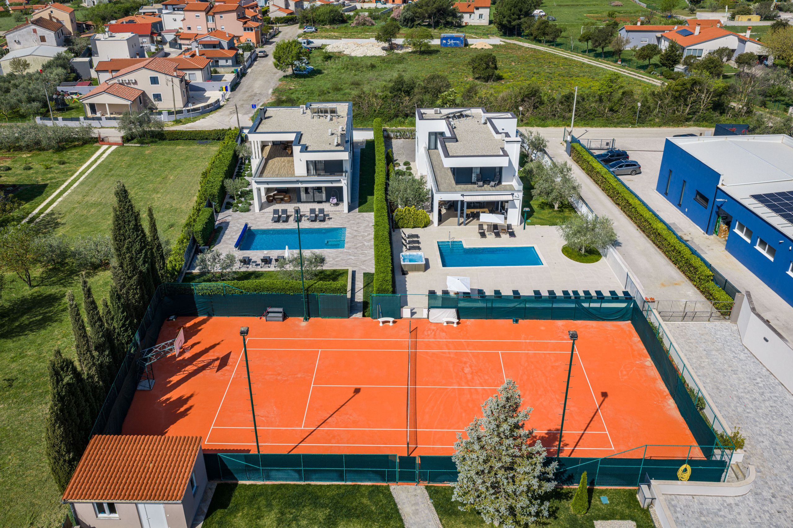 This beautiful, modern and stylishly furnished villa has a private pool and a shared tennis court with lighting so that you can play tennis even at night. But basketball fans also come here to their wishes and take an active vacation here.