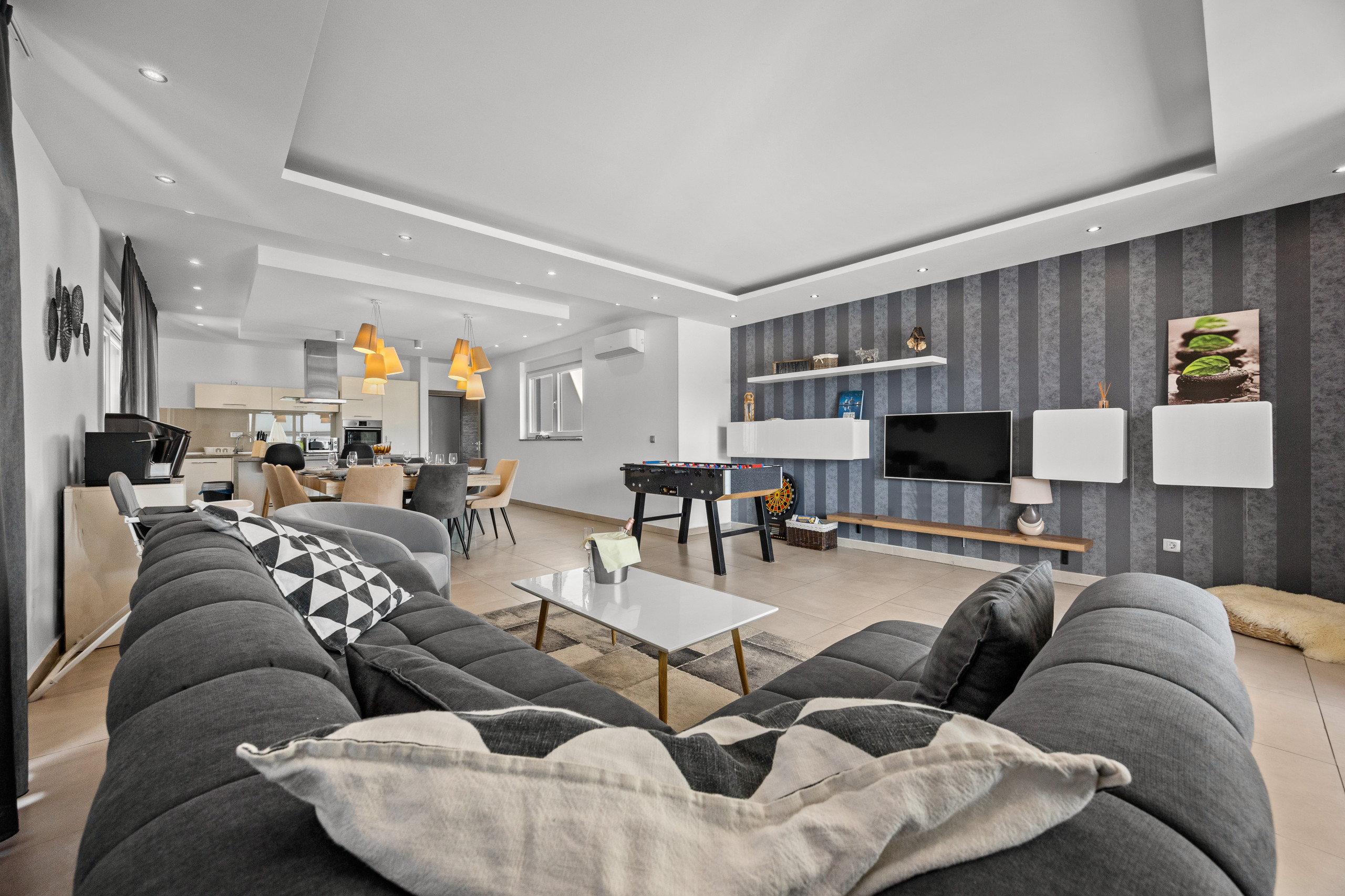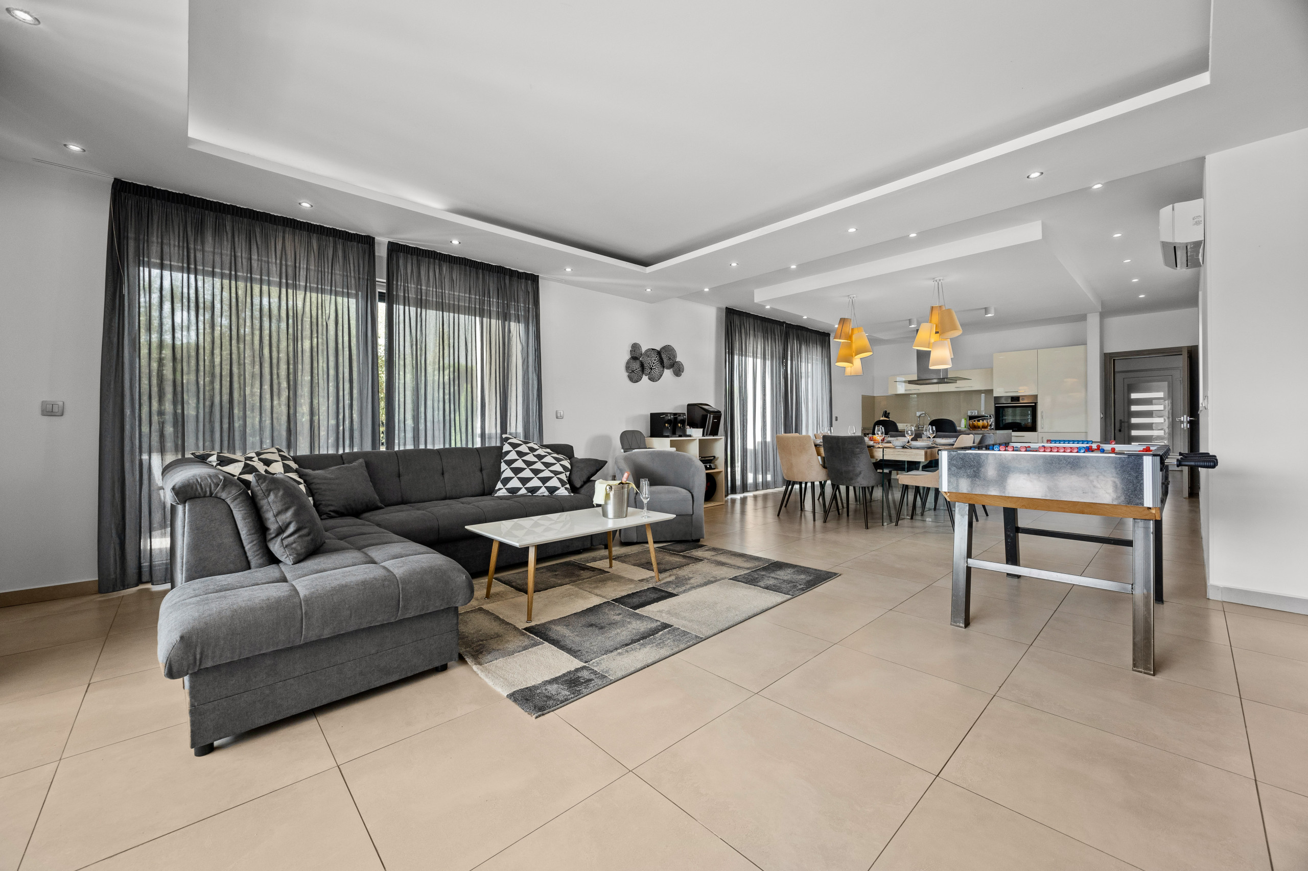 A covered dining area offers the opportunity to dine outdoors and enjoy cozy evenings with friends and family. The villa also features various entertainment options, including a pool table and table football, as well as a comfortable lounge area. Outdoors, guests can also enjoy a private tennis court and a basketball hoop.
