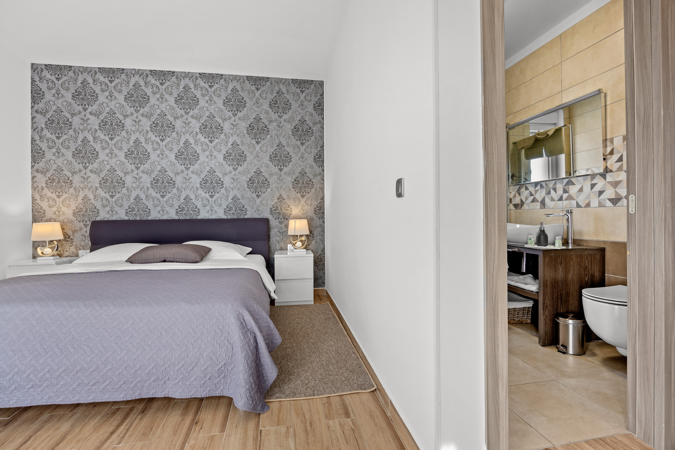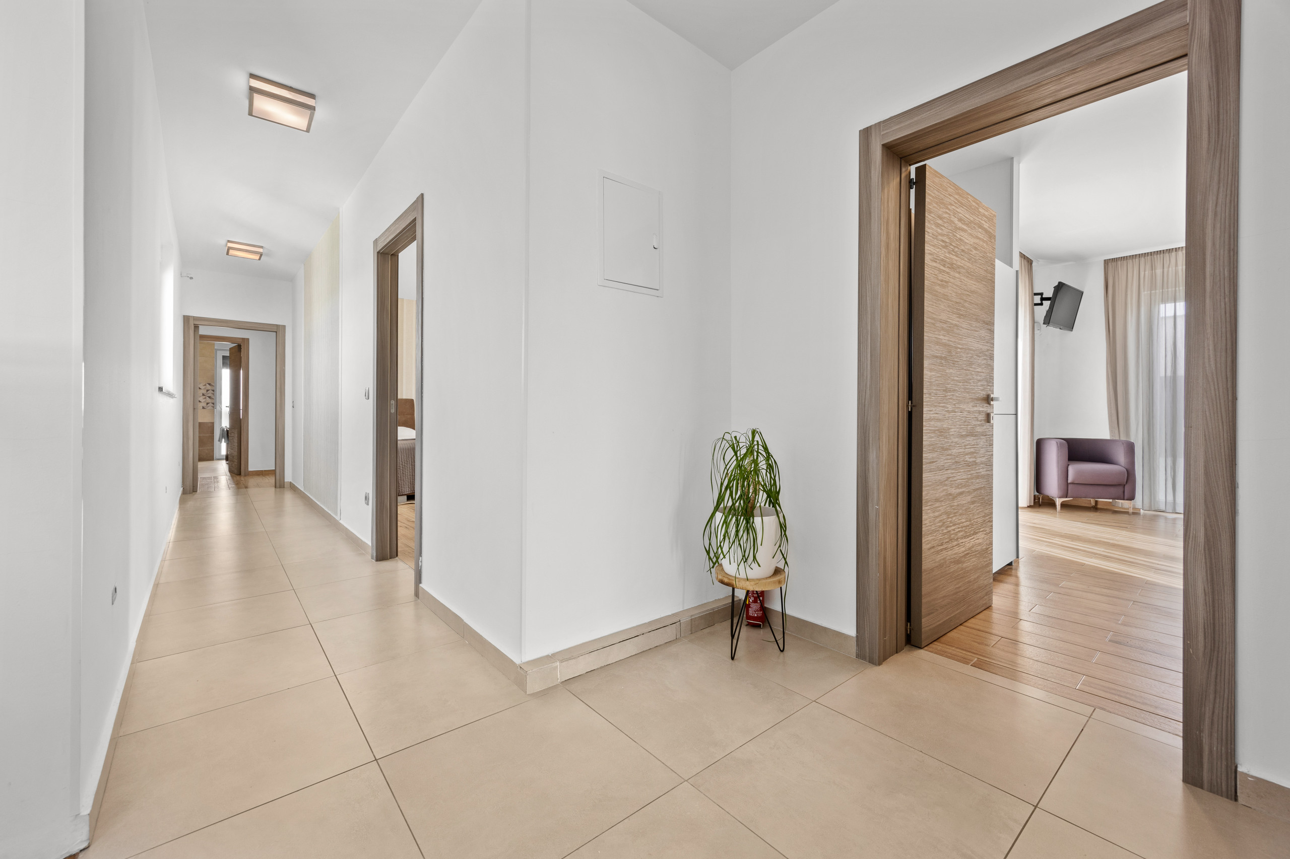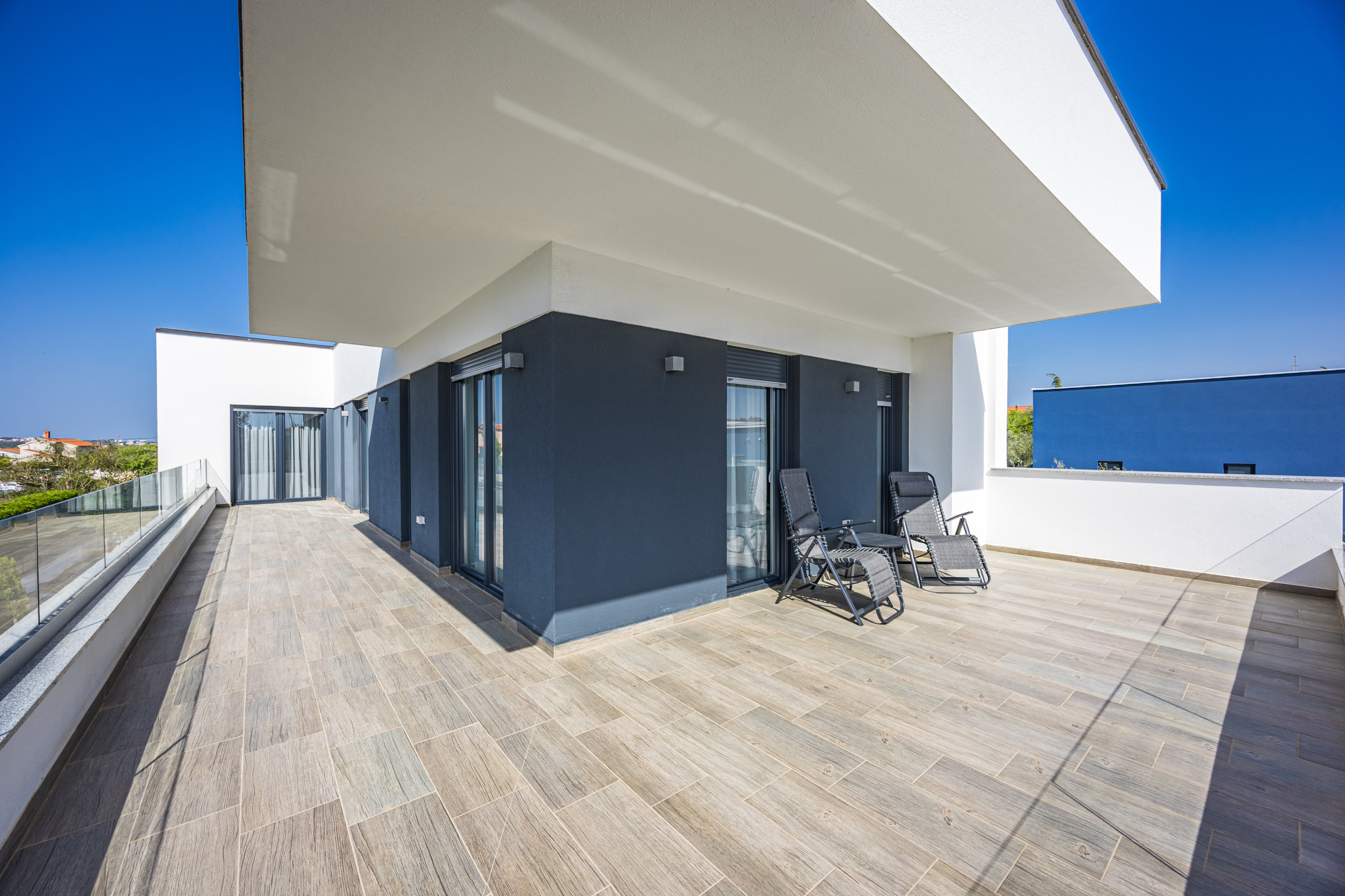 Villa Casa L can host up to 10 people, making it ideal for family vacations or groups of friends. It offers 4 bedrooms—two with double beds and two with double single beds. There is also a comfortable double sofa bed, allowing for 2 extra guests (the extra 2 guests are available for additional costs of 30 EUR per night / per person). The villa has 4 bathrooms, so everyone has space.