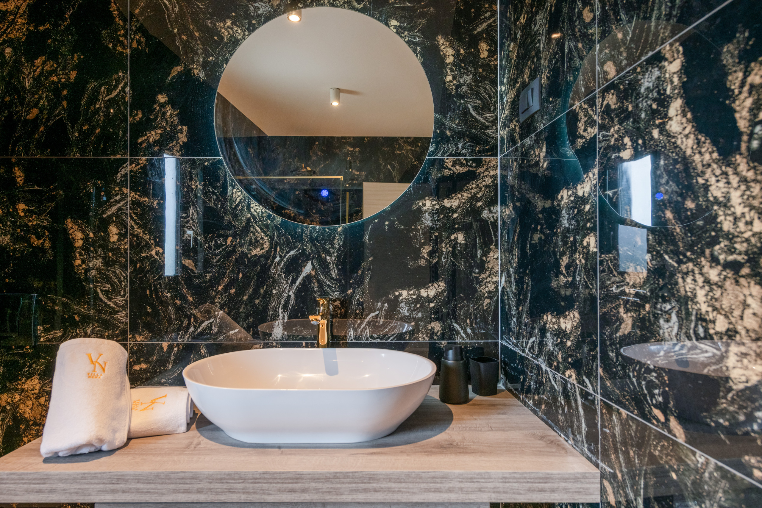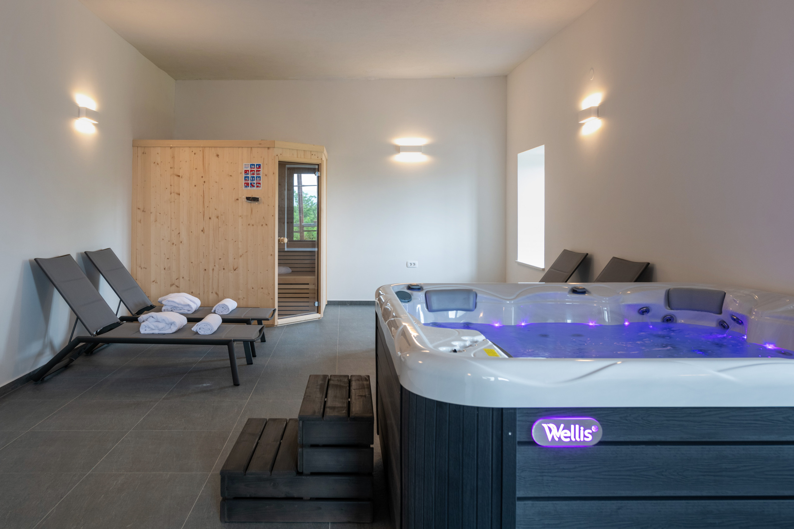 The outdoor area is the true highlight of Villa Nene. Guests can enjoy a private 55 m² saltwater swimming pool surrounded by ten sun loungers and two sun umbrellas, perfect for relaxing under the Mediterranean sun. The wellness area includes a sauna and jacuzzi, complemented by a fully equipped fitness area for active guests.