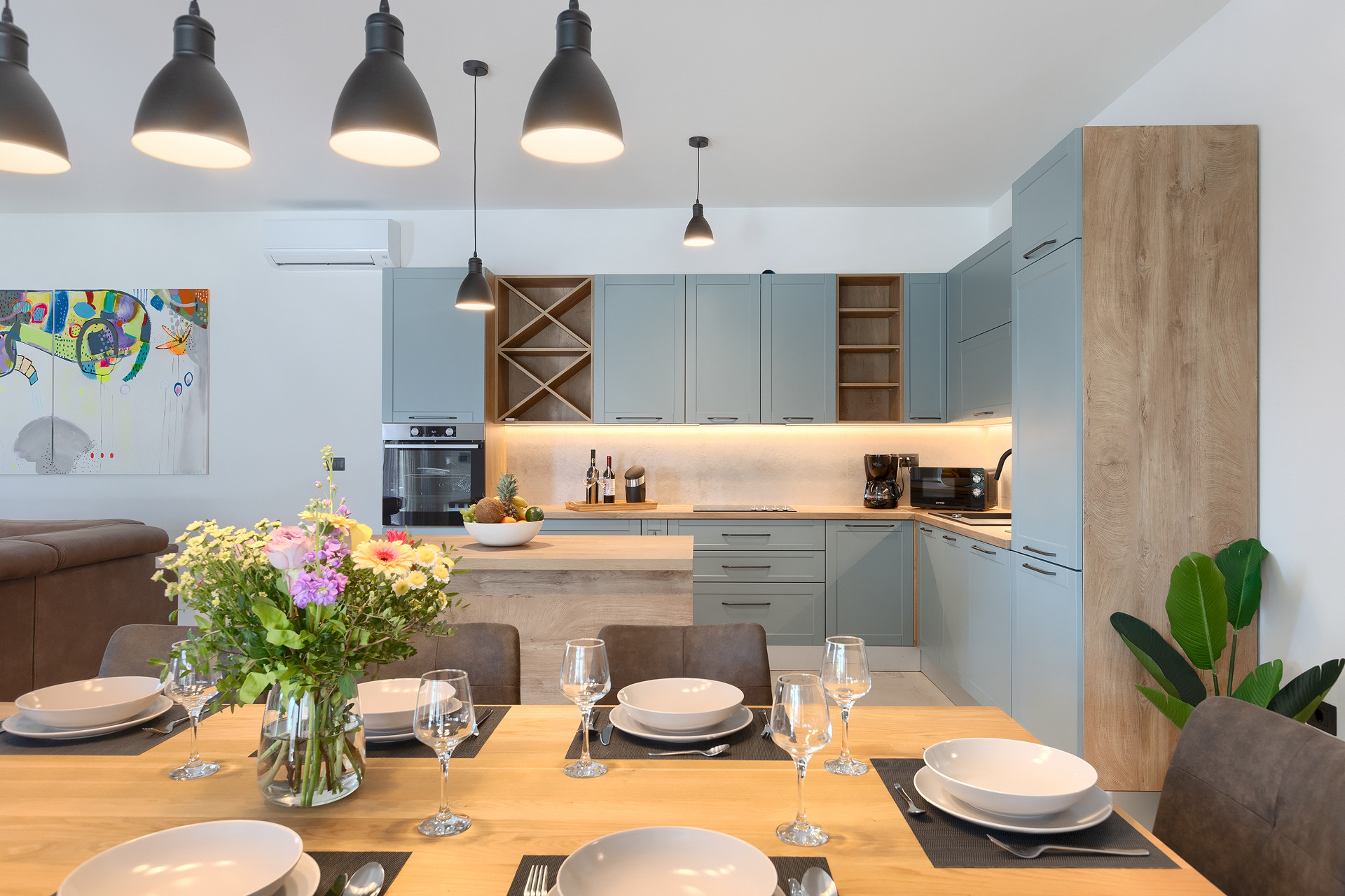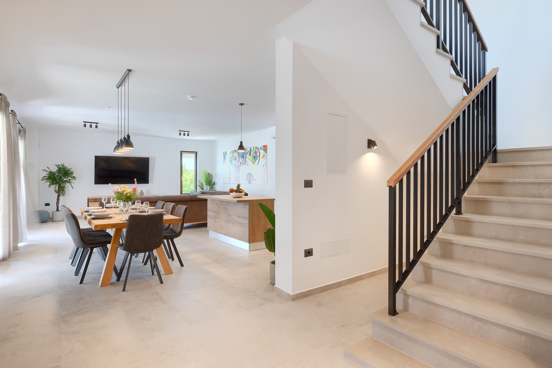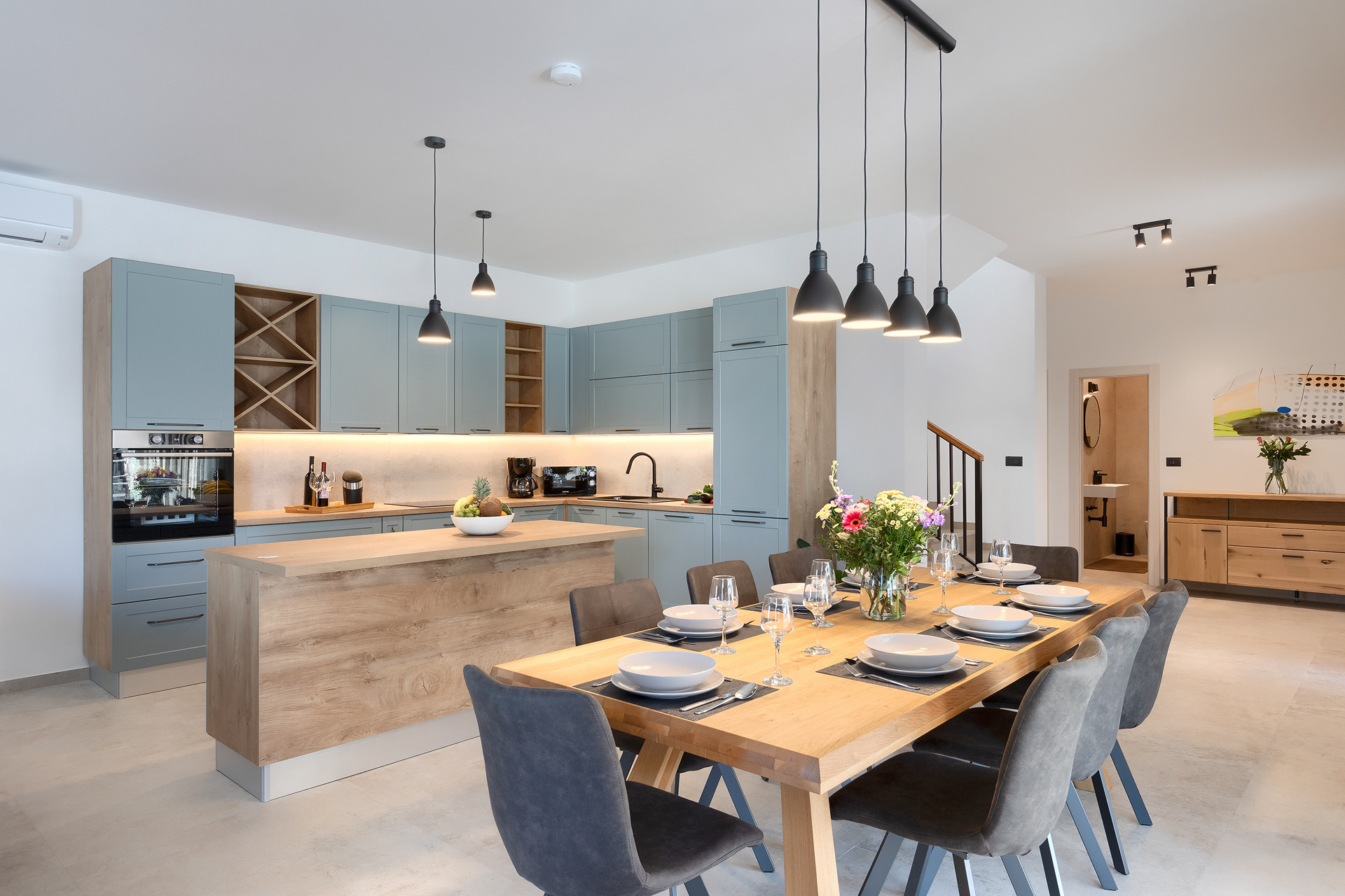 The villa offers 240 m² of living space on a 840 m² private plot and can comfortably accommodate up to 8 guests. It features four bedrooms with double beds, each with its own en-suite bathroom with shower, as well as an additional guest WC and a convenient outdoor WC. The villa is equipped with underfloor heating, ensuring comfort throughout the year. The spacious and well-designed layout provides a high level of privacy and convenience for all guests.