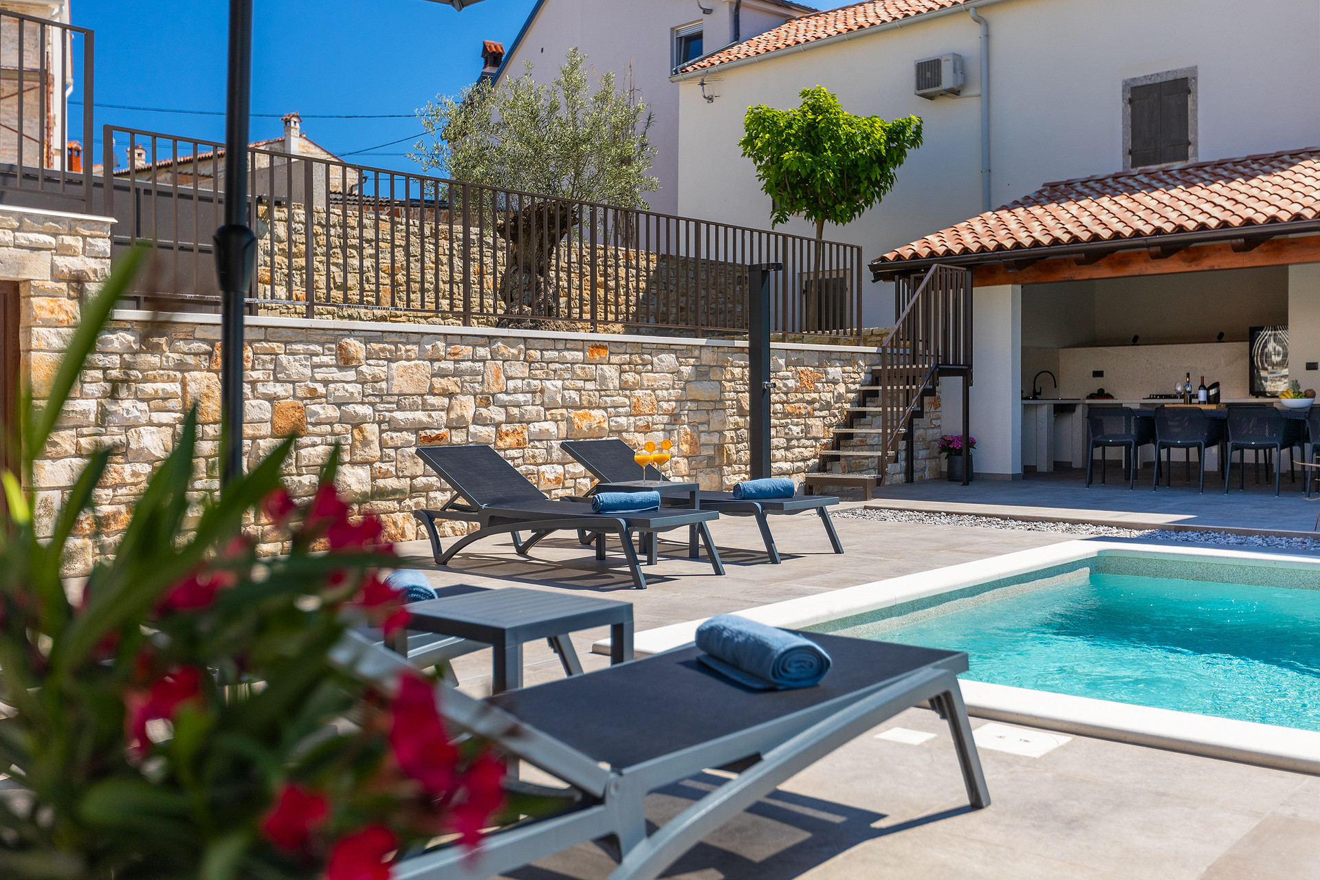The outdoor area includes a 36 m² private swimming pool, eight sun loungers, and four sun umbrellas, offering ample space for relaxation. Guests can enjoy an outdoor kitchen with a gas grill, perfect for outdoor dining and pleasant evenings.