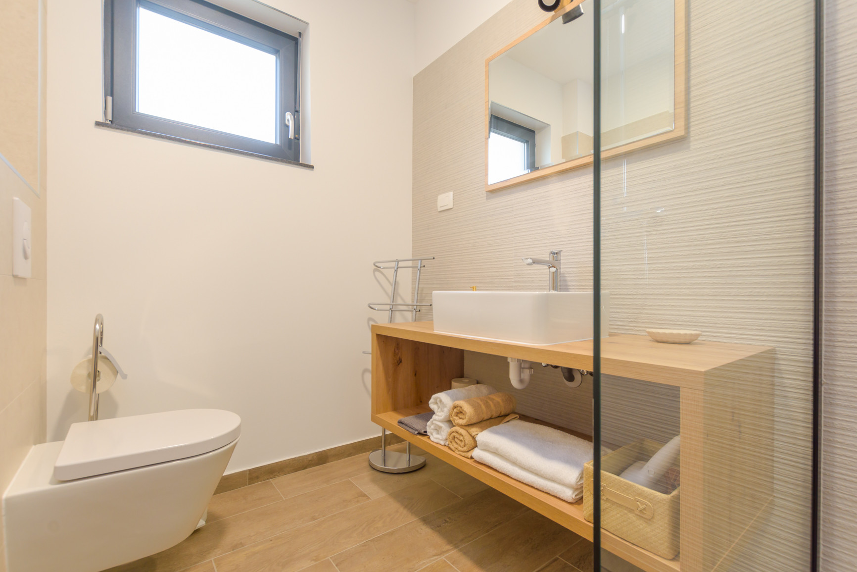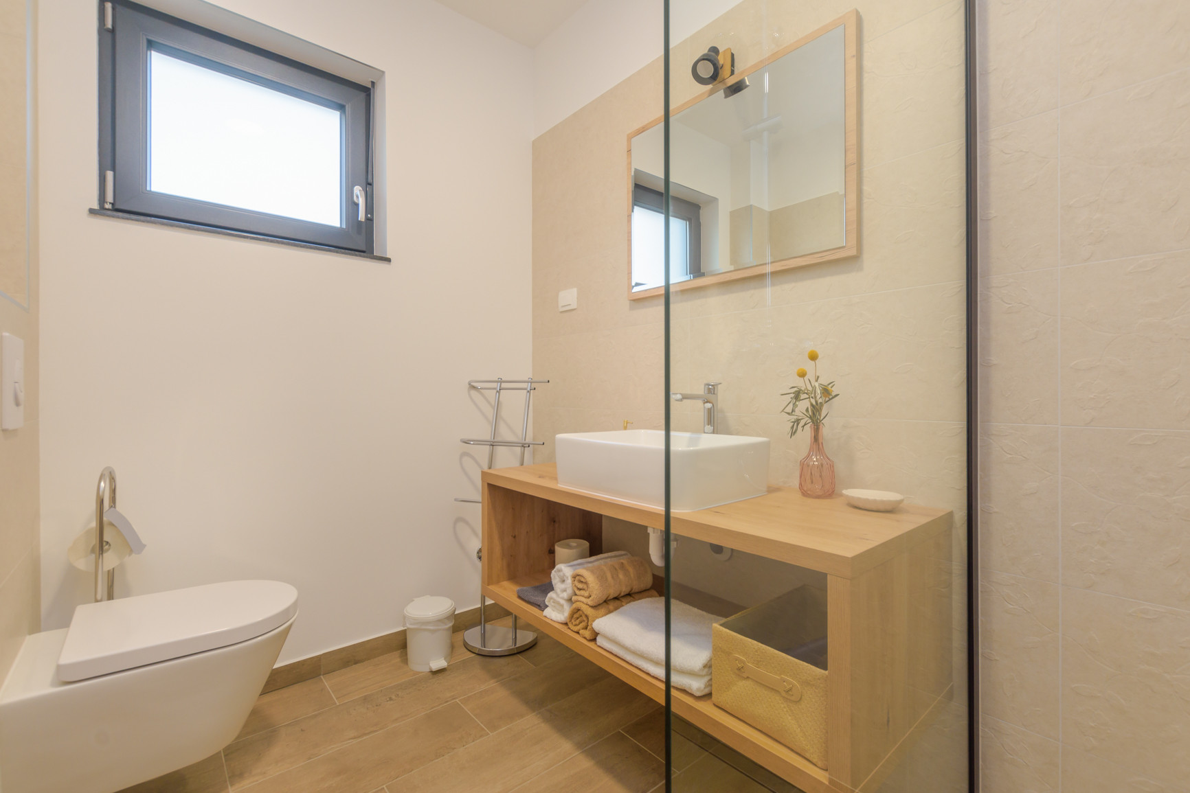 The villa offers 471 m² of interior space on a 3,700 m² private plot and comfortably accommodates up to 8 guests. It features 4 spacious bedrooms and 4 modern bathrooms with walk-in showers, one bathroom also includes a bathtub. In addition, there are 3 extra guest WCs throughout the villa. The villa is equipped with underfloor heating, ensuring comfort year-round.