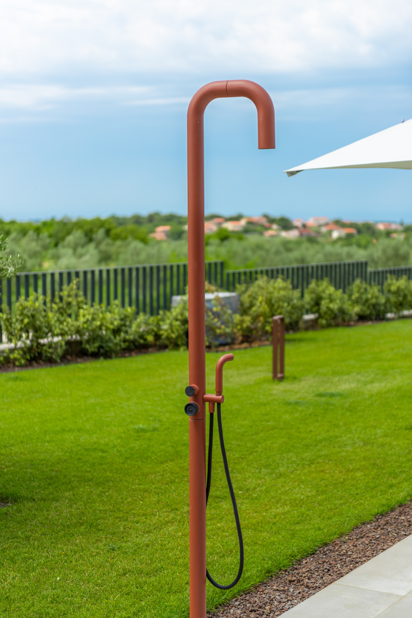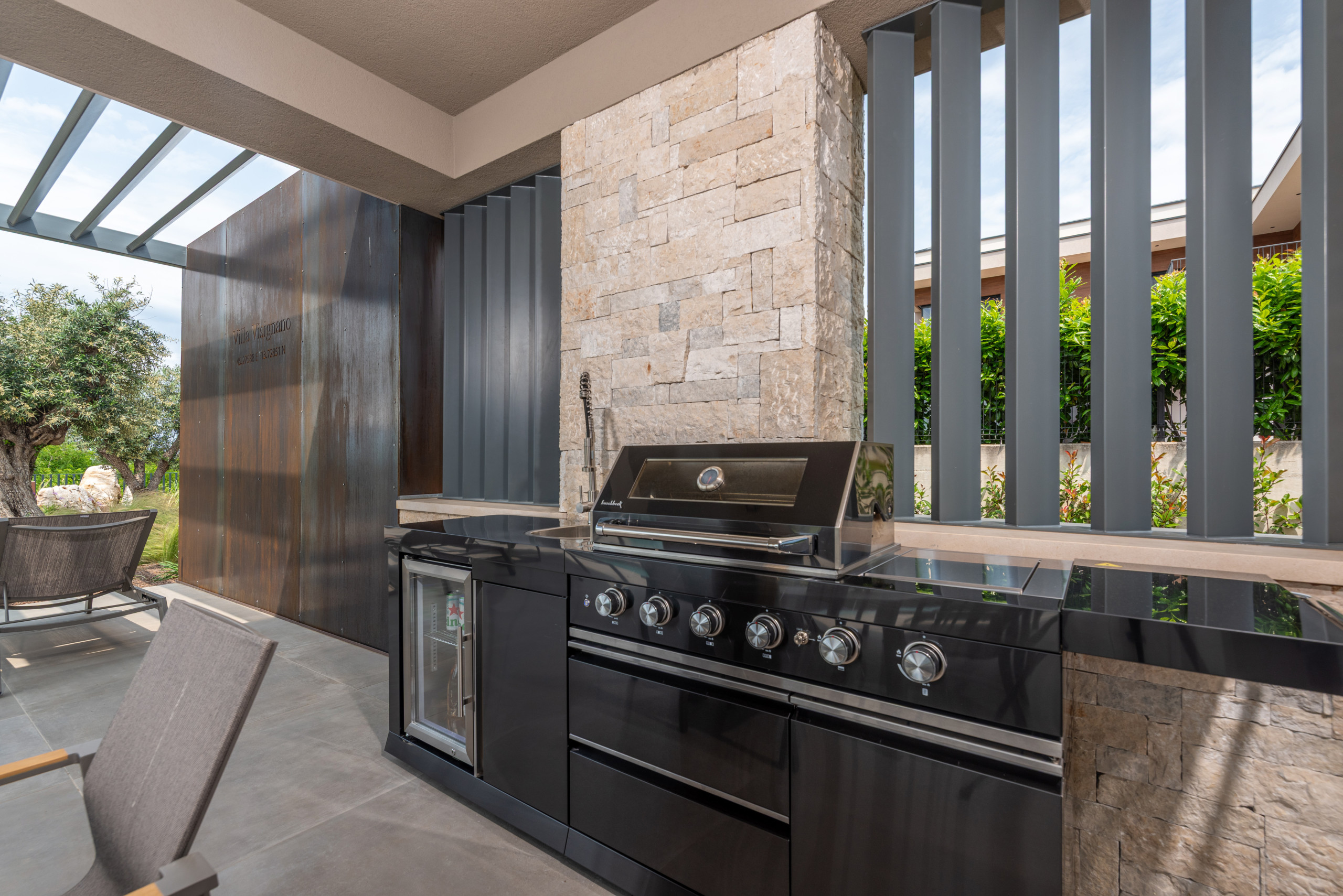 The villa also offers a wellness area with a sauna, additional WC and shower. The 49 m² heated saltwater pool invites you to swim from spring to autumn and is surrounded by a sunny terrace equipped with 8 sun loungers and 2 umbrellas. For outdoor dining, you can enjoy a fully equipped summer kitchen with a gas grill, perfect for cozy evenings under the Istrian sky.