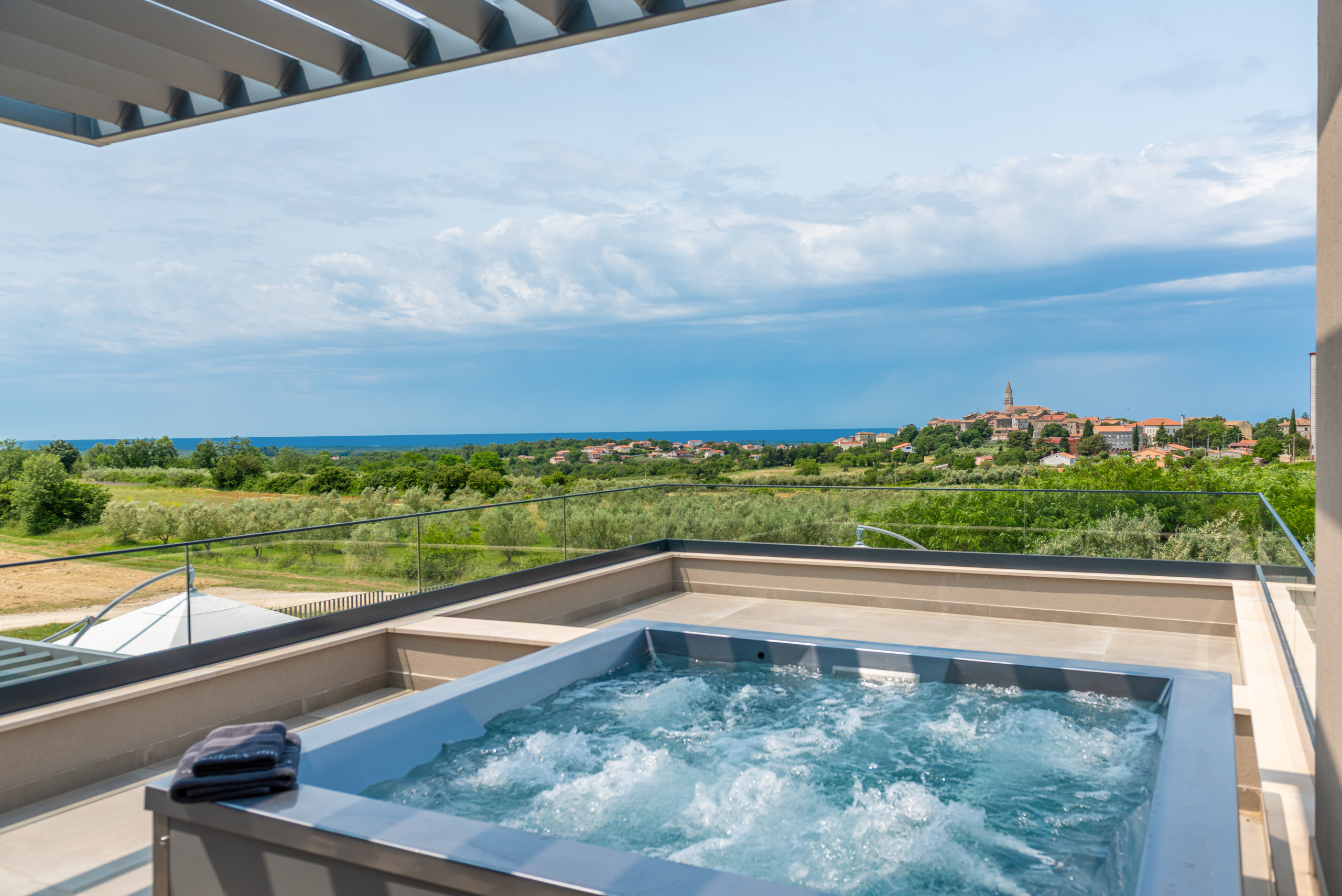 The exclusive Villa Visignano in Visnjan, just a short drive from the charming coastal town of Poreč, offers luxurious comfort across 230 m² of living space on a generous 1,144 m² property. The villa is perfect for 8 guests and features 4 elegantly furnished bedrooms, each with its own en-suite bathroom with a shower. A special highlight is the upstairs bedroom, which boasts a private balcony with a jacuzzi and stunning sea views—an ideal spot for ultimate relaxation.
