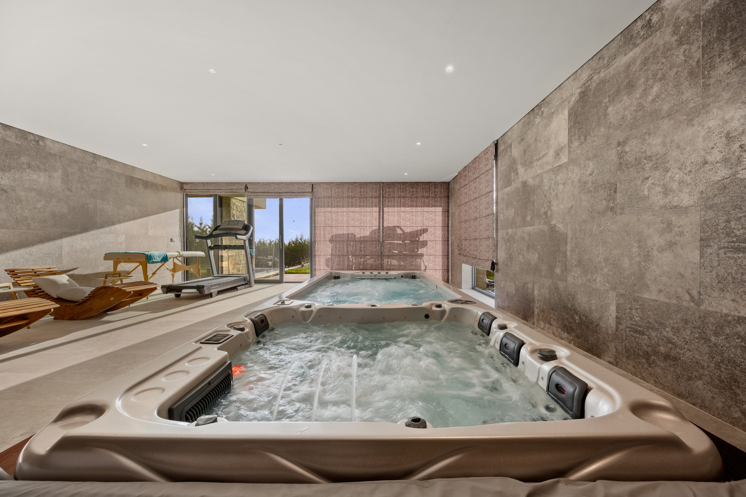 One of the main highlights is the heated pool, where you can swim and relax at any time of the year. For extra comfort, there's an outdoor jacuzzi with a stunning view of the sea. The villa also features a sauna, making it the perfect place to unwind.