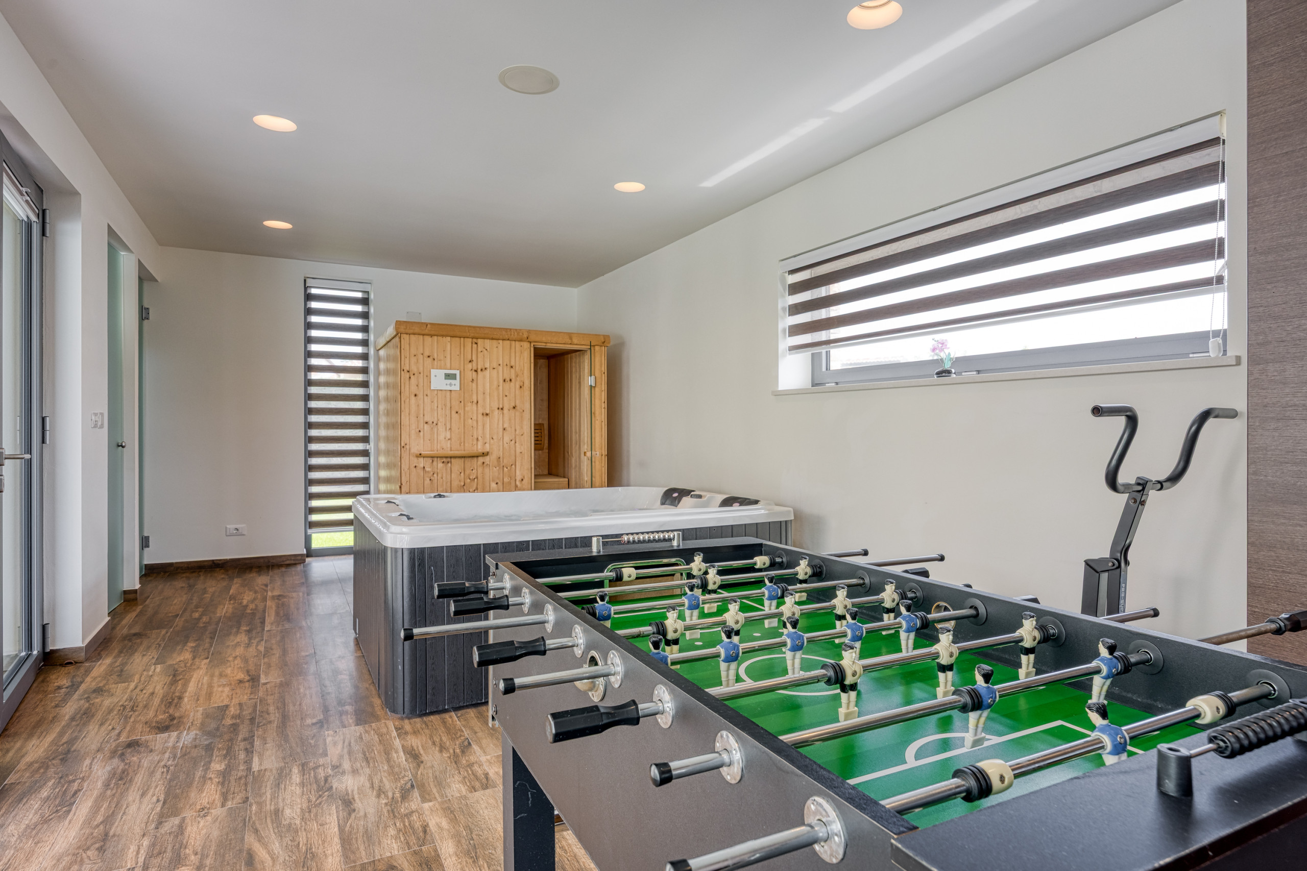 Inside the house you will also find a guest toilet, while the wellness area includes a jacuzzi, fitness equipment, and table football, as well as an additional shower and separate WC.