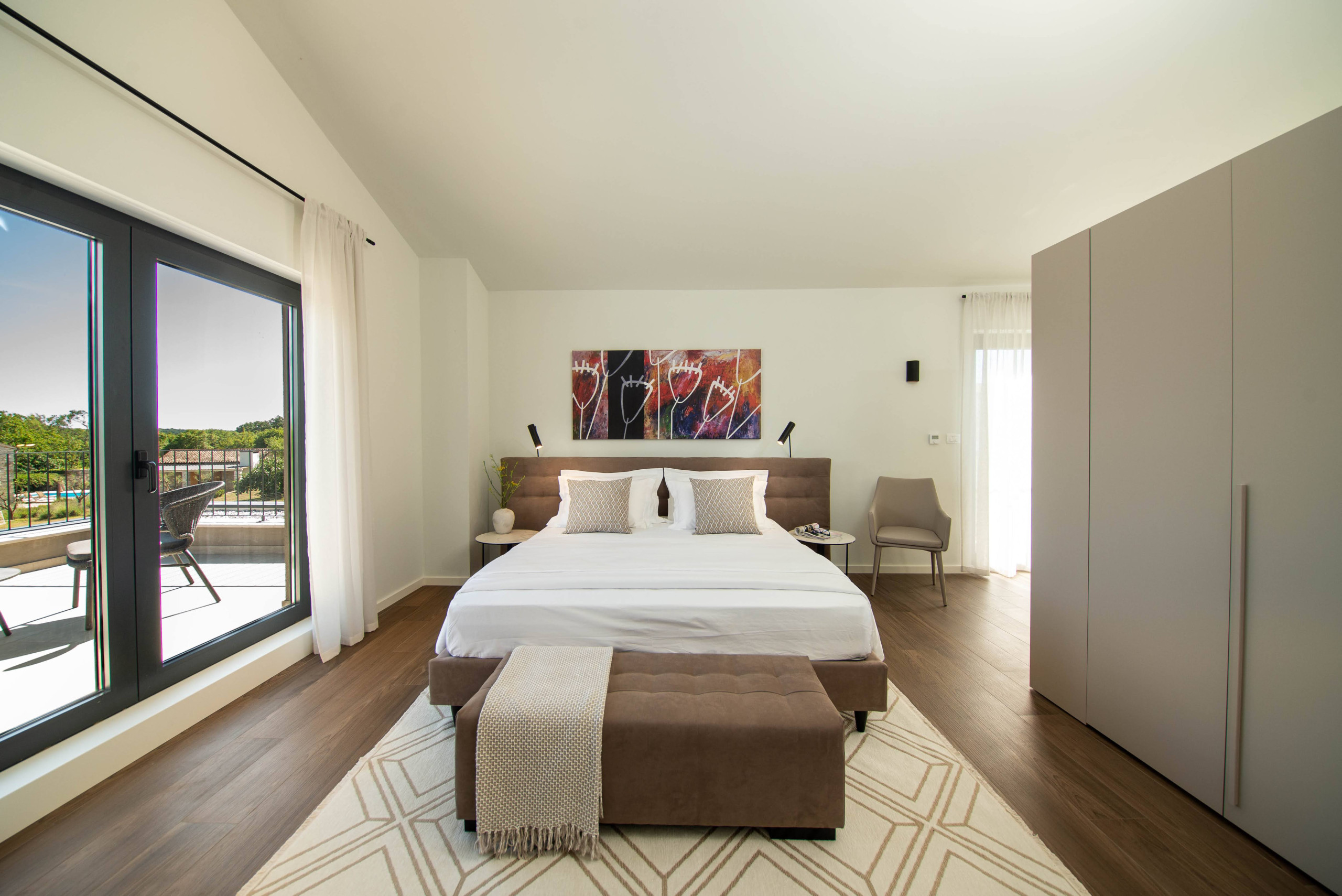 The villa offers 287 m² of living space and is set on a private 1,342 m² plot, providing comfort, space, and privacy for up to 8 guests. It features 4 spacious bedrooms, each with its own en-suite bathroom, and one bedroom also includes a stylish open-space bathtub. Three bedrooms are located on the first floor, while one bedroom is on the ground floor, which is ideal for guests who prefer easy access.