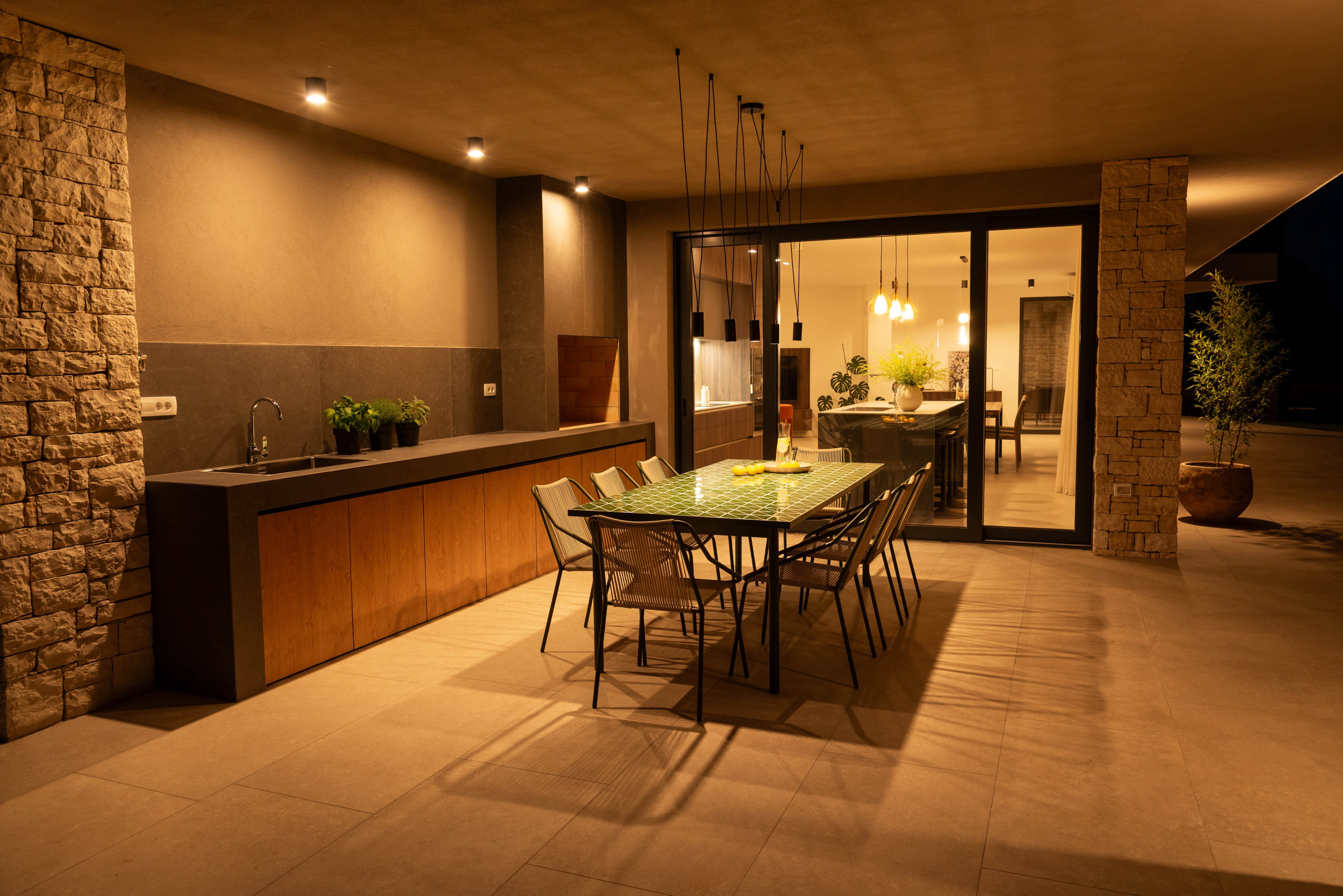 A dedicated BBQ terrace makes shared meals outdoors simple and enjoyable. Outside, private outdoor areas are designed for relaxed stays. The saltwater swimming pool is ideal for daily use, with sun loungers and shaded areas around it, while the garden feels open, calm and natural, creating a pleasant outdoor environment. Pool heating is available on request, making the house comfortable beyond the peak summer season.