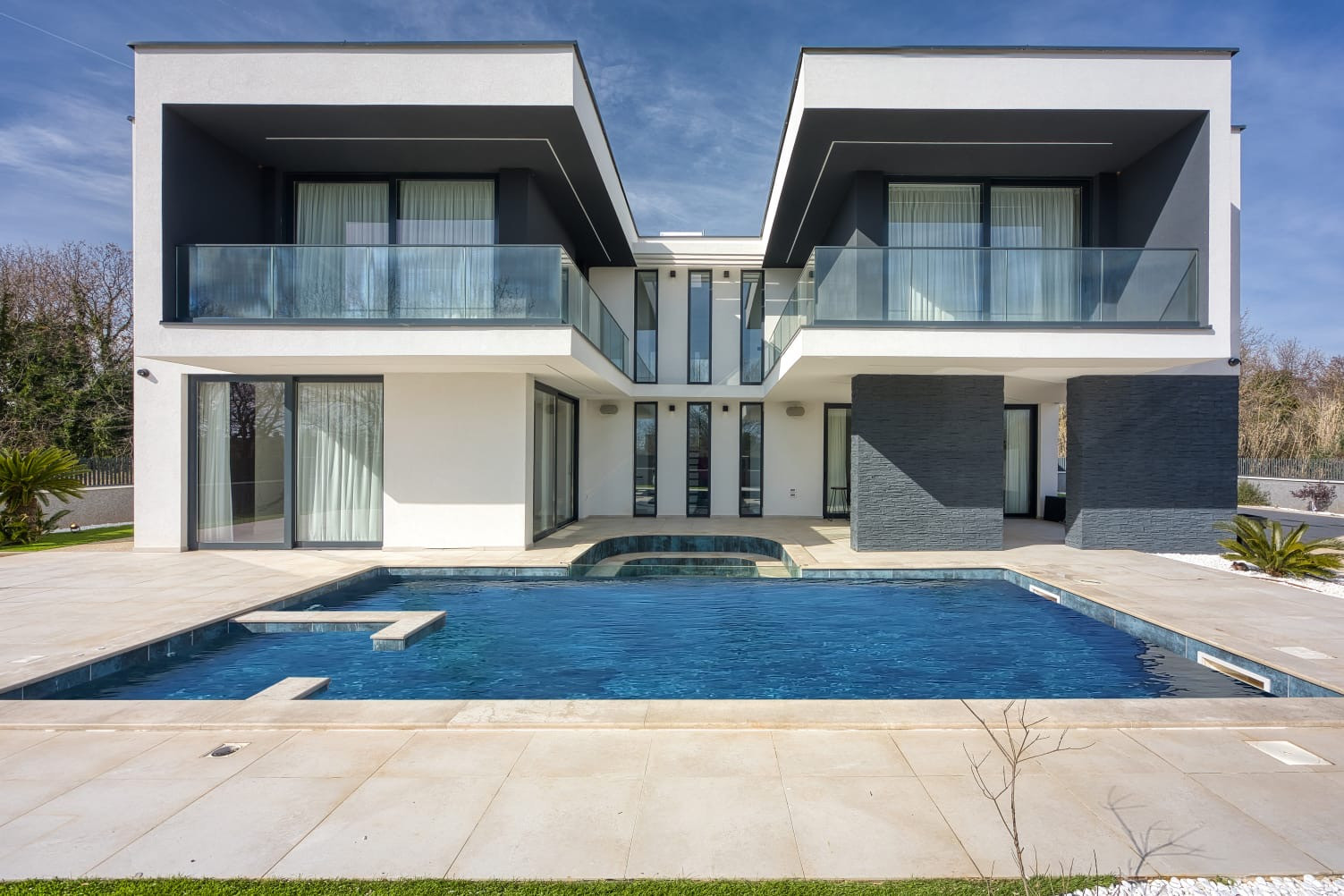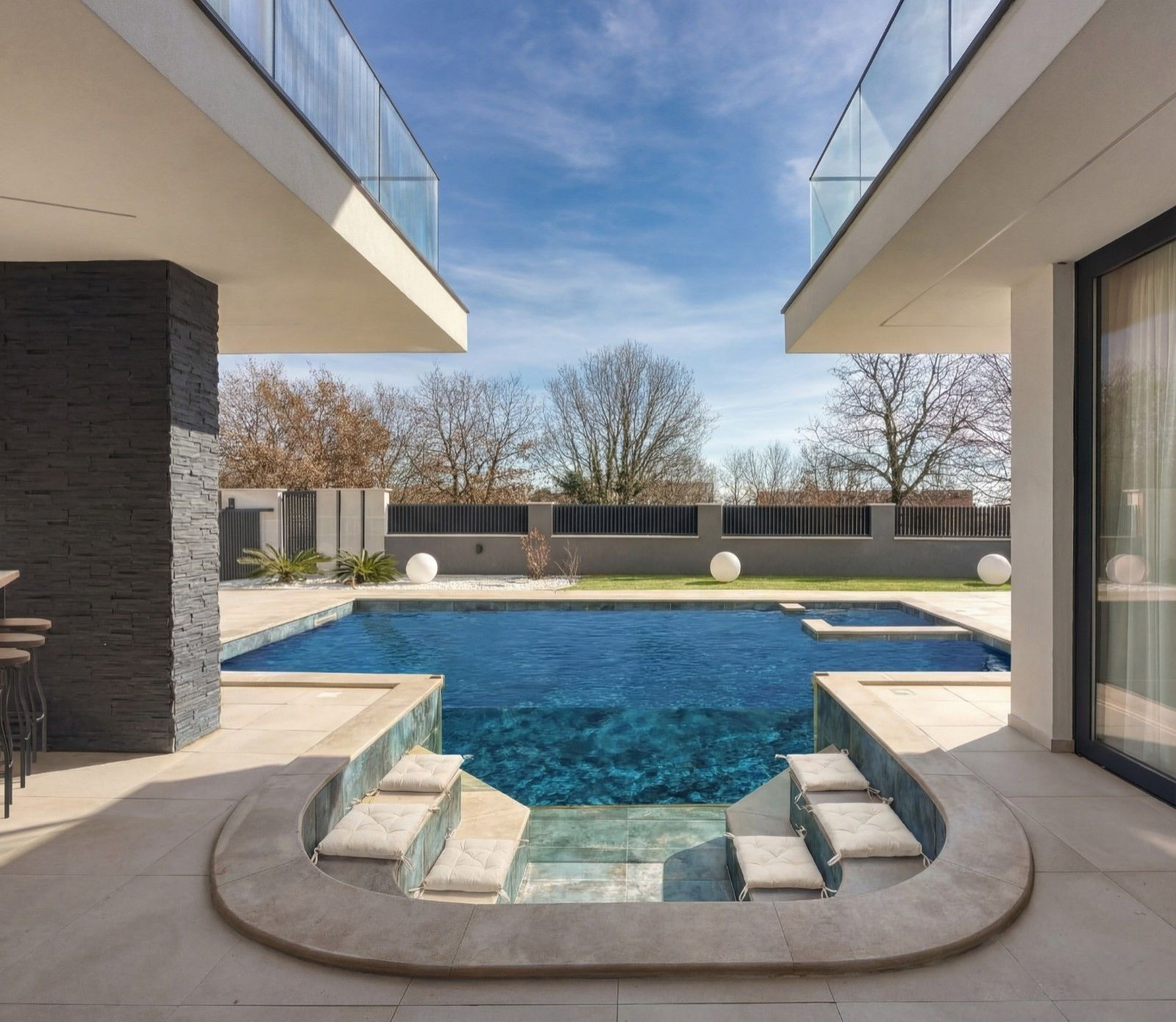 The outdoor area is designed for enjoying the sunny Istrian climate, highlighted by a generous 40 m² swimming pool with an integrated whirlpool. A unique highlight is the sunken seating lounge beside the pool, separated by a glass wall that offers a direct view into the pool, creating a stylish and relaxing atmosphere. Eight sun loungers invite you to unwind by the water, while the fully equipped outdoor kitchen with a gas grill and a large outdoor dining table provides the perfect setting for long summer dinners with family or friends.