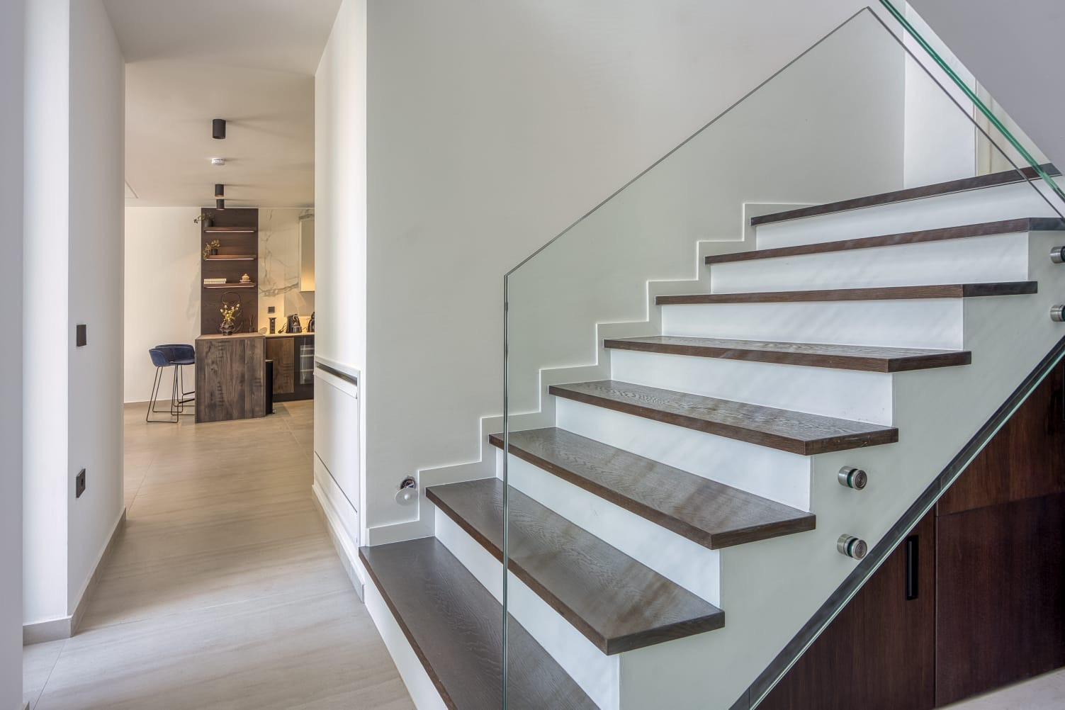 The villa accommodates up to 8 guests and features 4 elegant bedrooms on the first floor, each furnished with a double bed and a private en-suite bathroom with a shower, ensuring comfort and privacy for every guest. On the ground floor there is an additional separate guest WC.