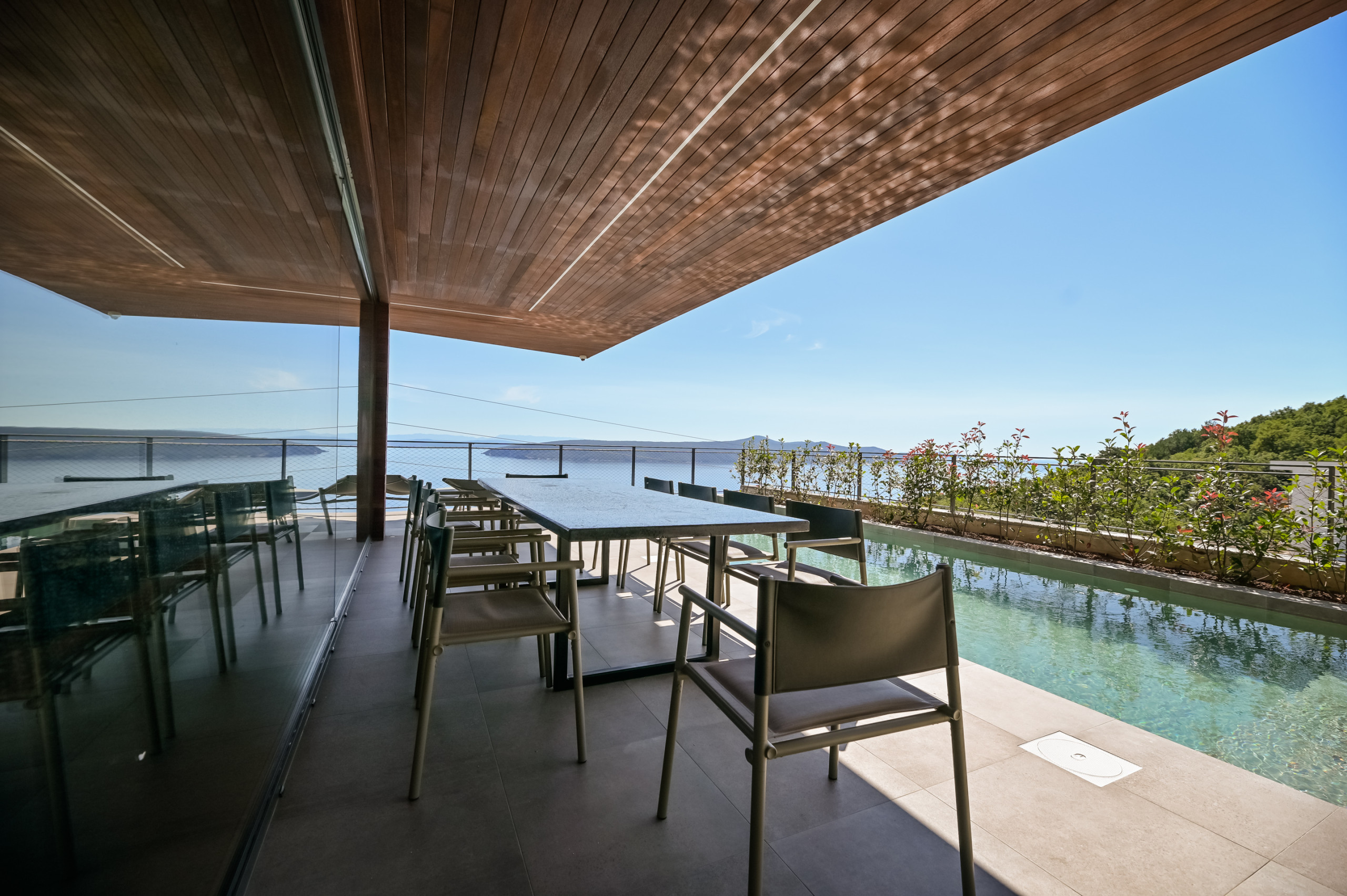 Guests can indulge in the private wellness area, featuring a jacuzzi, sauna, two loungers, a shower, and a WC. A fully equipped fitness room is also available. The villa offers panoramic sea views from every room, creating a serene and relaxing atmosphere throughout your stay. Underfloor heating provides additional warmth, making the villa perfect for stays outside the main season.