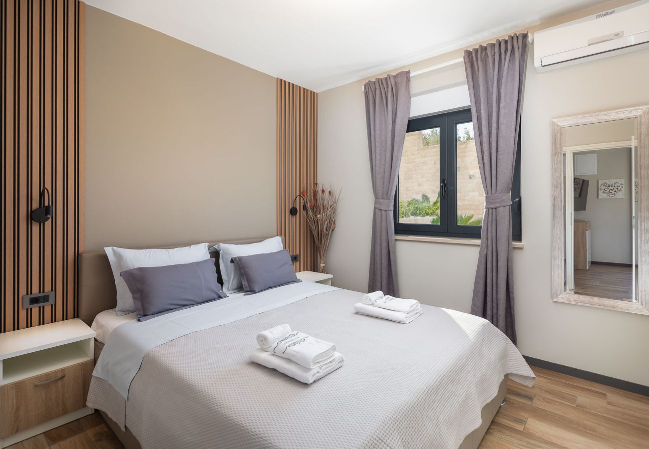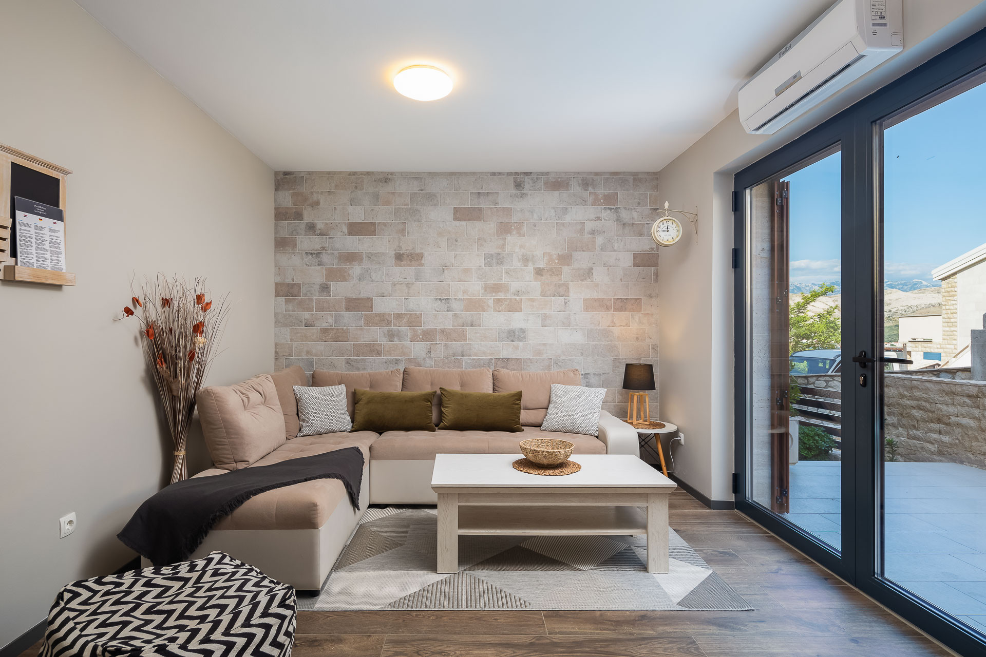 Villa Emma is located on the beautiful island of Pag. It offers a lot of space for up to 14 people and is ideal for families or larger groups. The wonderful sea view invites you to simply enjoy your time here and now and let yourself be pampered to the full. The villa is divided into three residential units, which can only be booked as single use and as a whole unit. On the ground floor there is the living and dining area with a kitchen and a bathroom. You can also bring your dogs with you, at additional charge.
