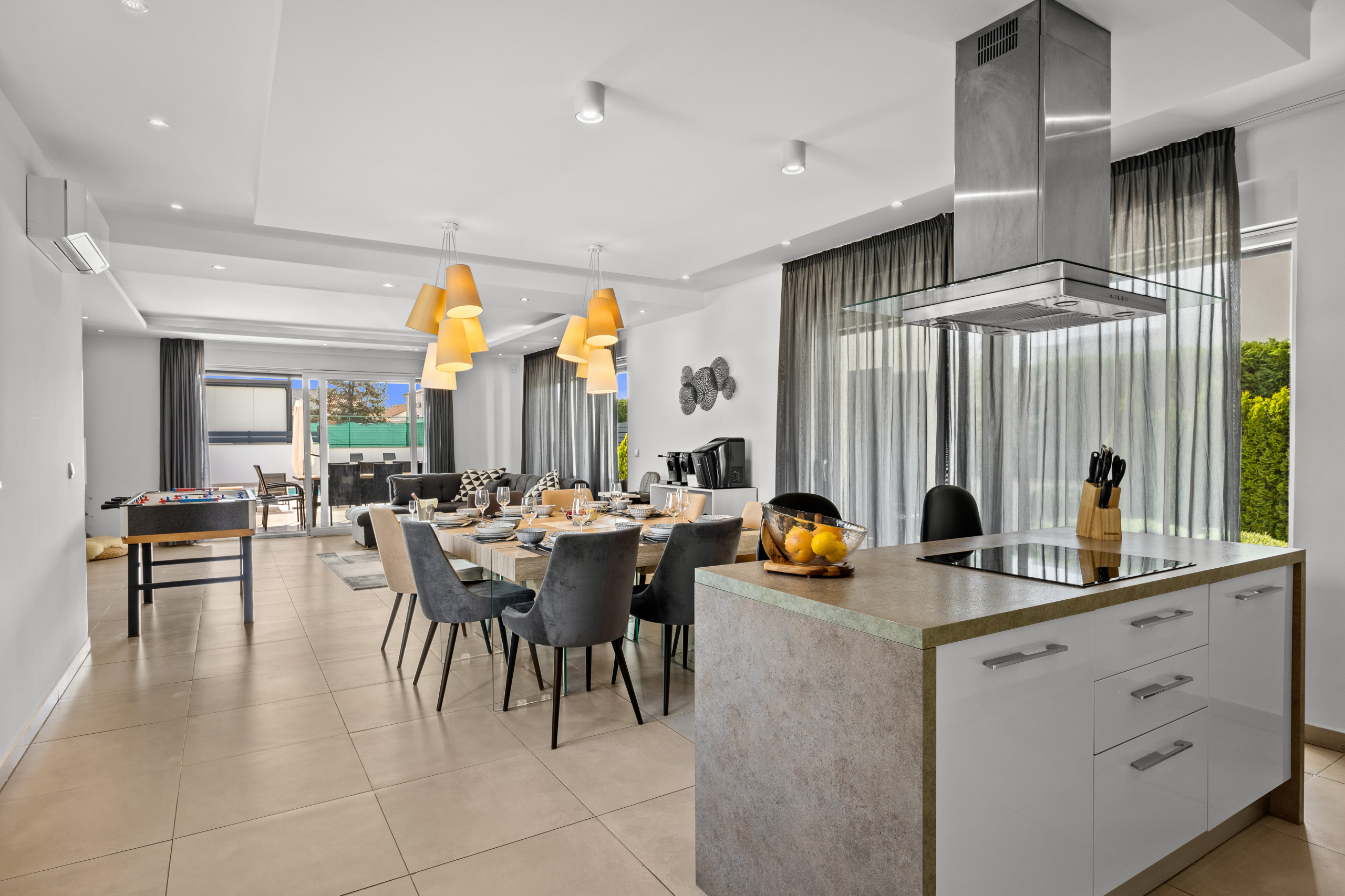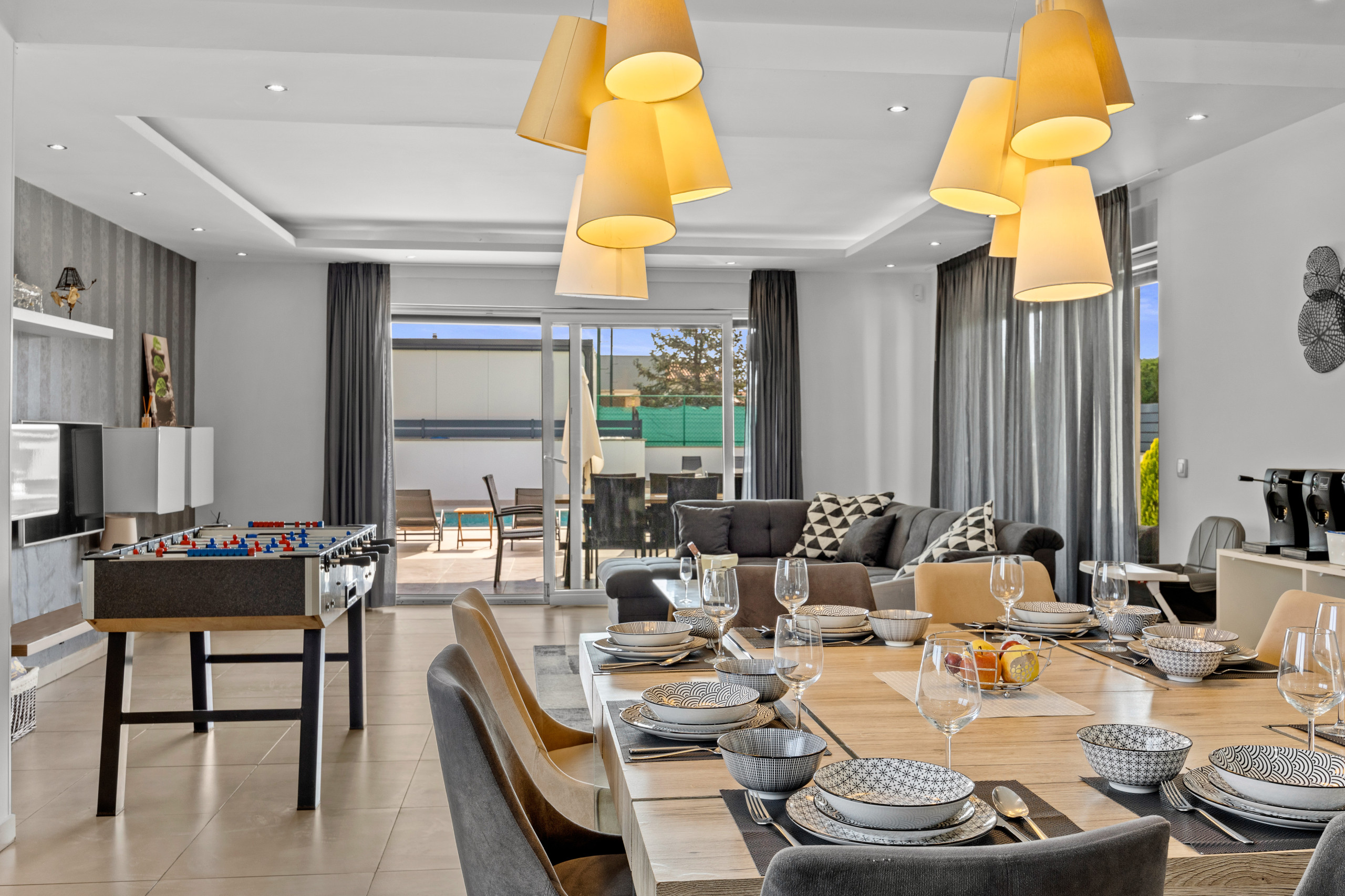 A covered dining area offers the opportunity to dine outdoors and enjoy cozy evenings with friends and family. The villa also features various entertainment options, including a pool table and table football, as well as a comfortable lounge area. Outdoors, guests can also enjoy a private tennis court and a basketball hoop.