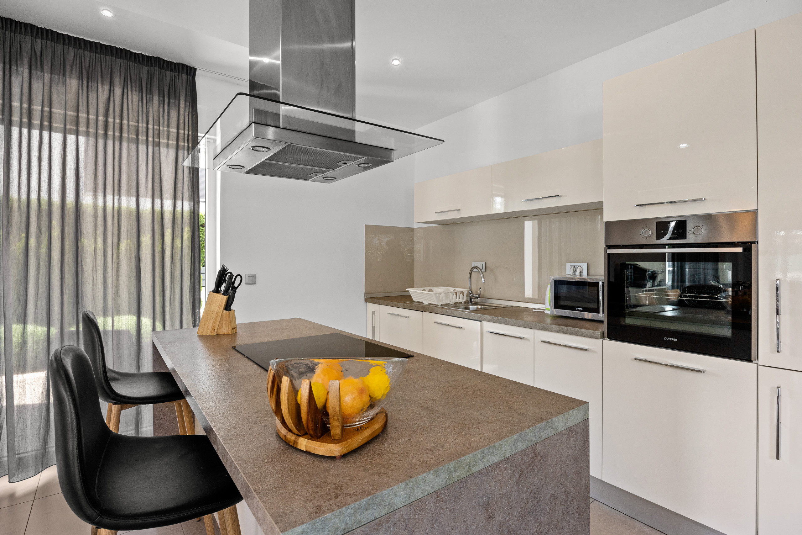 Inside the villa there is an elegant open-plan ground floor with a living/dining area and kitchen, a double bedroom with an en-suite bathroom, and a guest toilet. From here you have direct access to the beautiful pool.